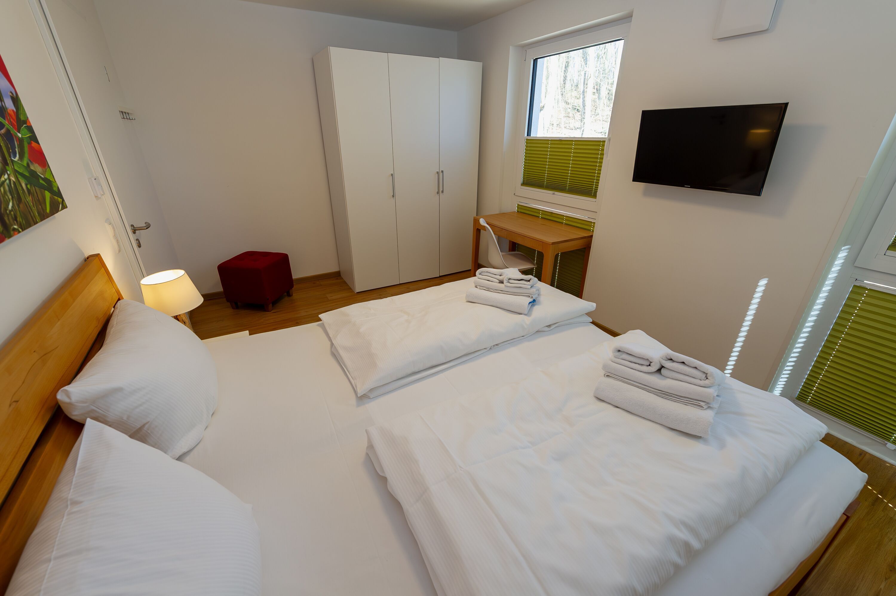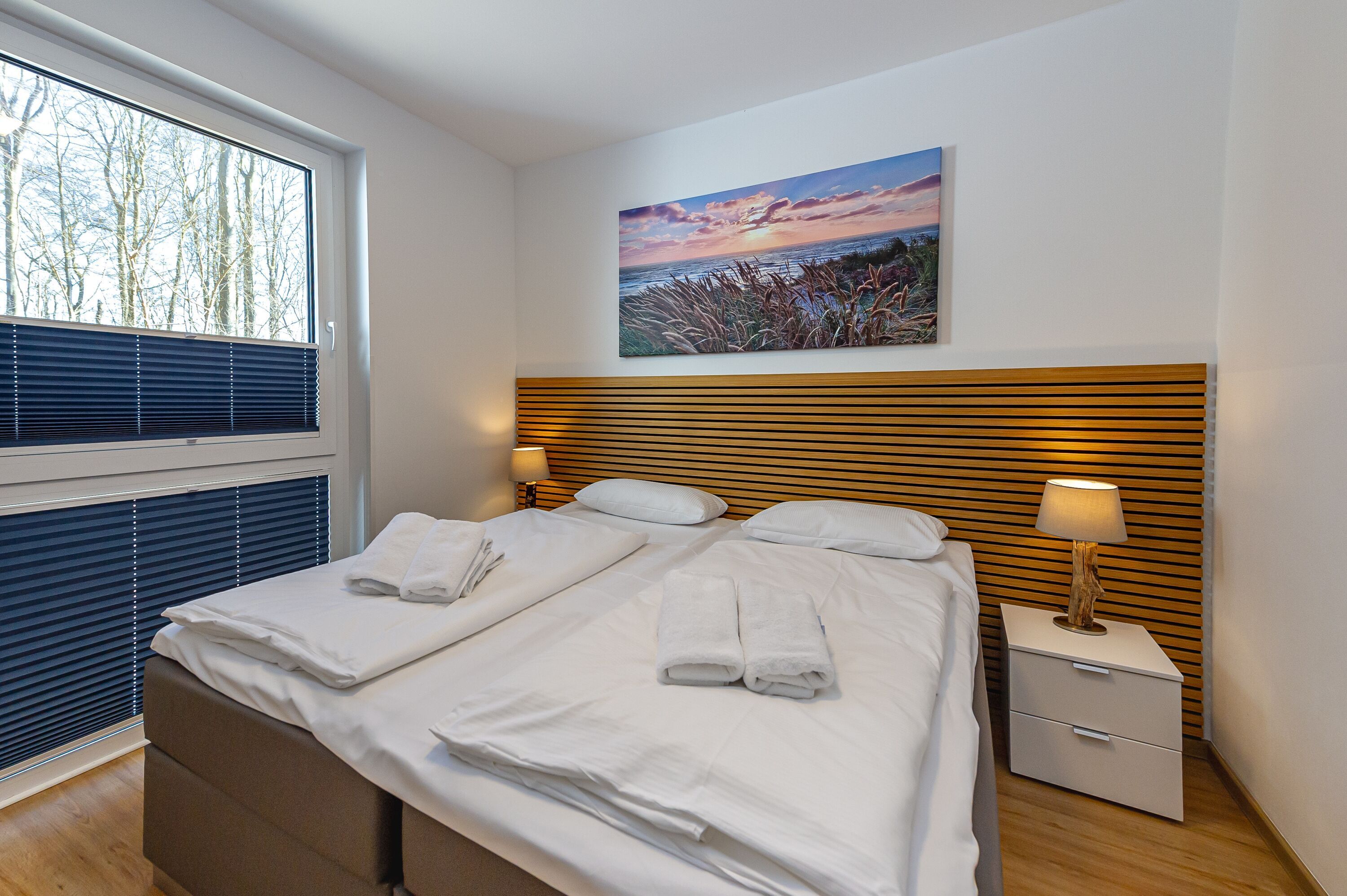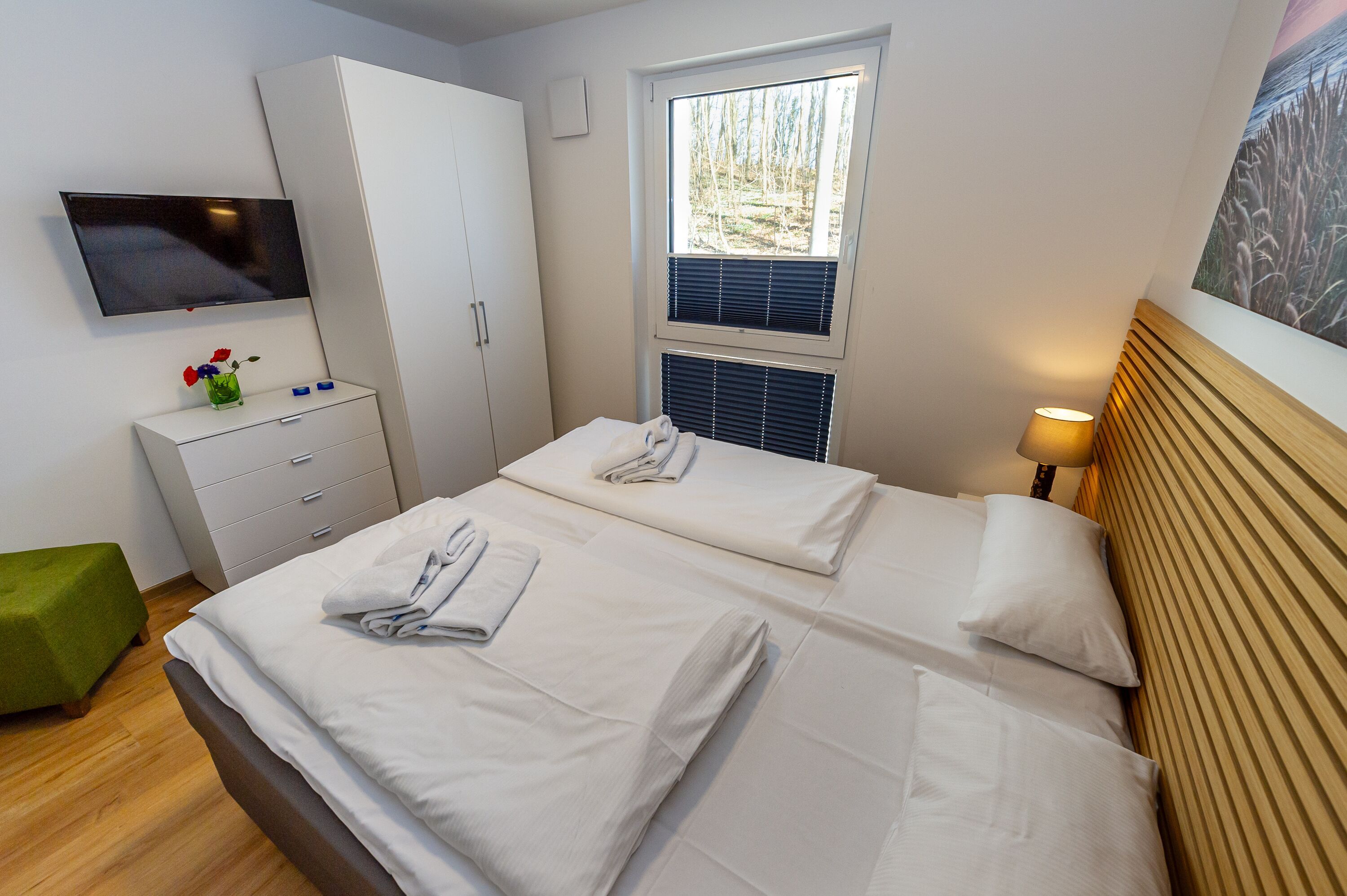 Ihre beiden Schlafzimmer sind mit wunderbar bequemen Betten (1,80x2,00m), geräumigen Kleiderschränken und zusätzlichen 32 Smart-TVs ausgestattet. Die Boxspringbetten im kleinen Schlafzimmer können entweder als Einzelbetten gestellt werden oder als Doppelbett.
