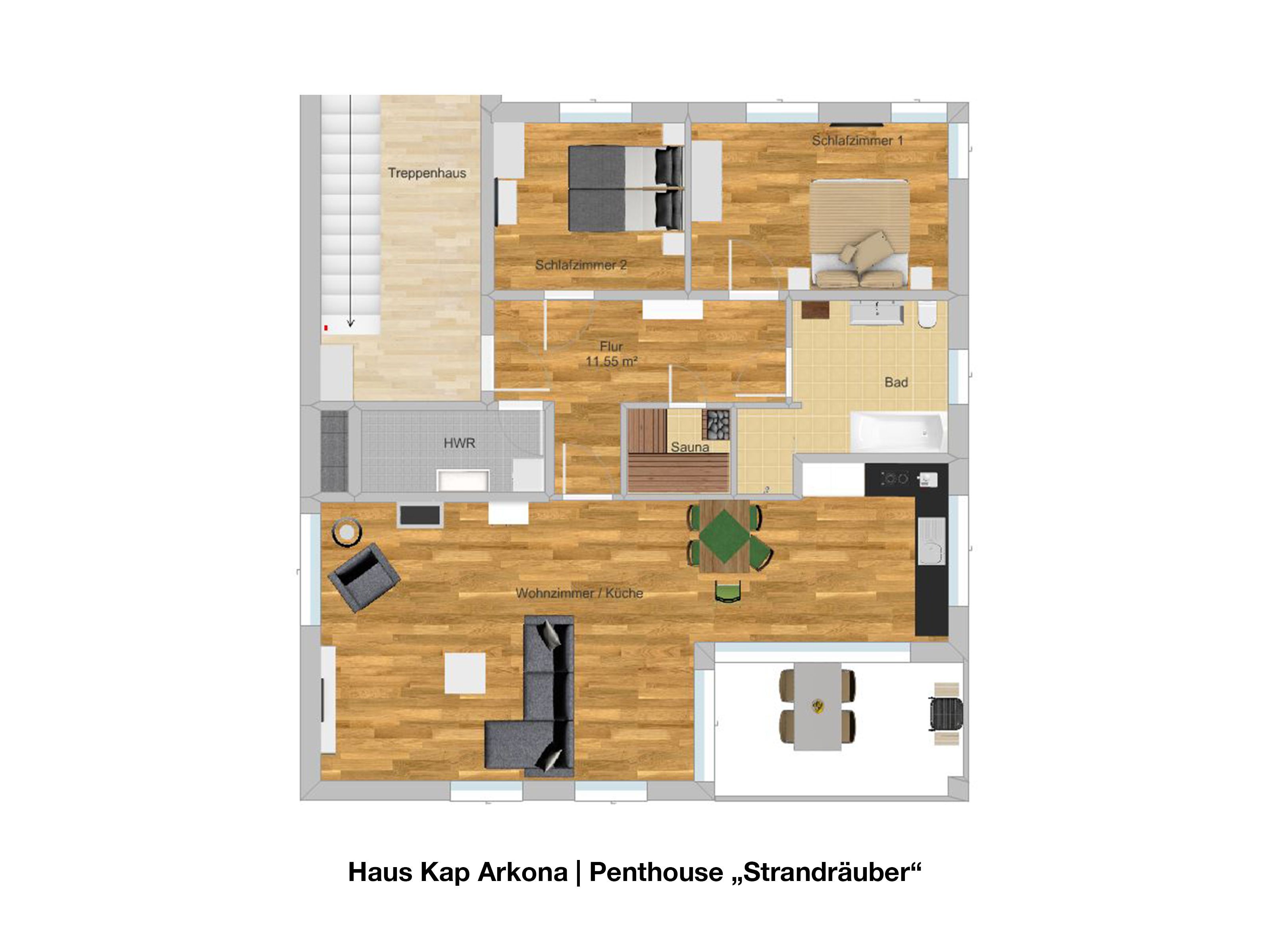 Der Strandräuber begrüßt Sie im Obergeschoss des Hauses Kap Arkona und präsentiert sich als ein wunderbar gemütliches und überaus komfortables 3-Zimmer-Appartement mit gut 100 qm Wohnfläche.