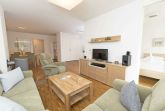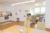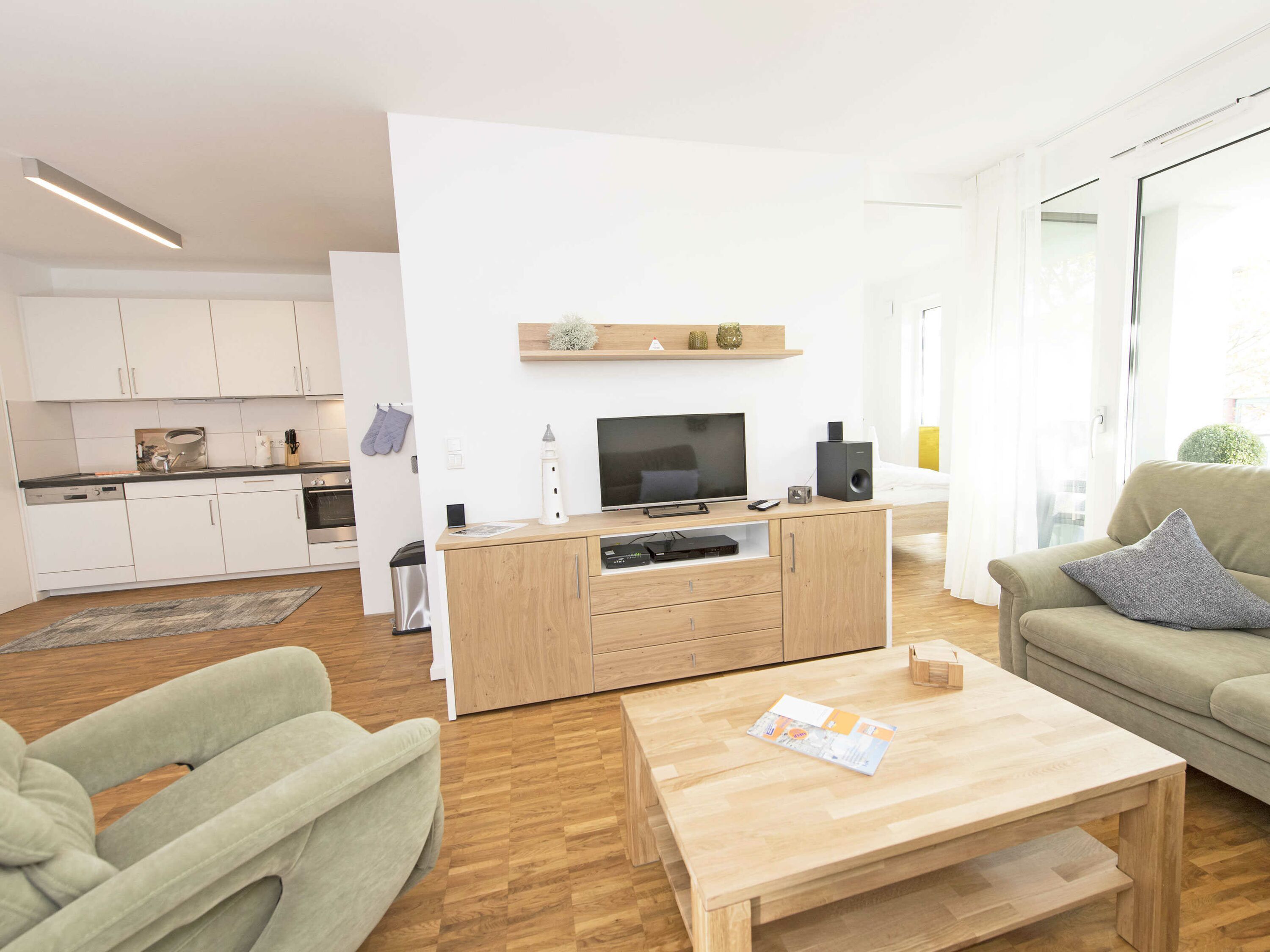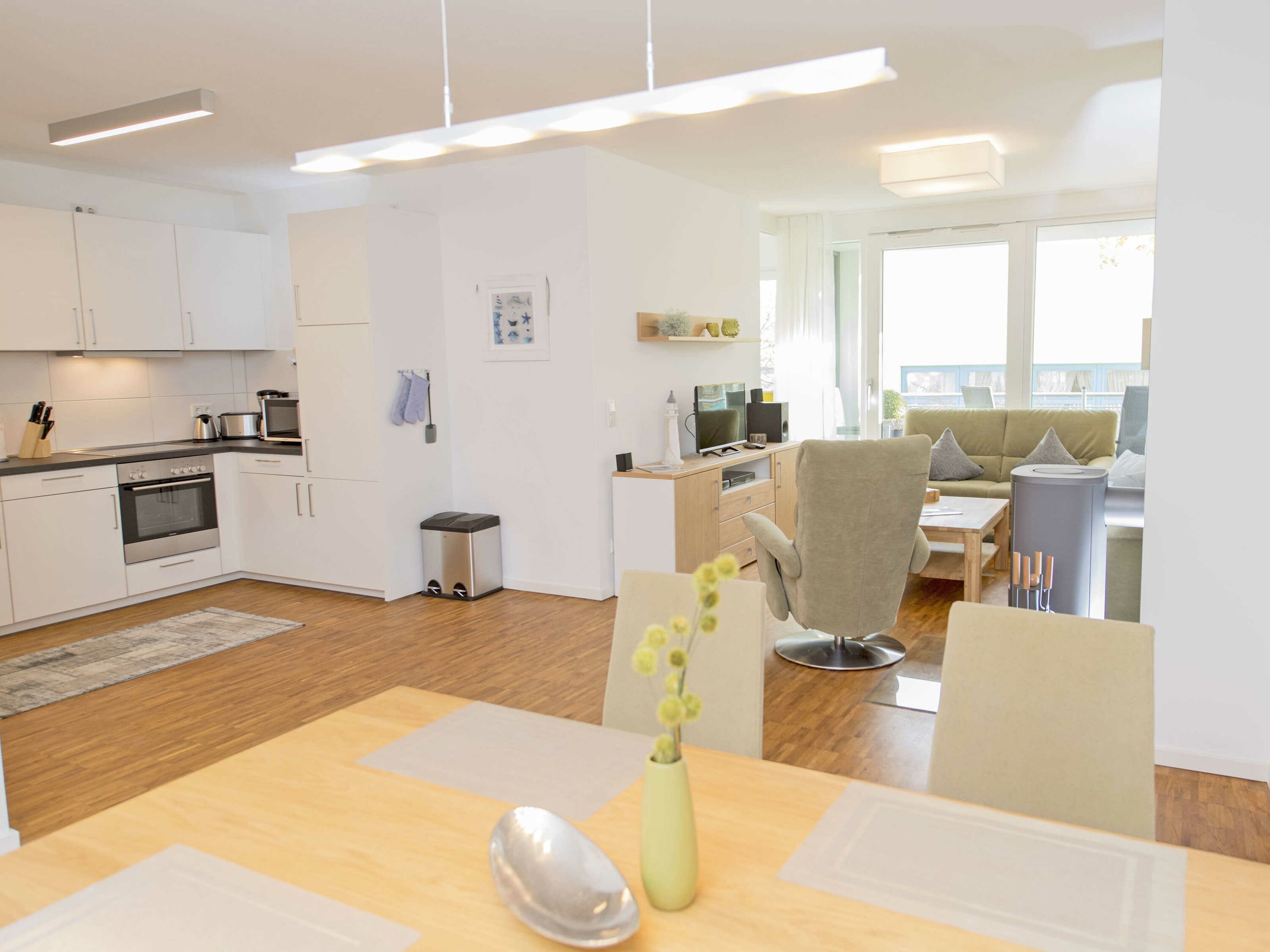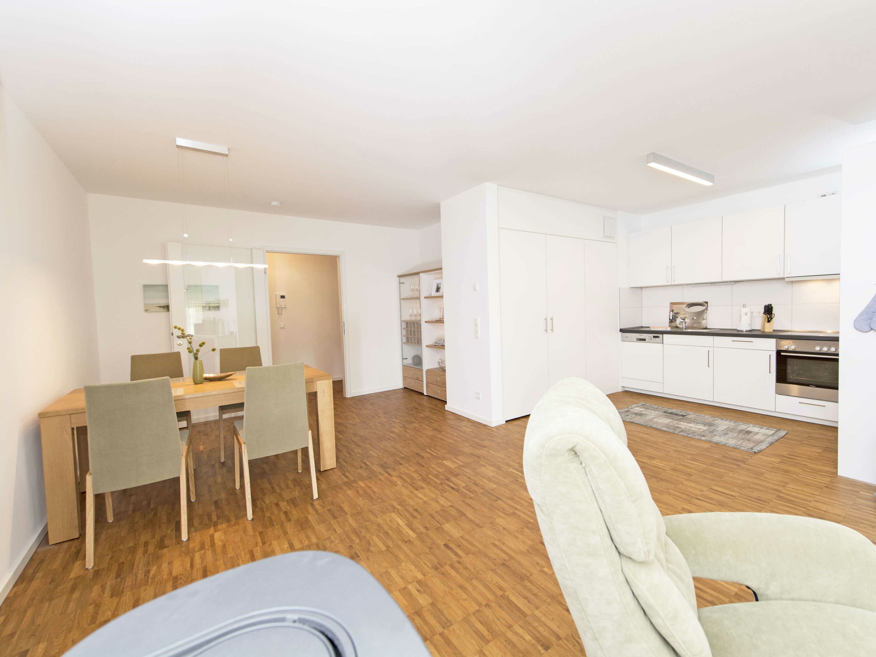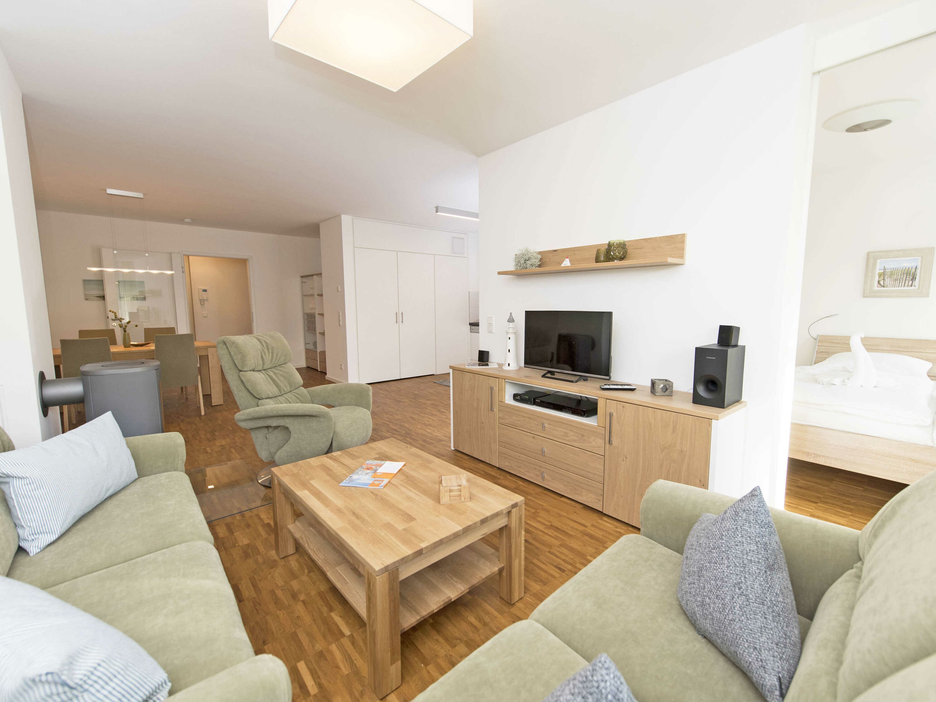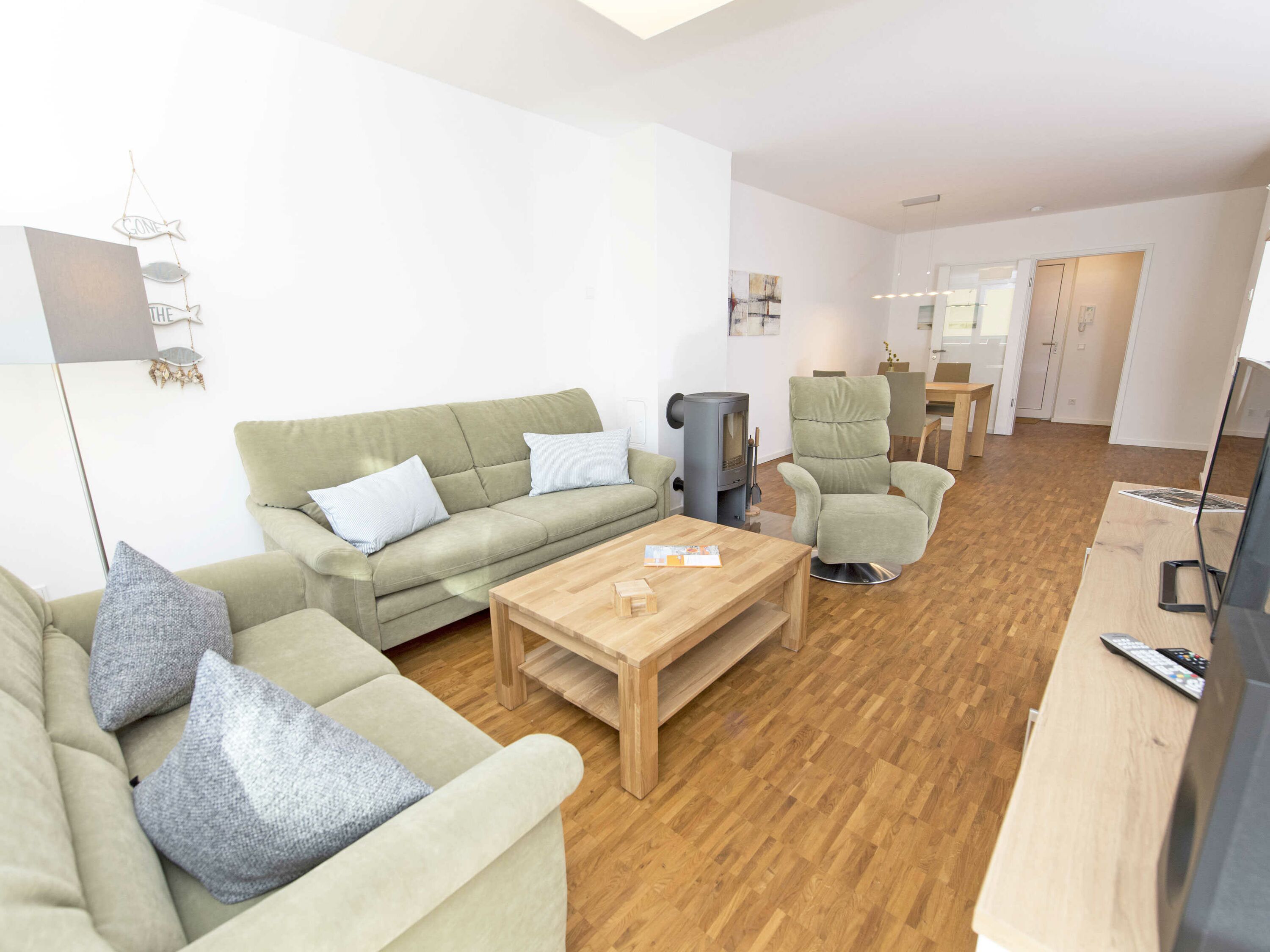 Vom Eingangsbereich aus gelangen Sie in den hellen und modern ausgestatteten Wohnbereich mit Couchgarnitur (Aufbettungsmöglichkeit für zwei Personen), Flachbild-TV, Stereoanlage und BluRay-Player sowie einem Essplatz für vier Personen und der integrierten Küchenzeile. An kühleren Tagen sorgt das prasselnde Feuer des Kaminofens für behagliche Stimmung.