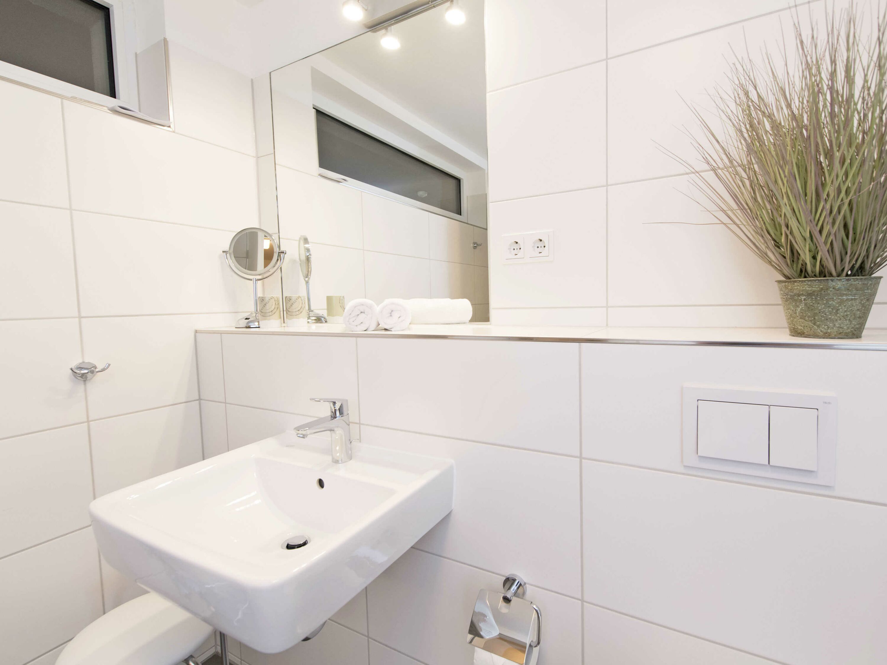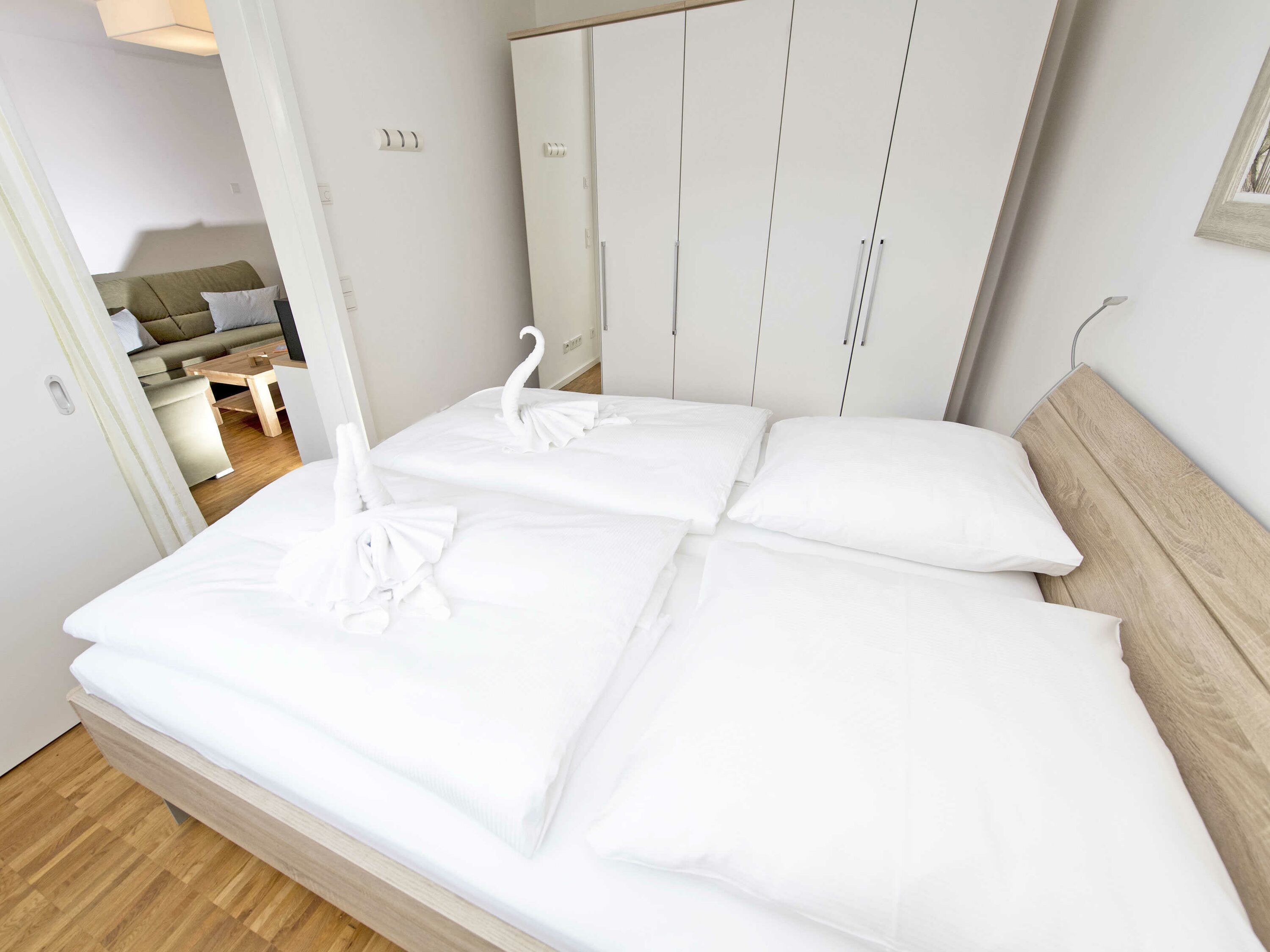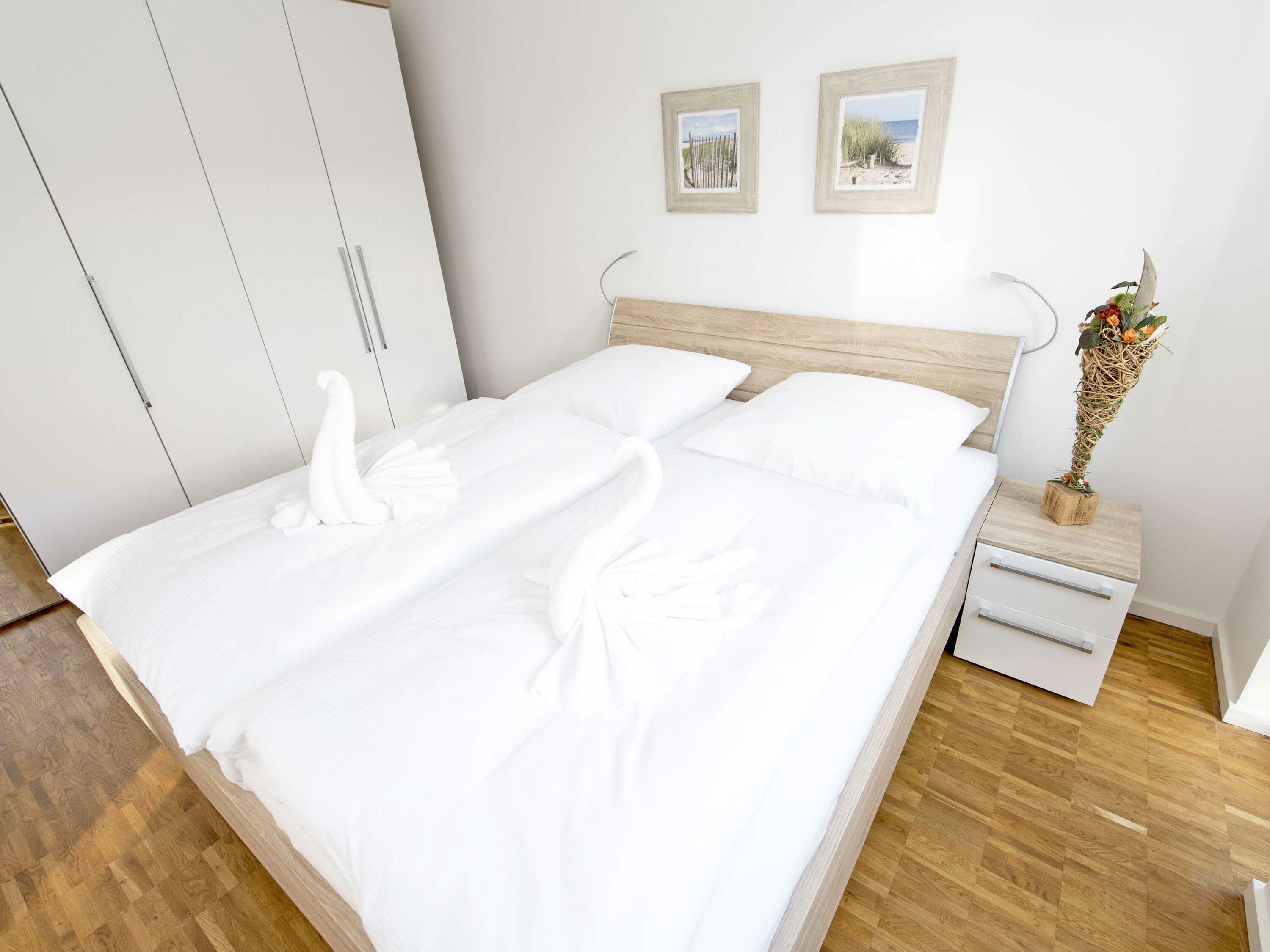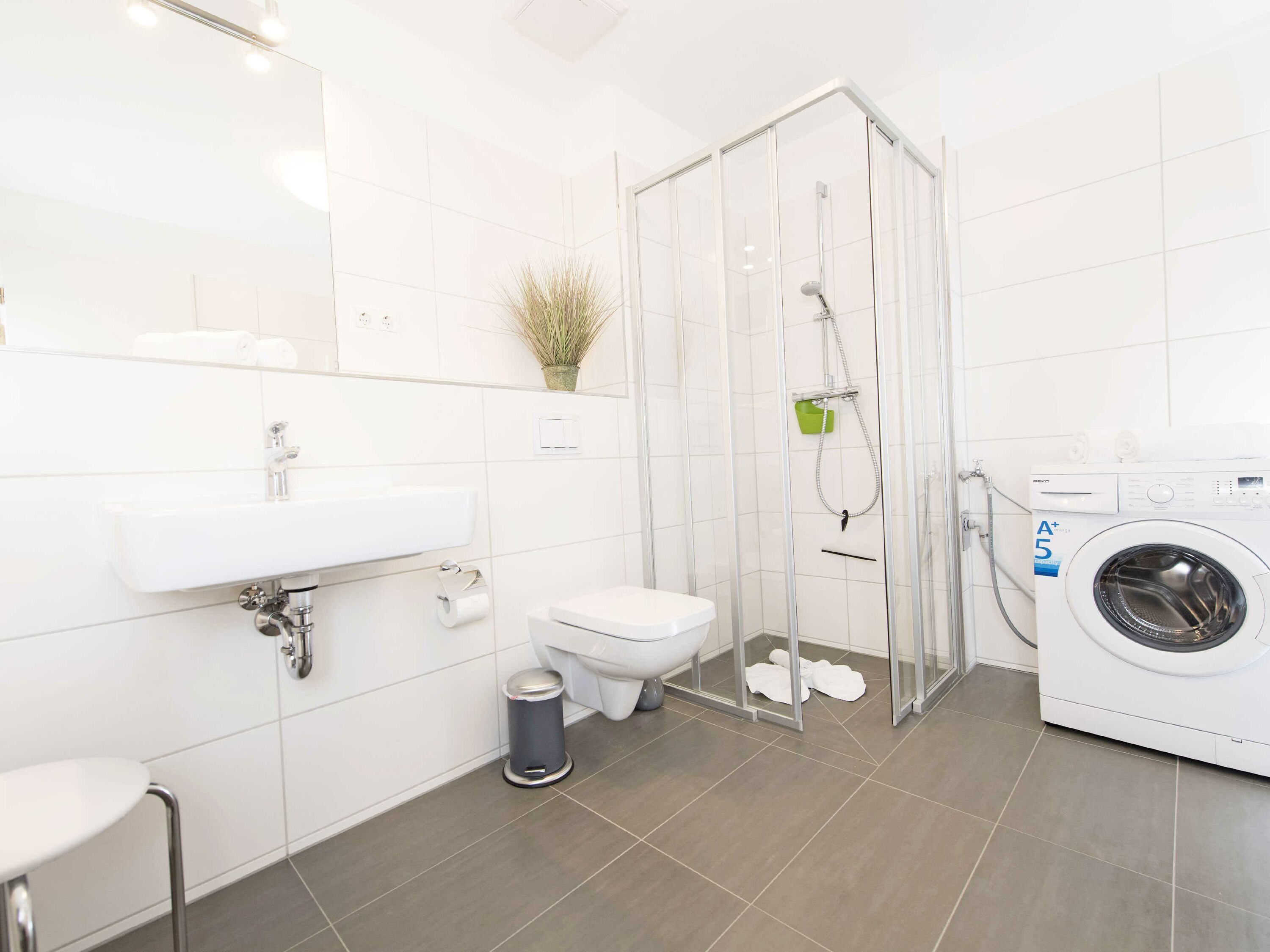Das Schlafzimmer ist mit einem Doppelbett (1,80 x 2,00 m) ausgestattet. Die Wohnung verfügt weiterhin über ein modern gefliestes Bad mit bodengleicher Dusche sowie einer eigenen Waschmaschine, die Sie kostenfrei nutzen können. Bügelbrett und Bügeleisen sind ebenfalls vorhanden.