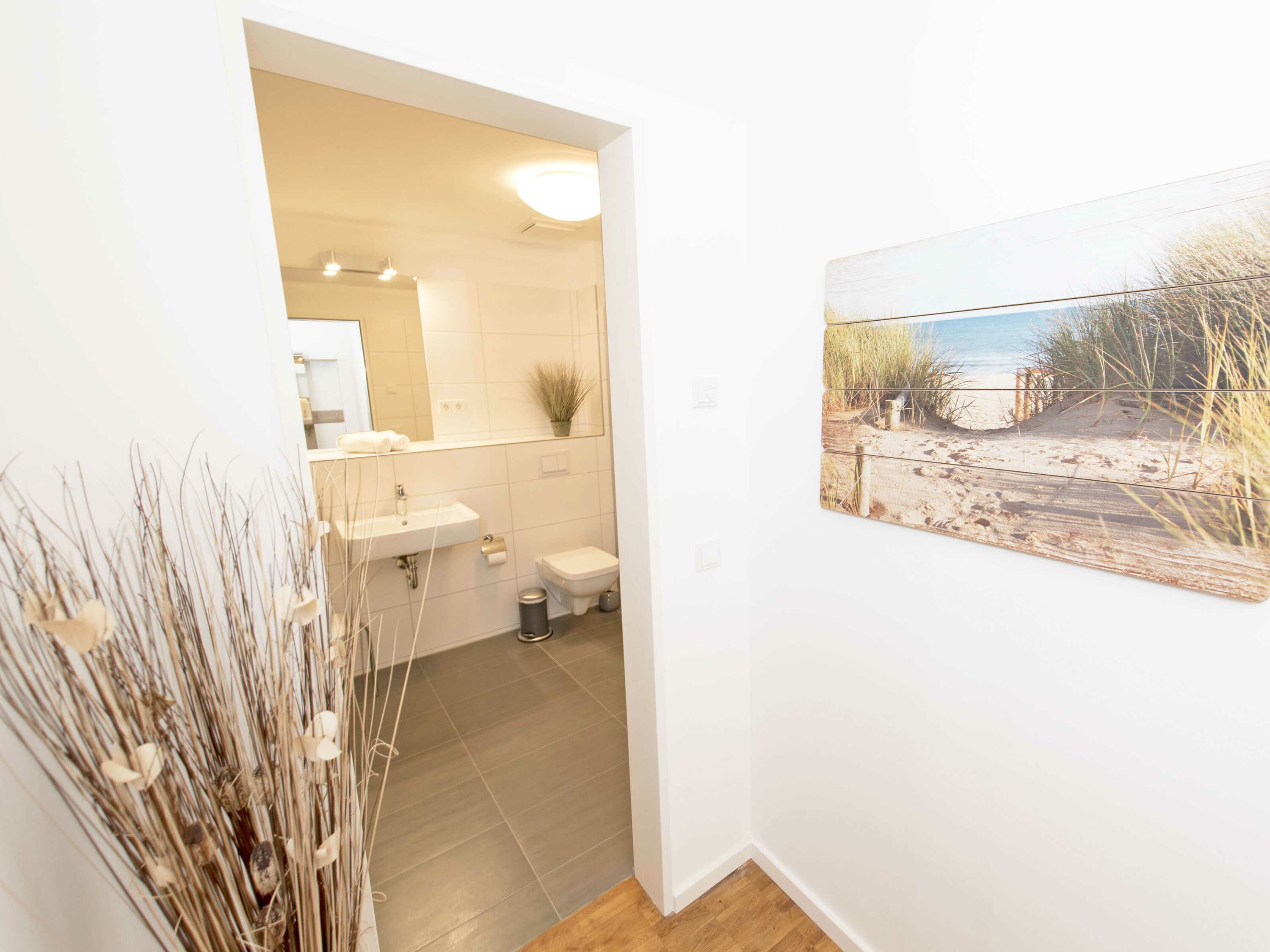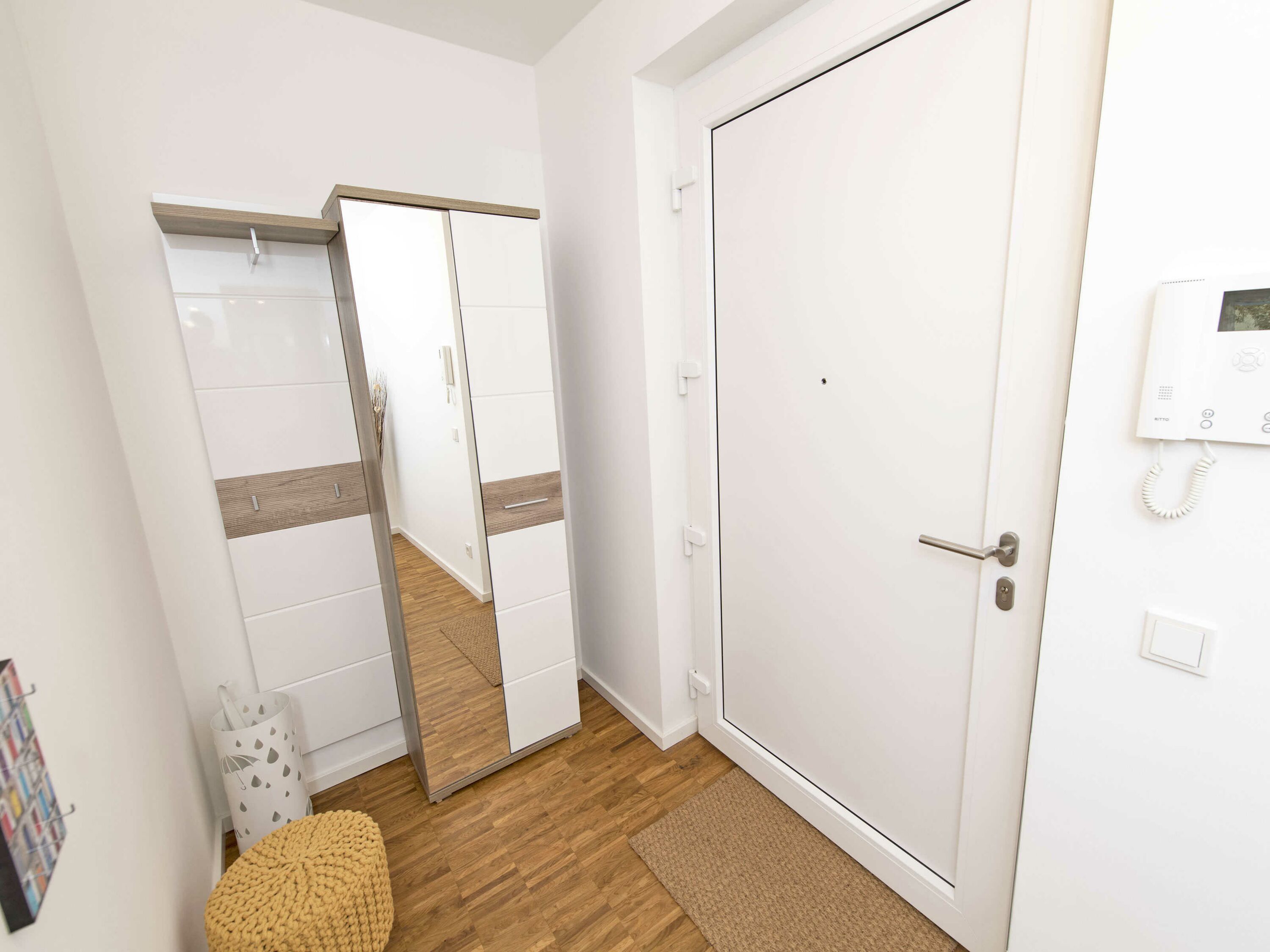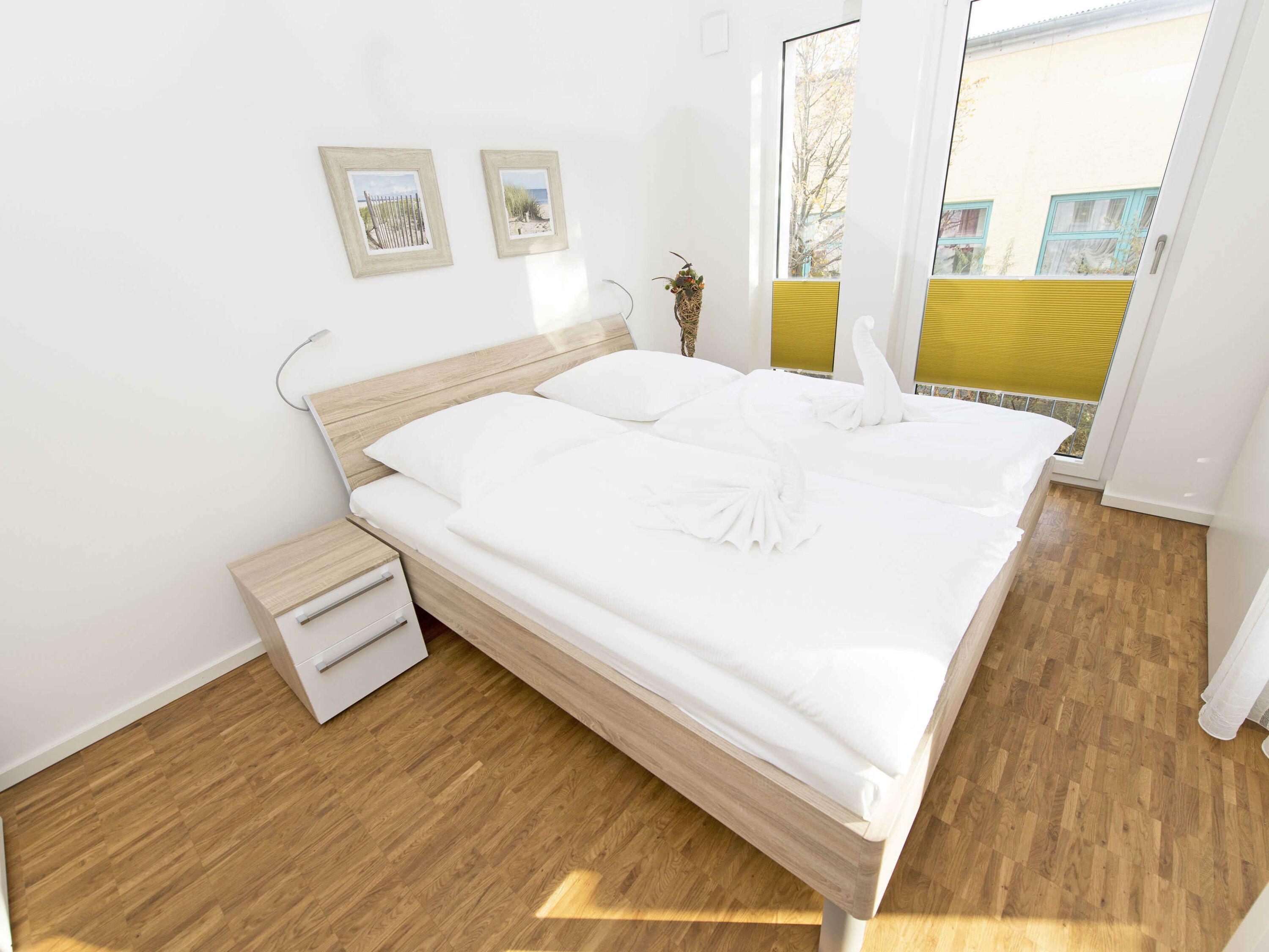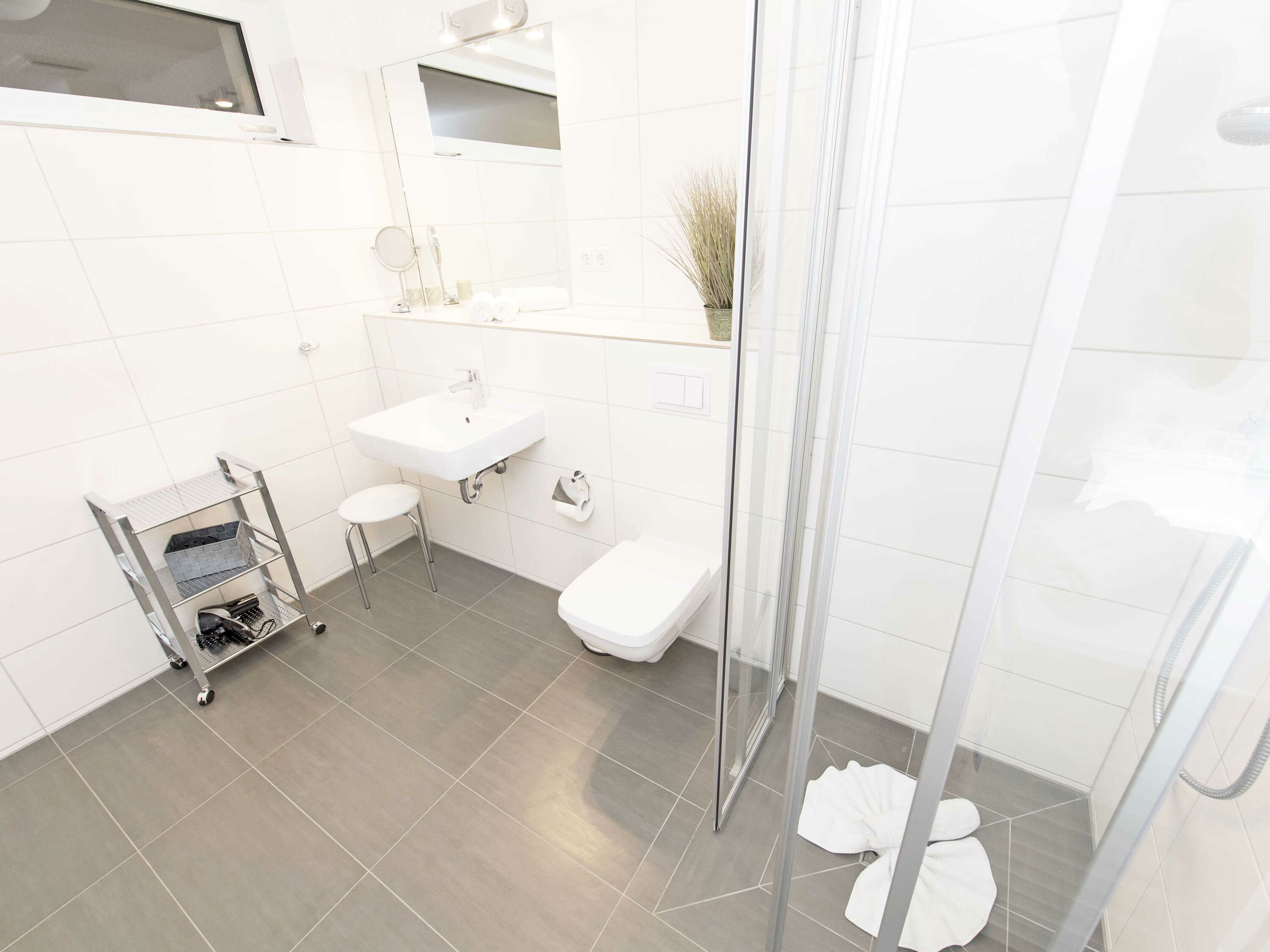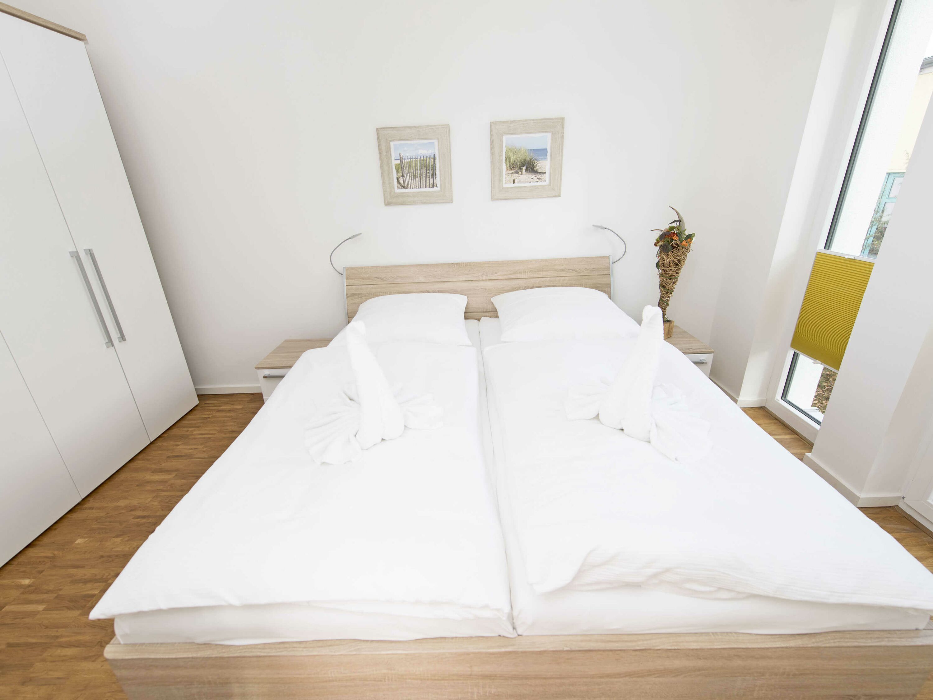 Das Schlafzimmer ist mit einem Doppelbett (1,80 x 2,00 m) ausgestattet. Die Wohnung verfügt weiterhin über ein modern gefliestes Bad mit bodengleicher Dusche sowie einer eigenen Waschmaschine, die Sie kostenfrei nutzen können. Bügelbrett und Bügeleisen sind ebenfalls vorhanden.