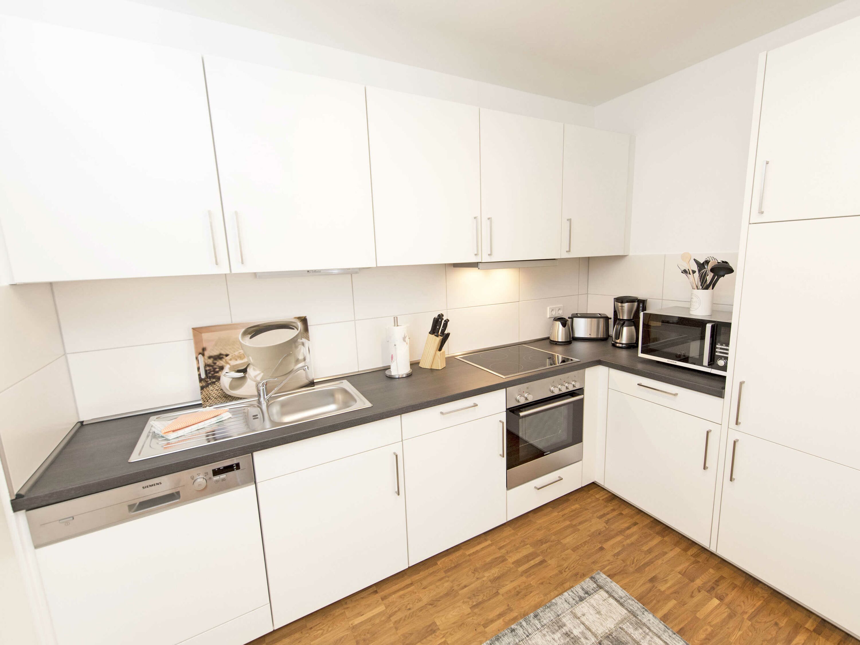 In der Küchenzeile finden Sie u.a. einen Kühlschrank mit Gefrierfach, einen Backofen, ein 4 Platten Ceranfeld, eine Mikrowelle, eine Spülmaschine und diverses Kleininventar, das die Küchenausstattung komplettiert.