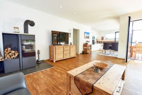 In den kühleren Monaten sorgt die Fußbodenheizung für eine behagliche Atmosphäre. Zusätzlich steht ein Kamin und Feuerholz zur Verfügung