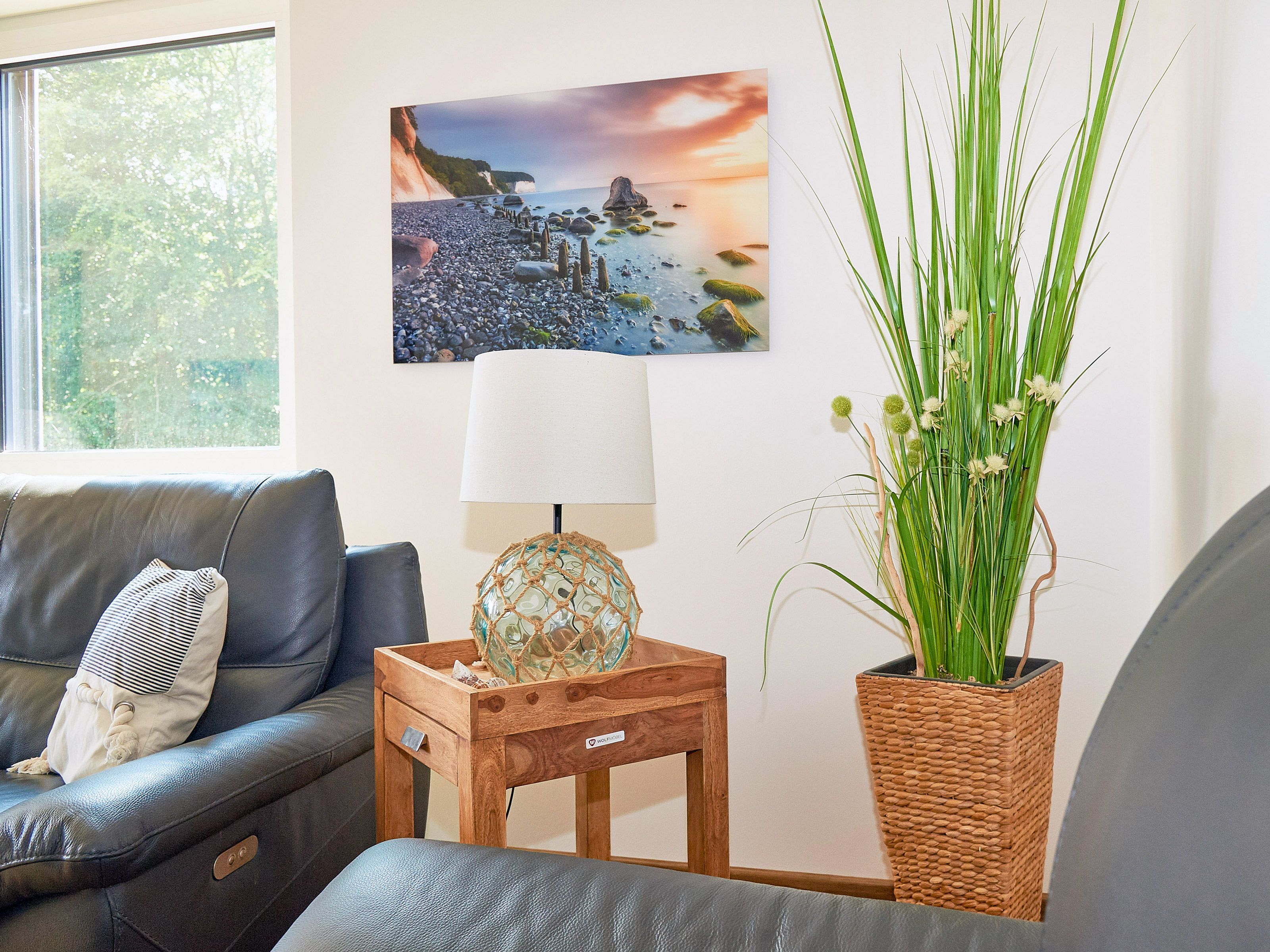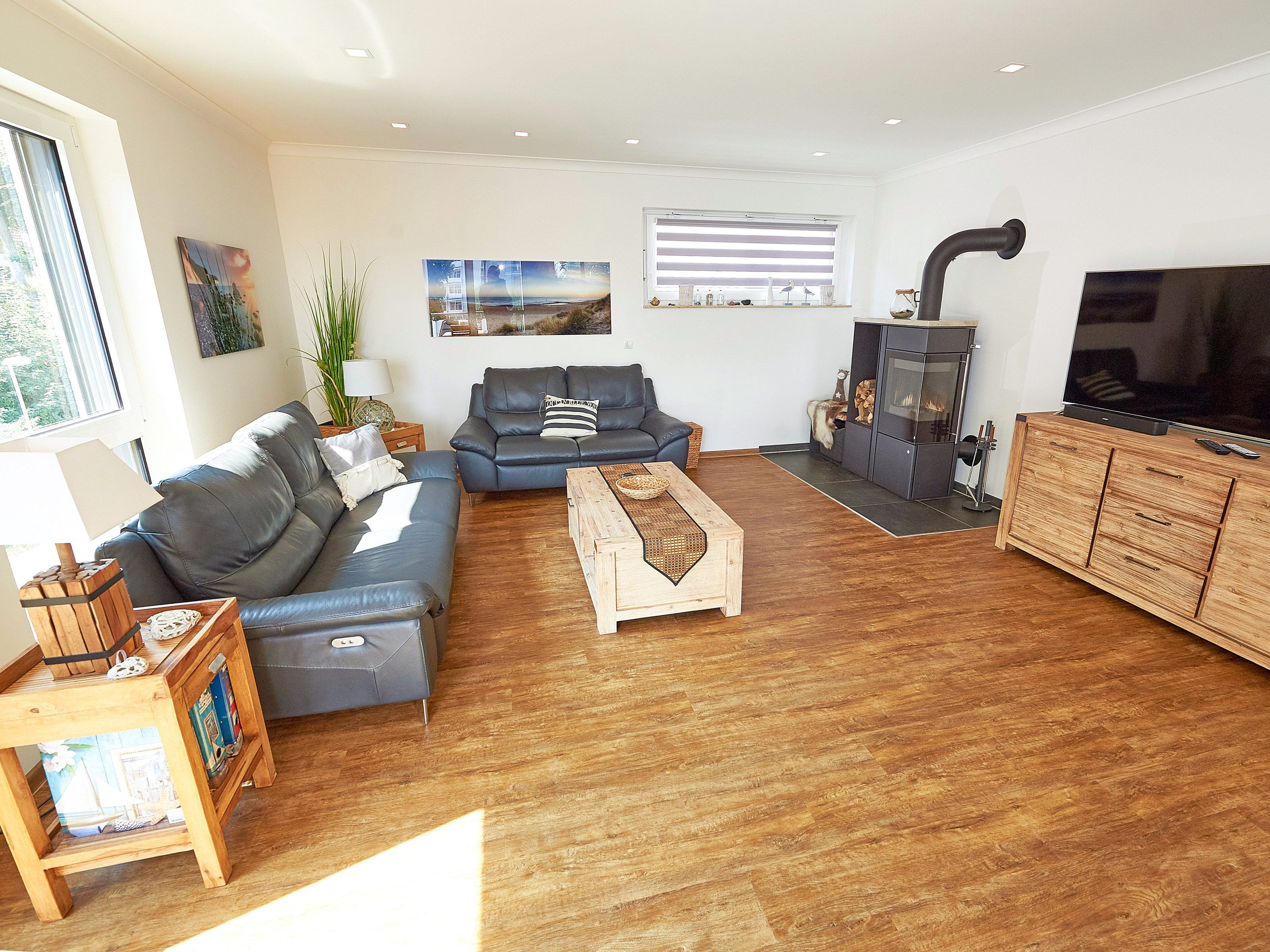 Der Wohn- und Essbereich (ca. 44m²) ist mit einer bequemen Ledersitzgruppe und einem 58“ UHD SMART-TV ausgestattet.
