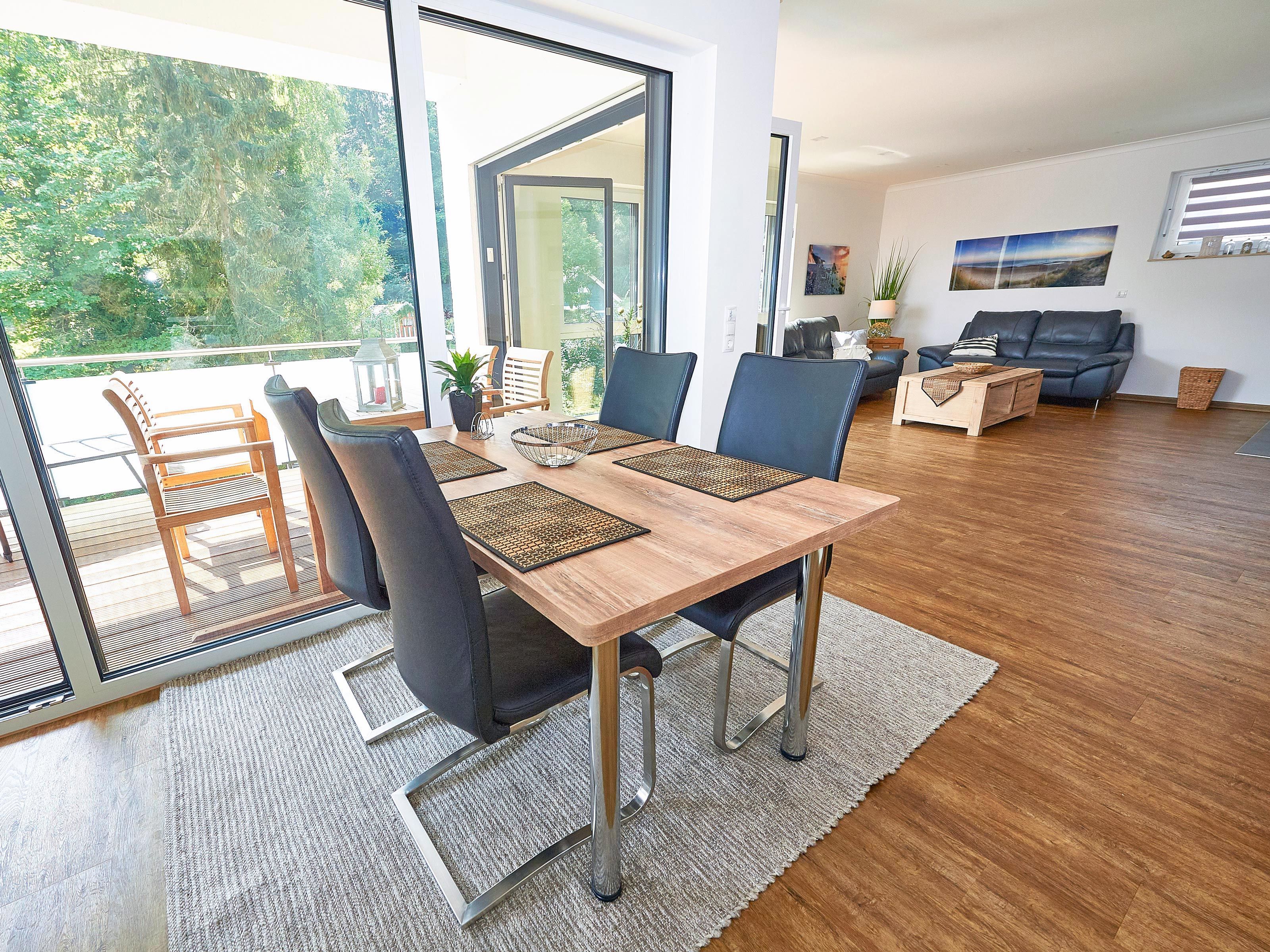 Der Wohn- und Essbereich (ca. 44m²) ist mit einer bequemen Ledersitzgruppe und einem 58 UHD SMART-TV ausgestattet.