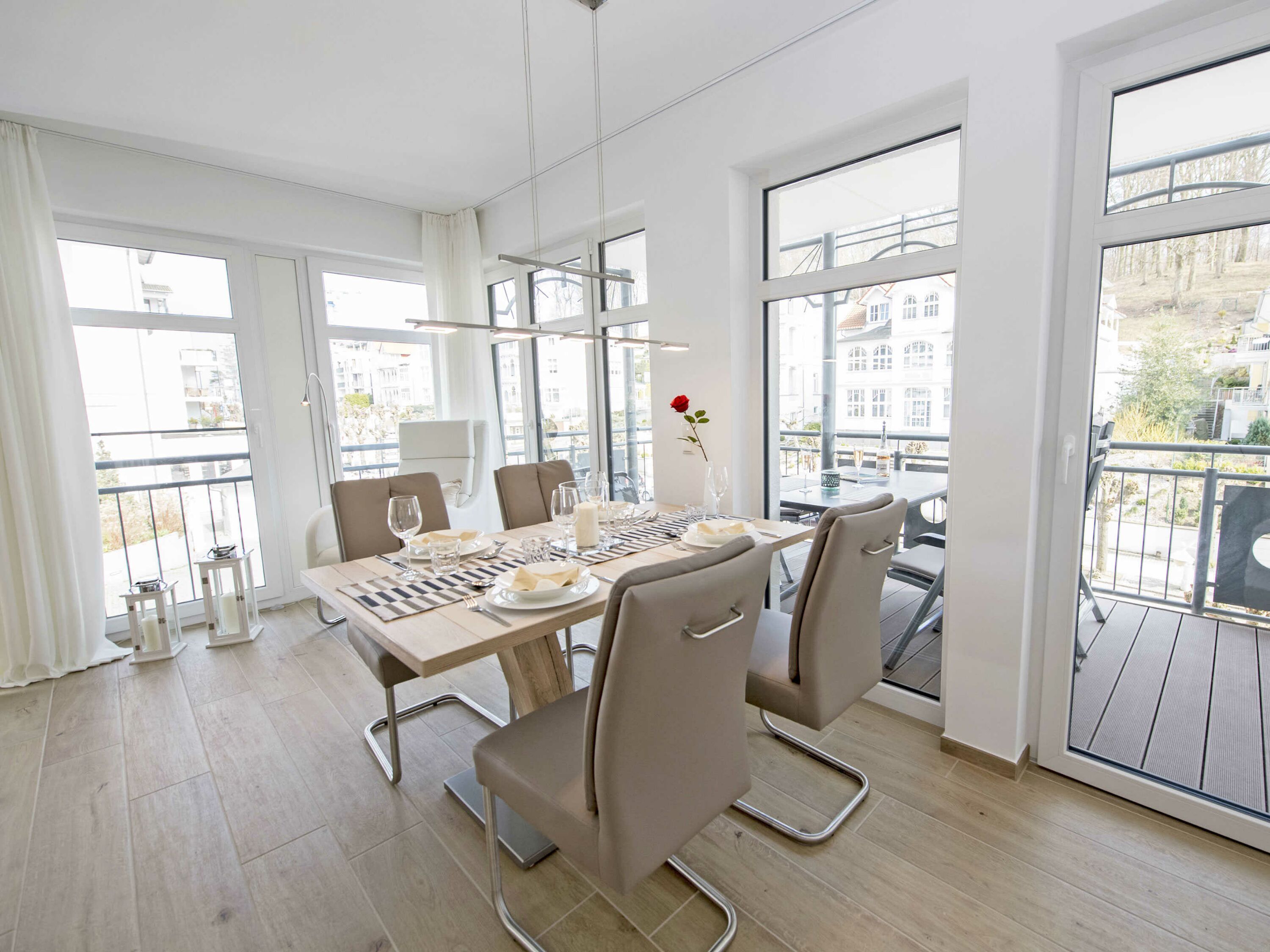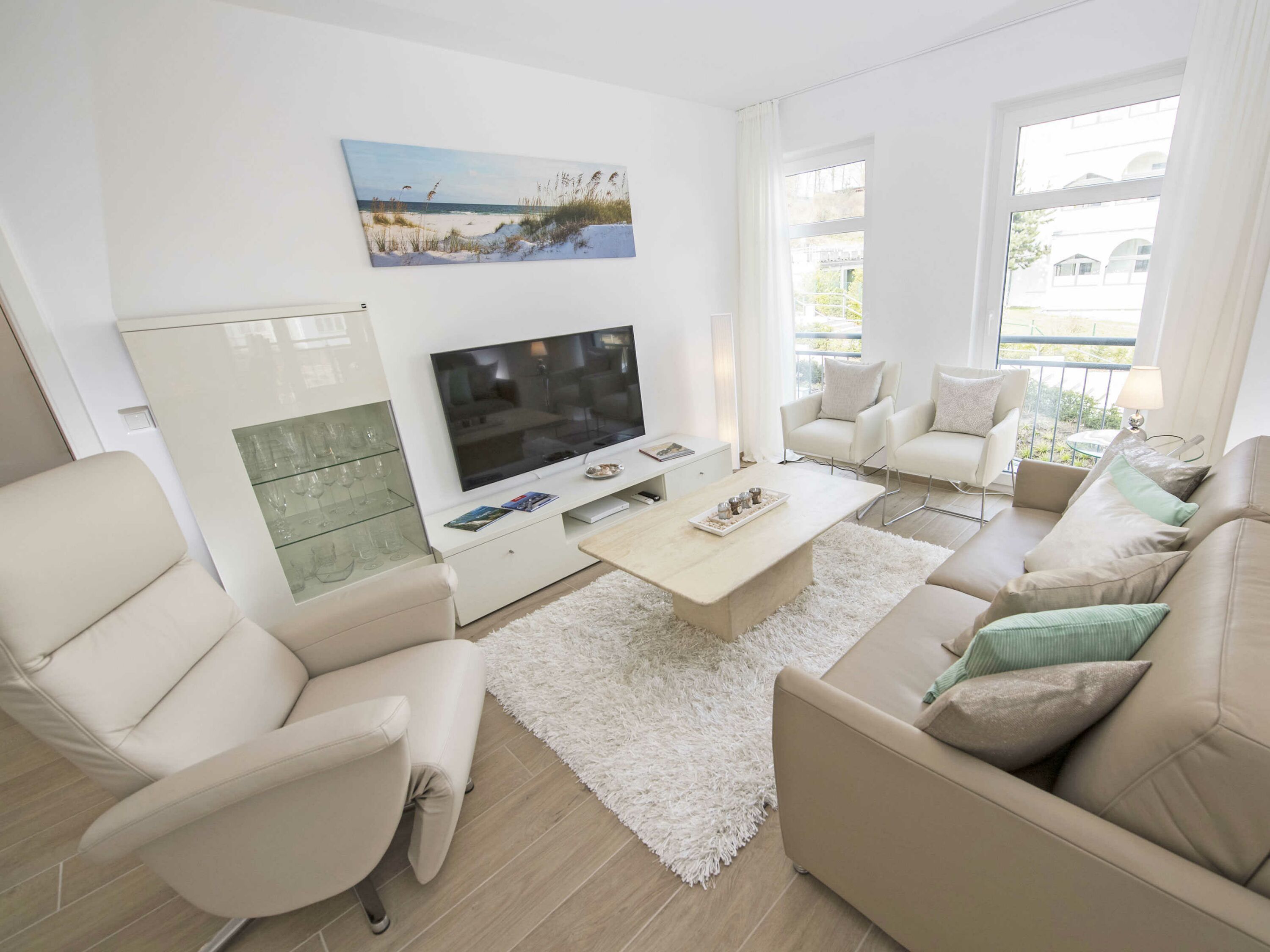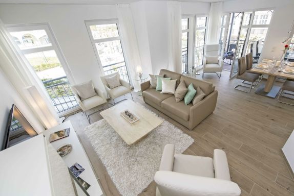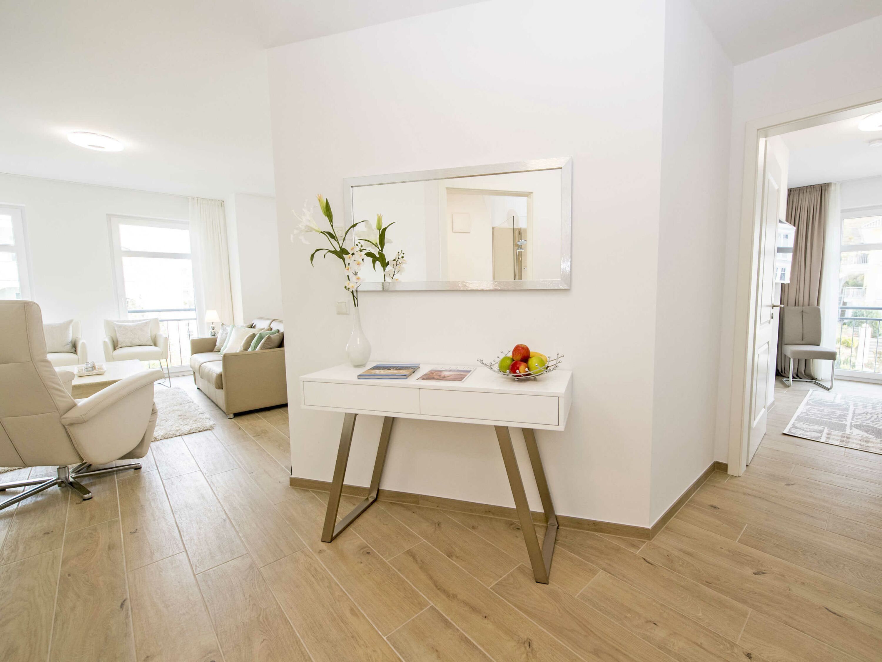 Der offene Wohnungsgrundriss sorgt für ein luftig leichtes Wohngefühl. Einen außergewöhnlichen Charakter erhält der große lichtdurchflutete Wohn-/Essbereich mit dem offenen Küchentresen durch die schöne Bodengestaltung, die raumhohen Fenster zu zwei Seiten und durch den überdachten Balkon. Die Einrichtung ist hochwertig und mit Liebe zum Detail sehr geschmackvoll in dezenten Farben gehalten. Die Farbtöne des blauen Himmels, der grünen Wälder, des klaren blauen Wassers und des herrlichen weißen feinsandigen Selliner Haupt- und Südstrandes stimmen Sie auf die schöne Natur vor Ihrer Haustür ein.