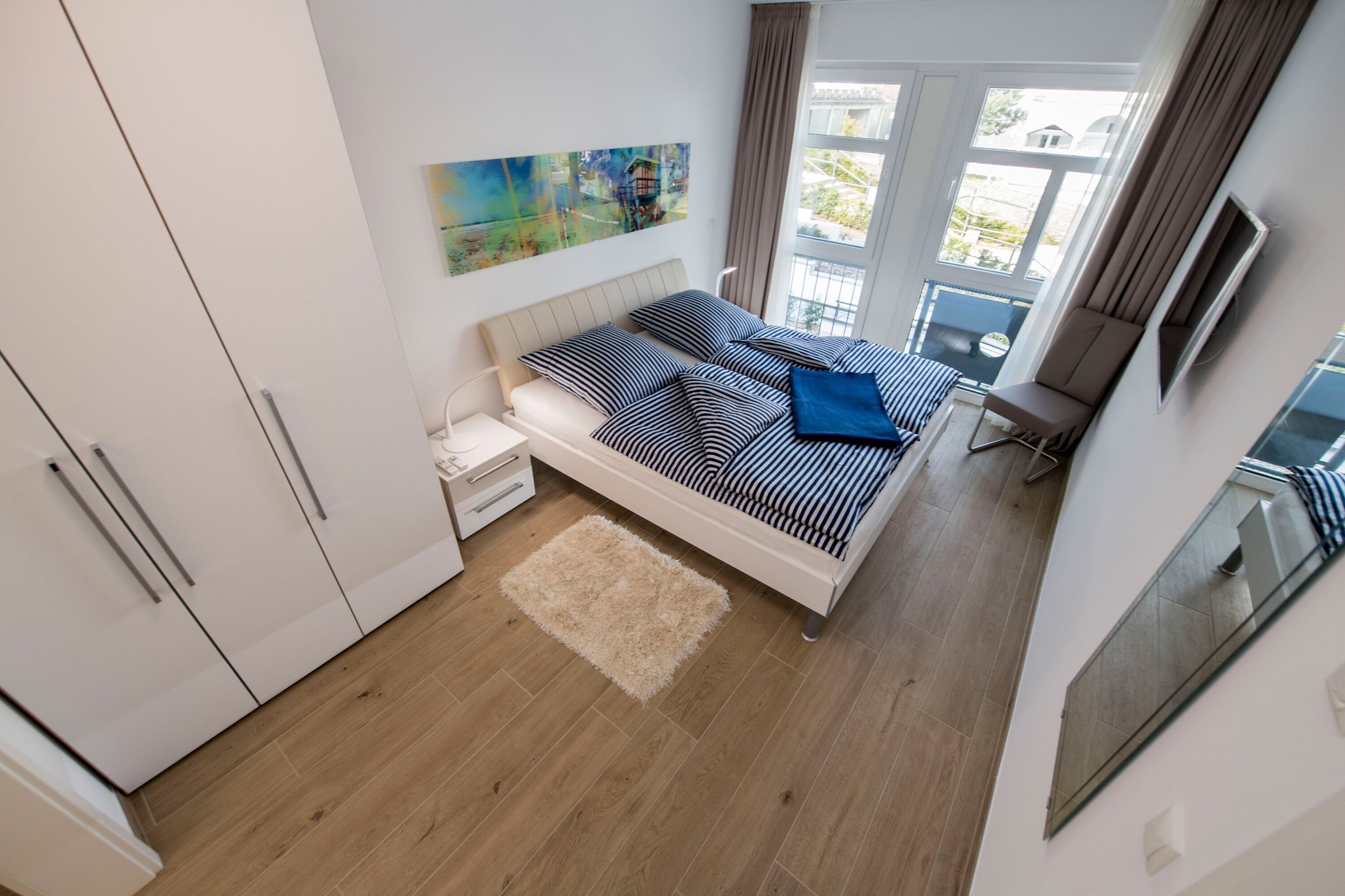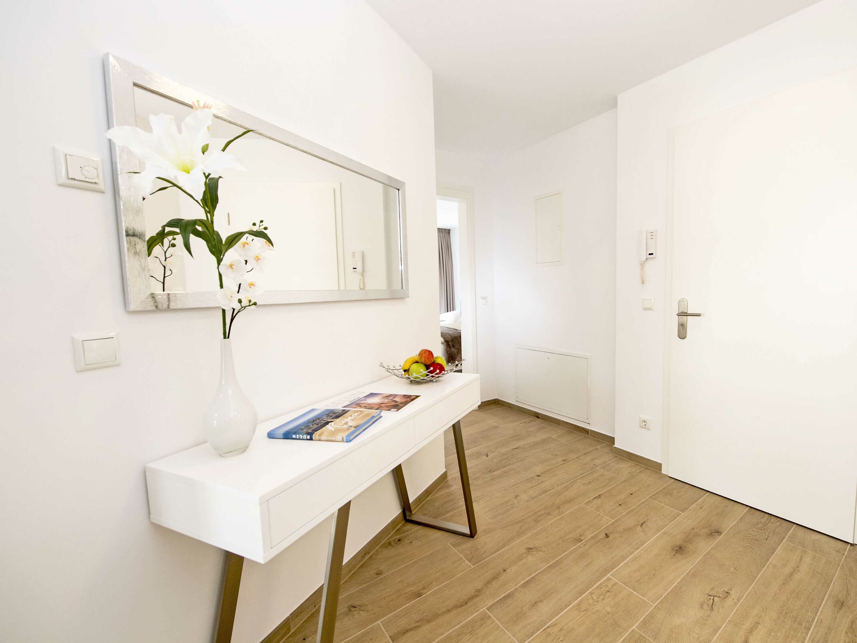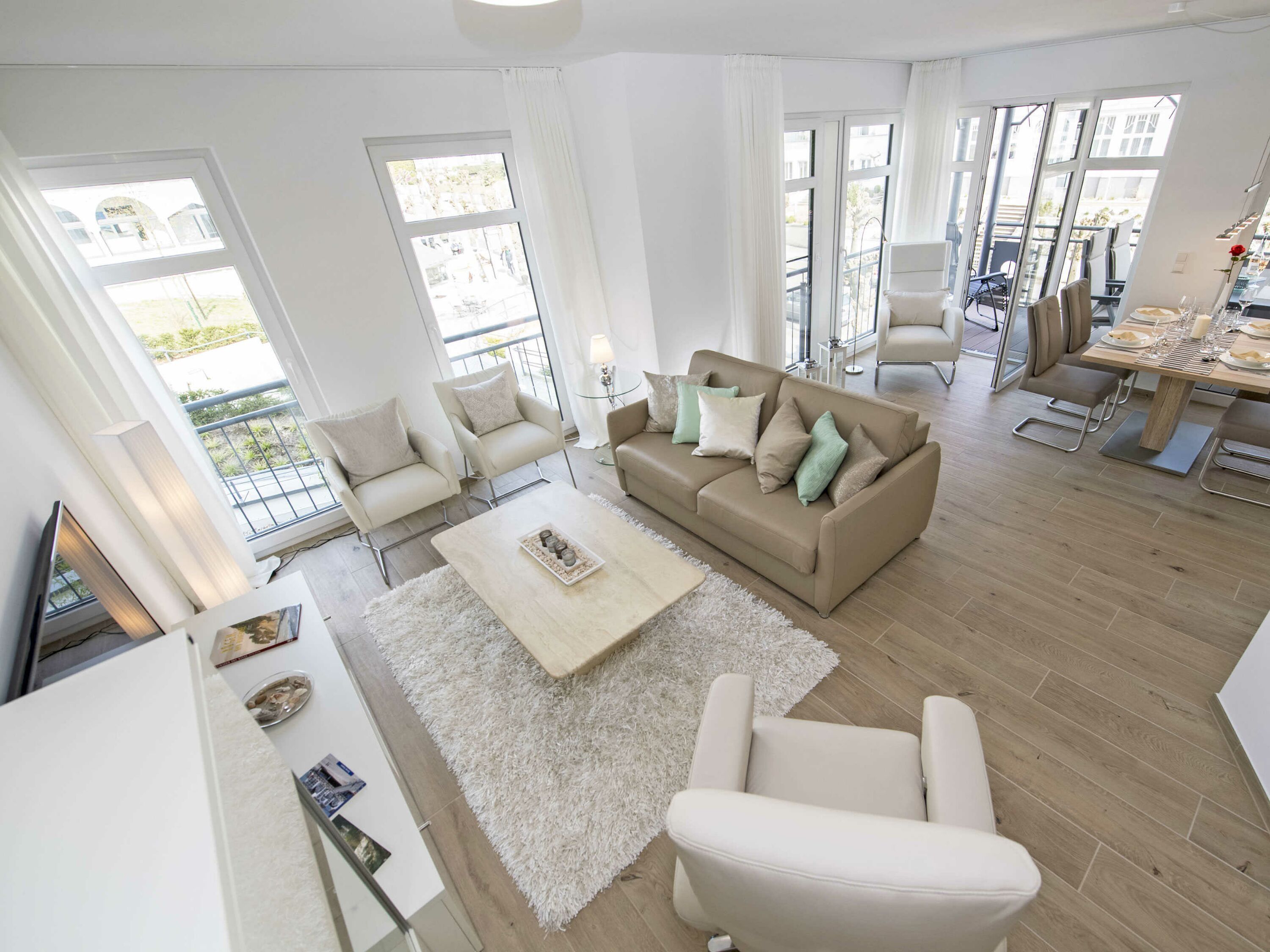 Der offene Wohnungsgrundriss sorgt für ein luftig leichtes Wohngefühl. Einen außergewöhnlichen Charakter erhält der große lichtdurchflutete Wohn-/Essbereich mit dem offenen Küchentresen durch die schöne Bodengestaltung, die raumhohen Fenster zu zwei Seiten und durch den überdachten Balkon. Die Einrichtung ist hochwertig und mit Liebe zum Detail sehr geschmackvoll in dezenten Farben gehalten. Die Farbtöne des blauen Himmels, der grünen Wälder, des klaren blauen Wassers und des herrlichen weißen feinsandigen Selliner Haupt- und Südstrandes stimmen Sie auf die schöne Natur vor Ihrer Haustür ein.