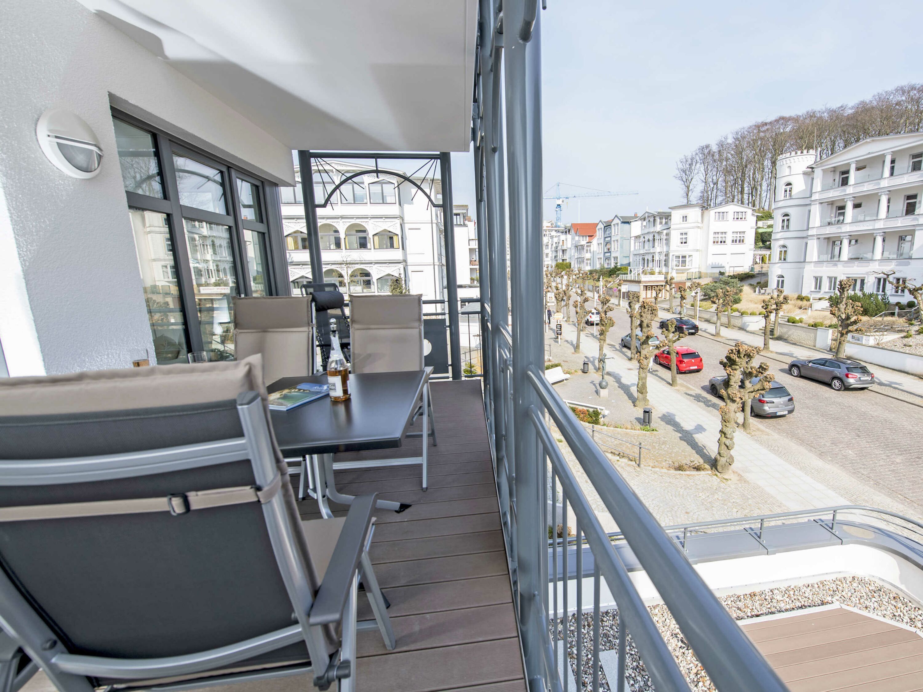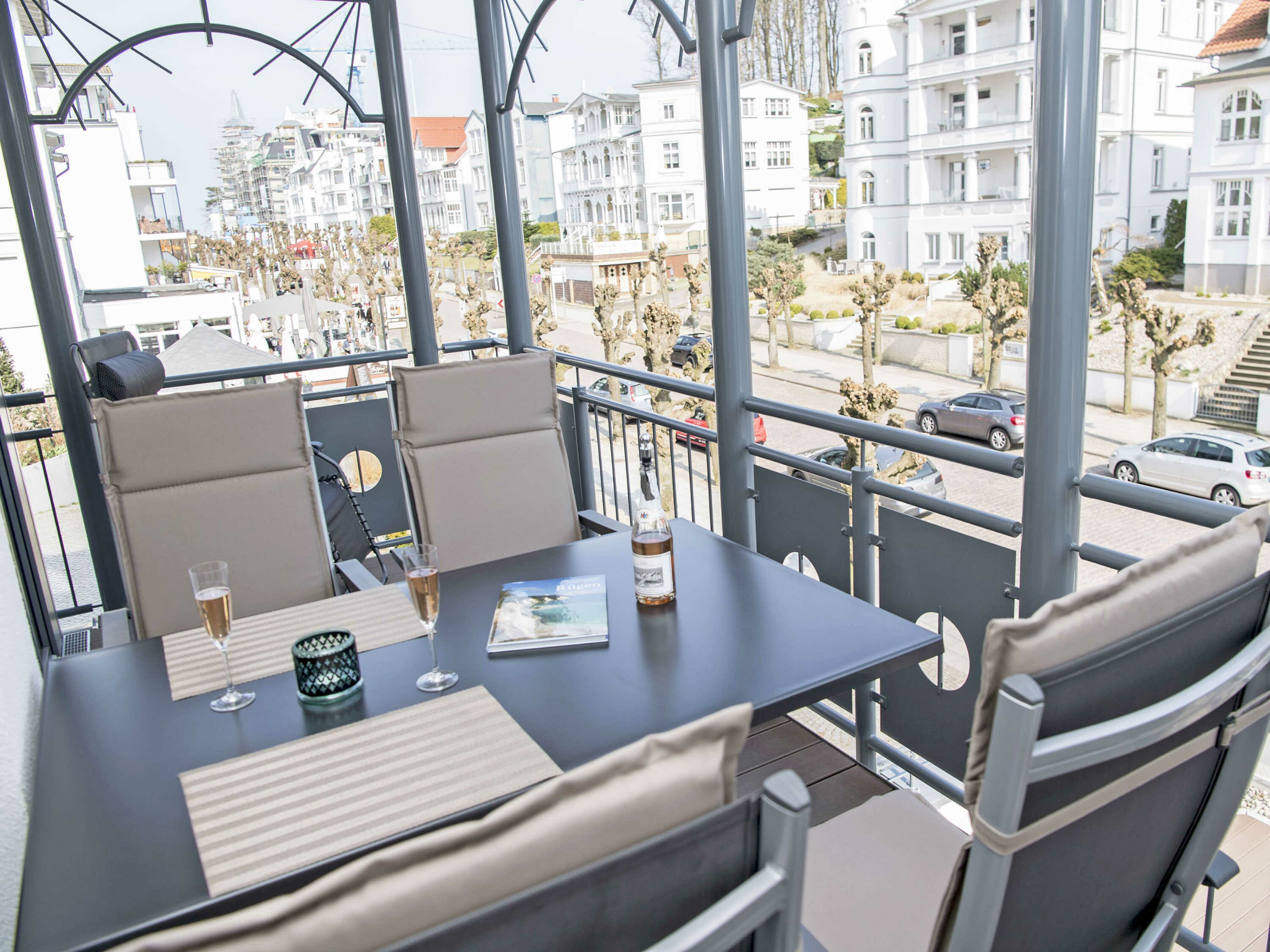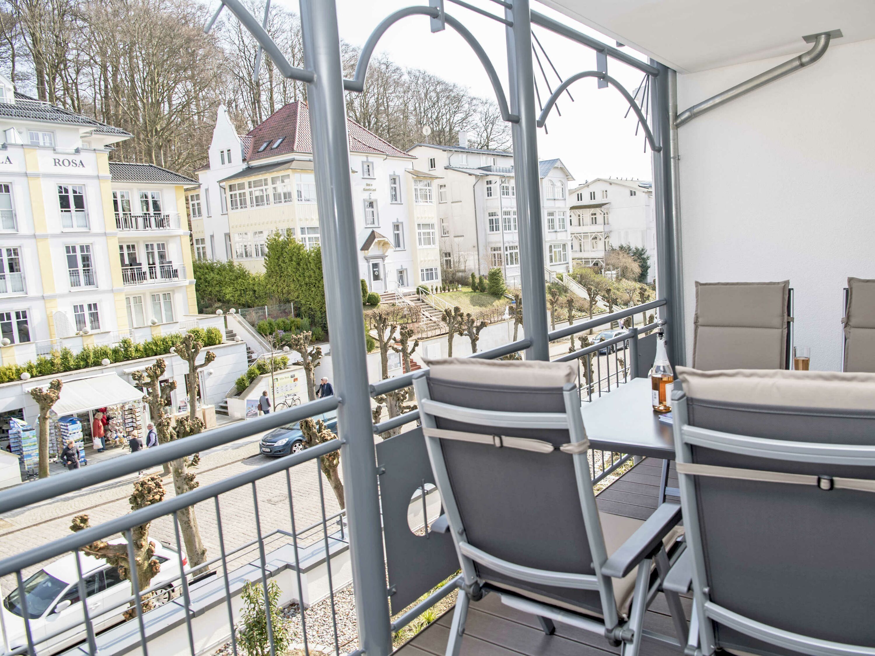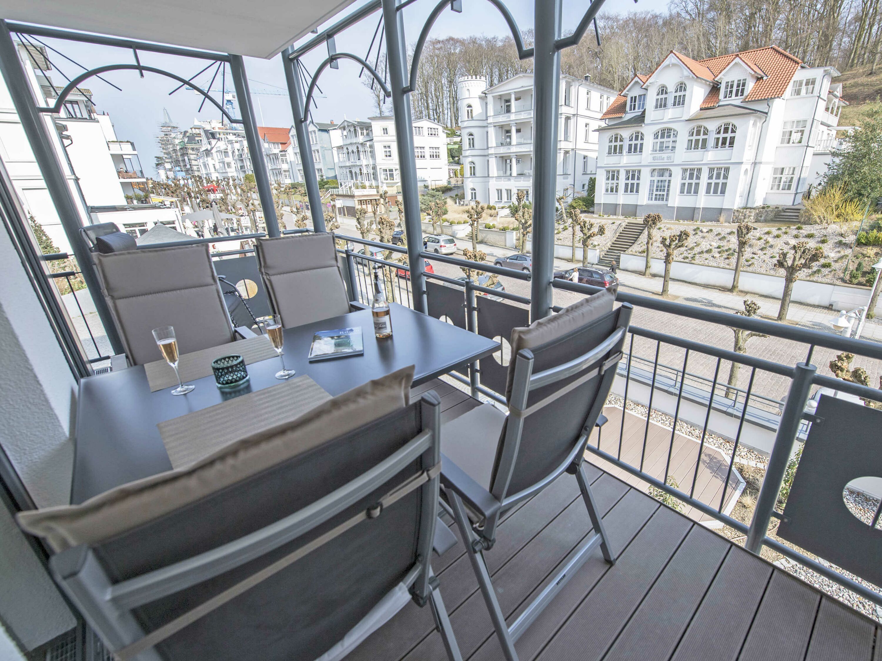 Der schöne, überdachte und mit filigranen Bäderarchitektur-Elementen verzierte Balkon, verfügt über eine elegante Sitzgruppe der Marke Kettler mit Multipositions-Sesseln und -Liegen. Vom Team des benachbarten “Café Wilhelm” können Sie sich die knackigen Brötchen quasi auf den Frühstückstisch werfen lassen. Probieren Sie unbedingt auch die leckeren Torten.