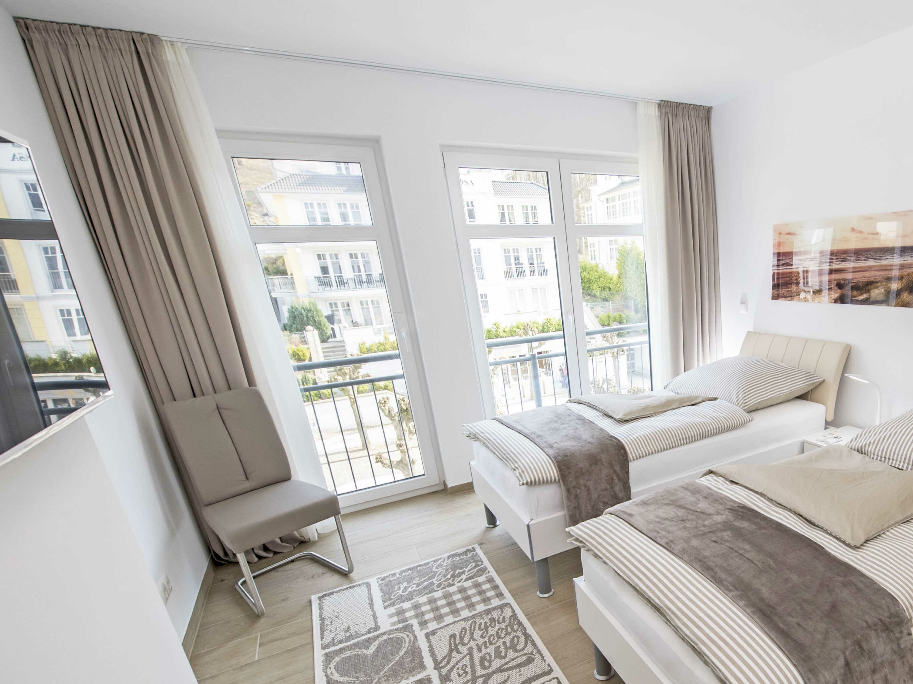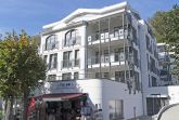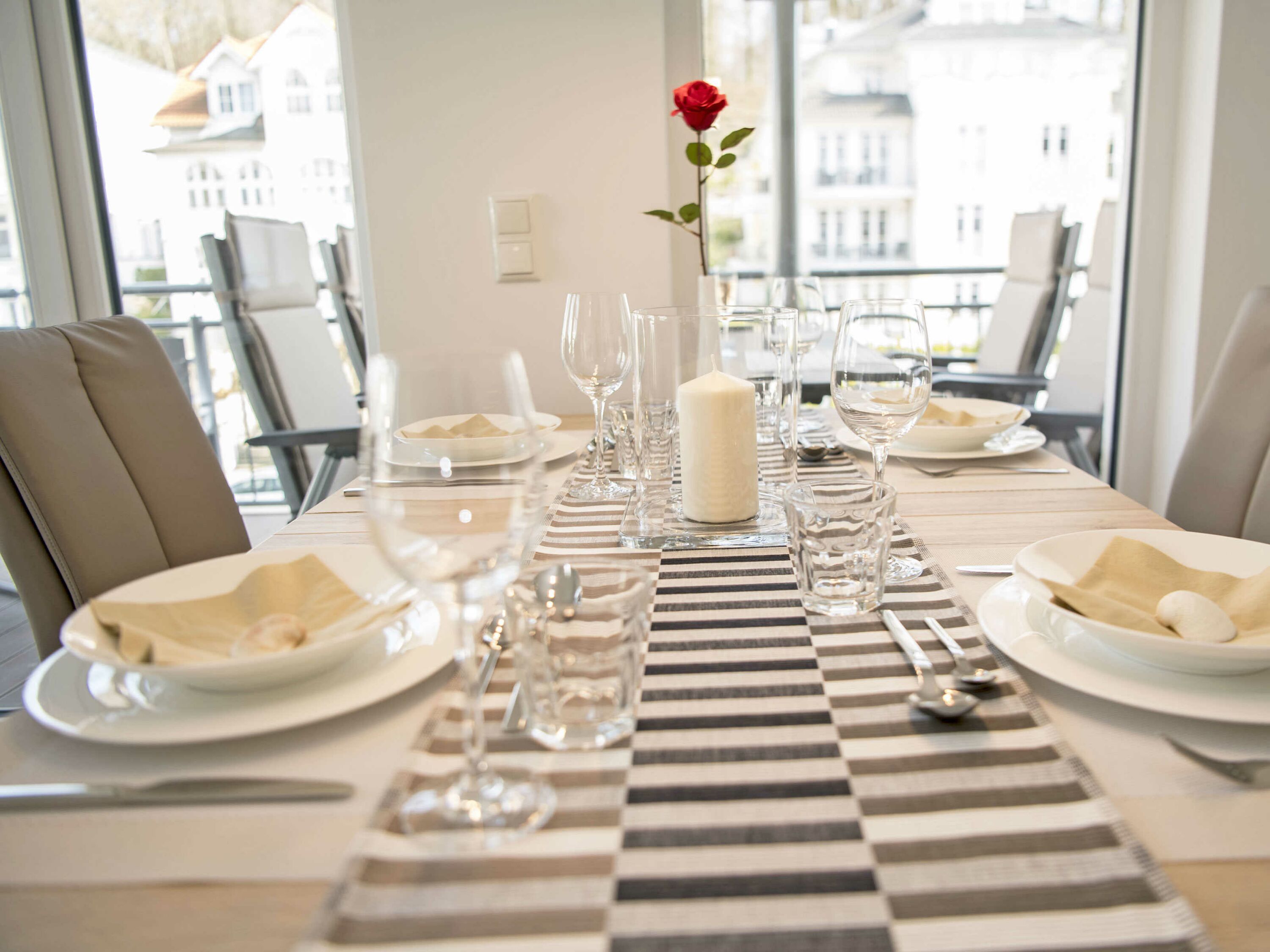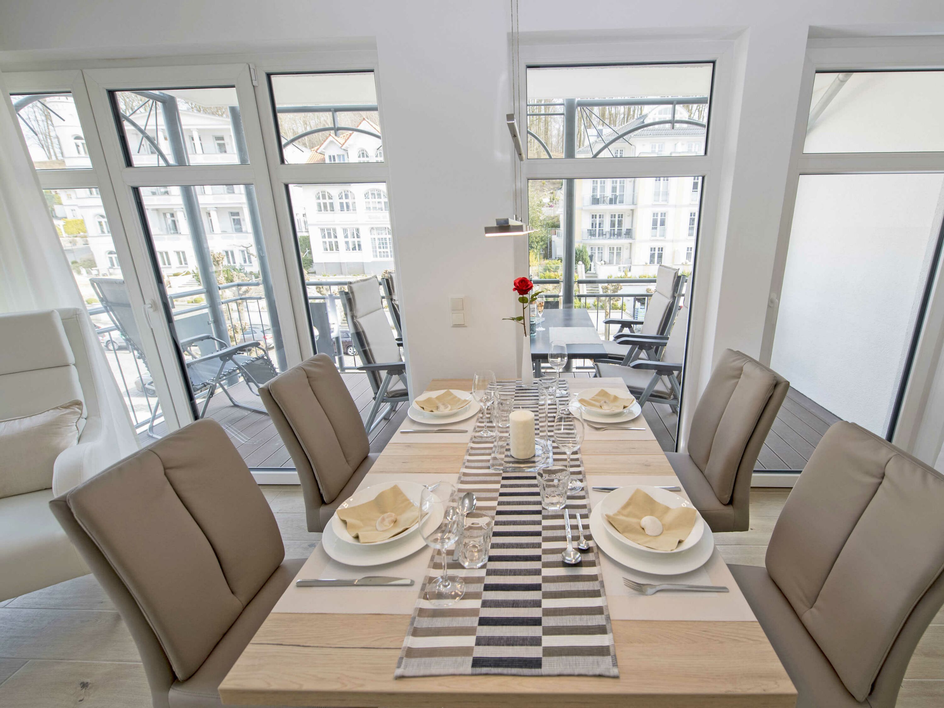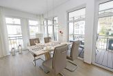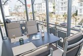 Der schöne, überdachte und mit filigranen Bäderarchitektur-Elementen verzierte Balkon, verfügt über eine elegante Sitzgruppe der Marke Kettler mit Multipositions-Sesseln und -Liegen. Vom Team des benachbarten “Café Wilhelm” können Sie sich die knackigen Brötchen quasi auf den Frühstückstisch werfen lassen. Probieren Sie unbedingt auch die leckeren Torten.