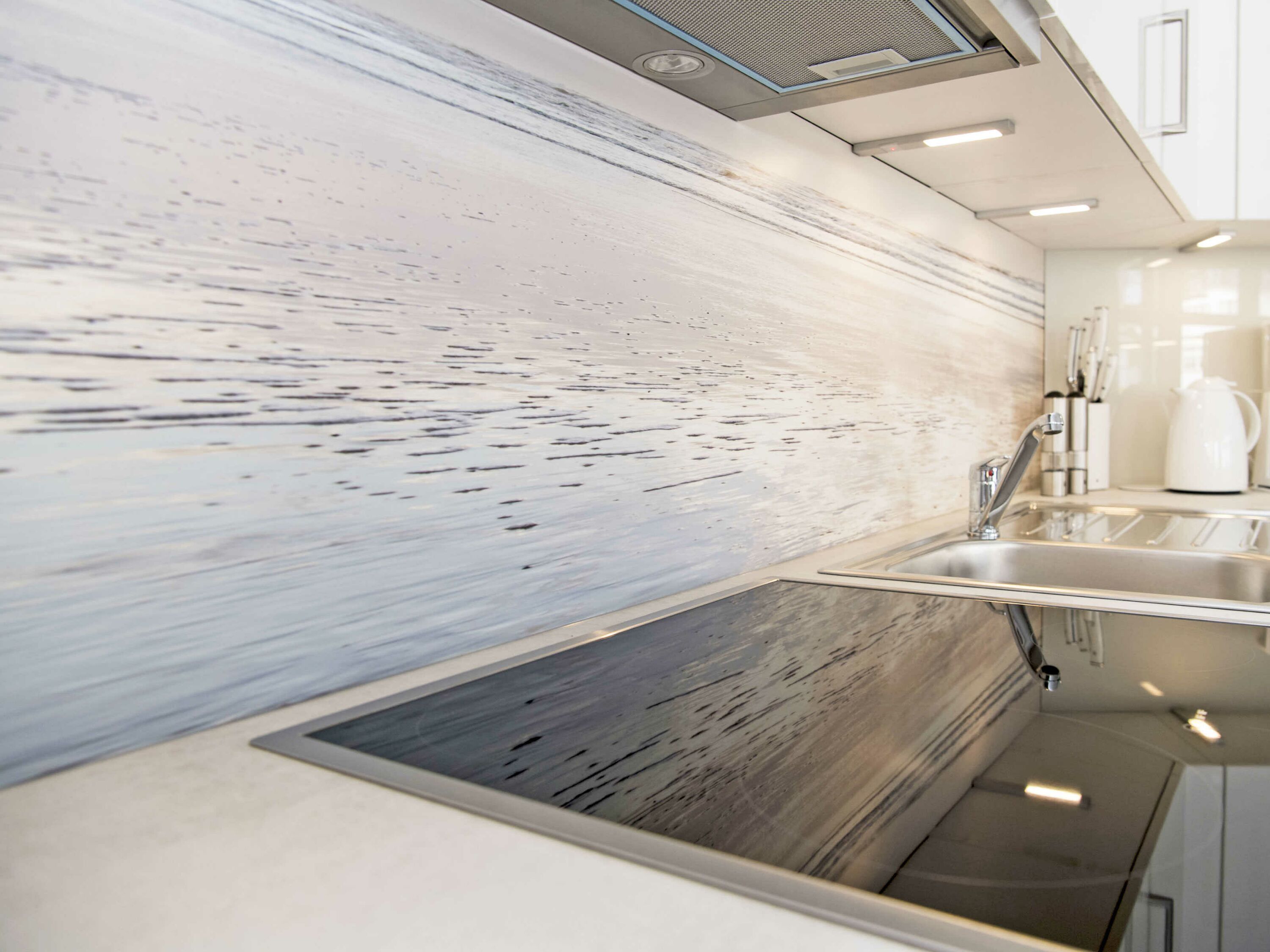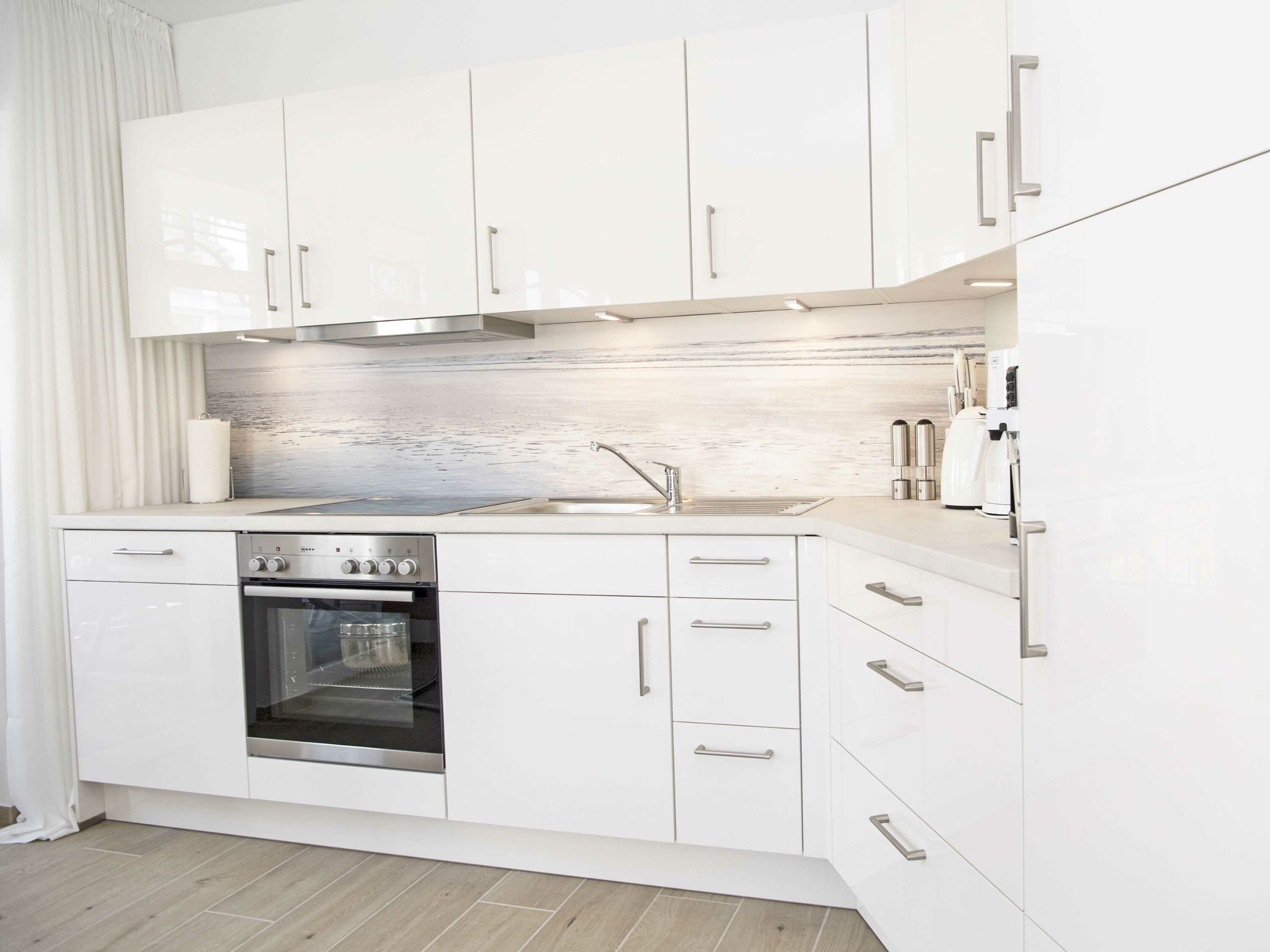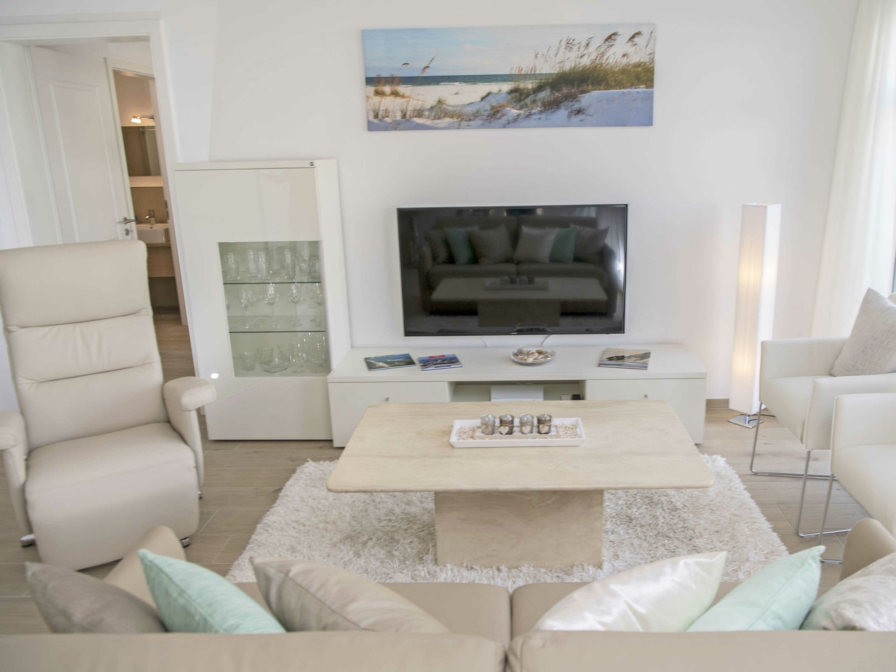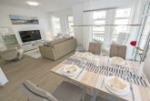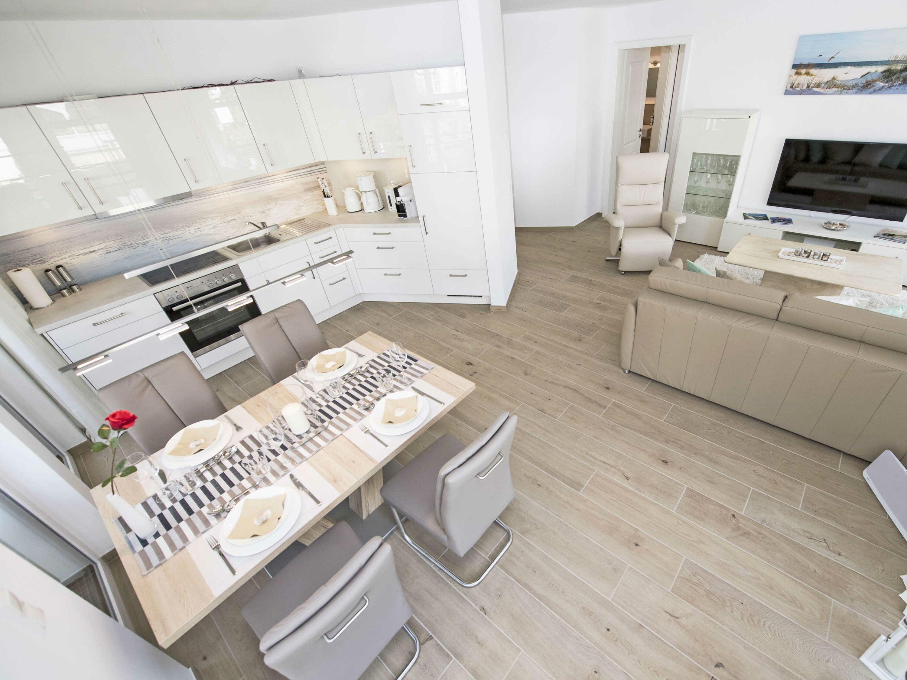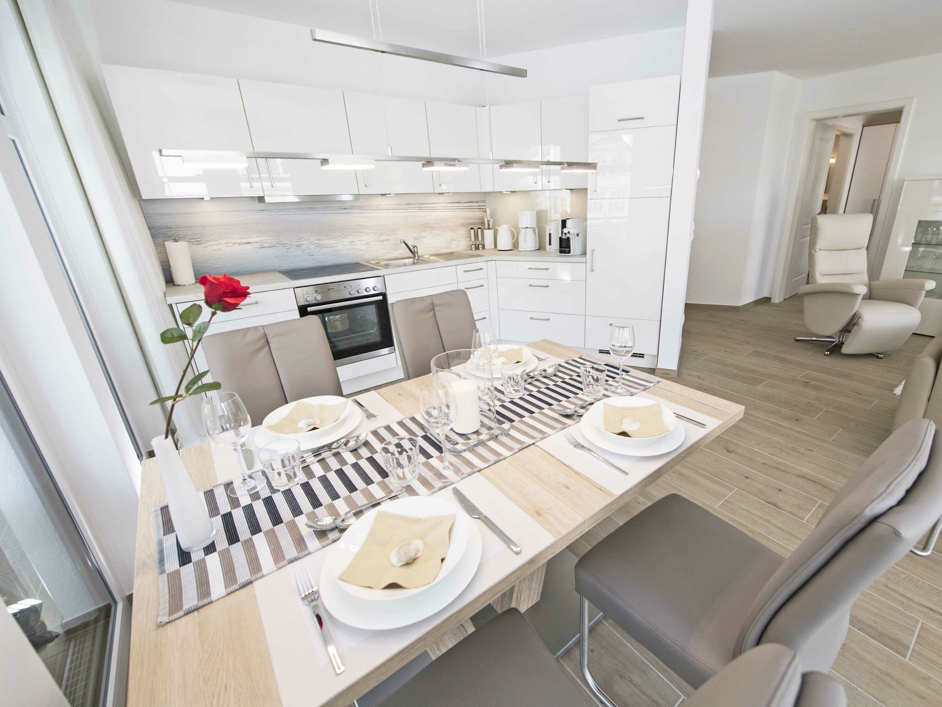 Die hochwertige Einrichtung der Wohnung INSELGLÜCK mit Möbeln namhafter Hersteller u.a. von Hülsta, Musterring, Ewald Schillig sowie eine stilvolle Dekoration sorgen für ein behagliches Wohngefühl. Die integrierte Wohnküche mit Bildmotiv ist komplett ausgestattet und lässt keine Wünsche offen.