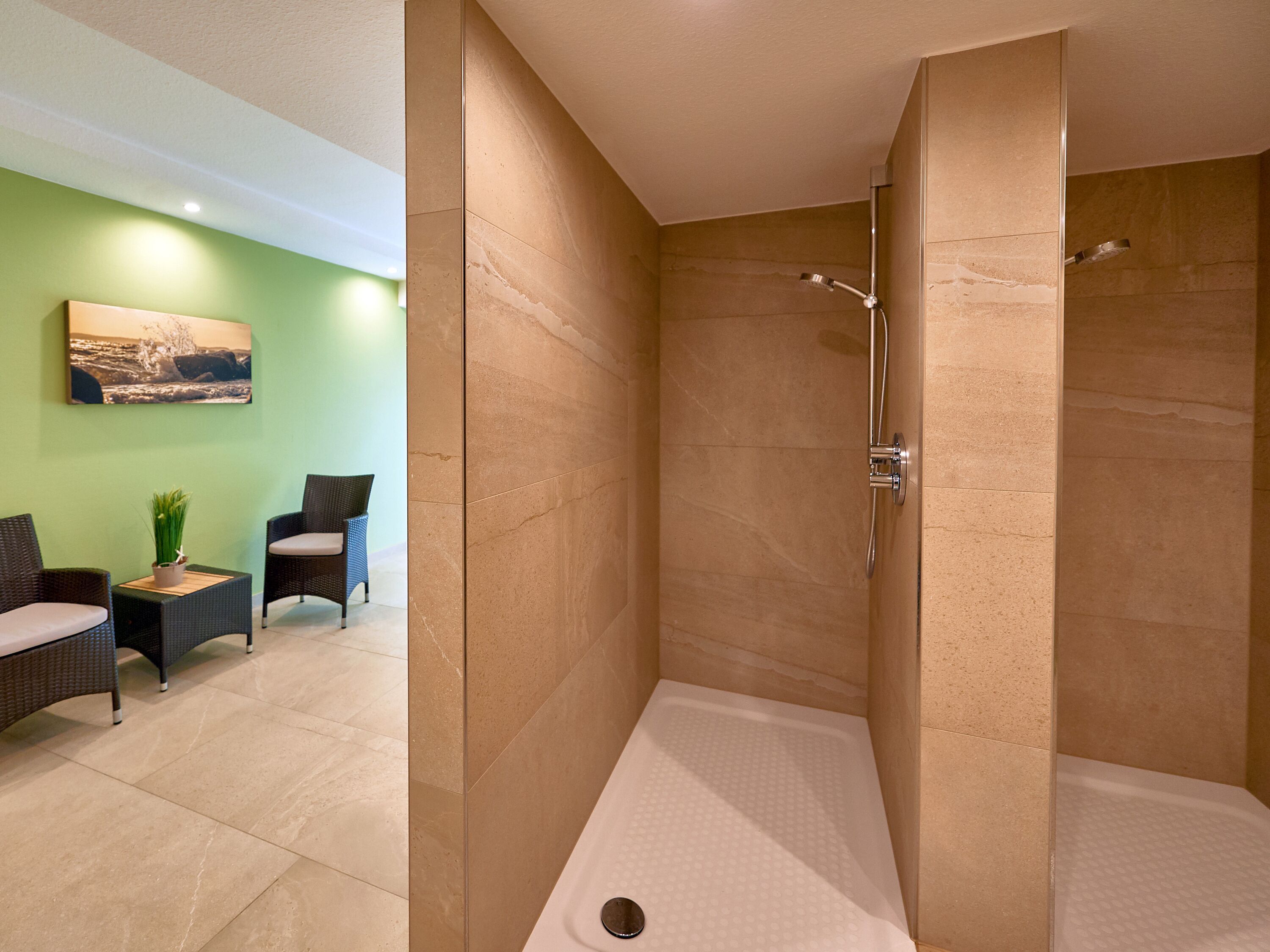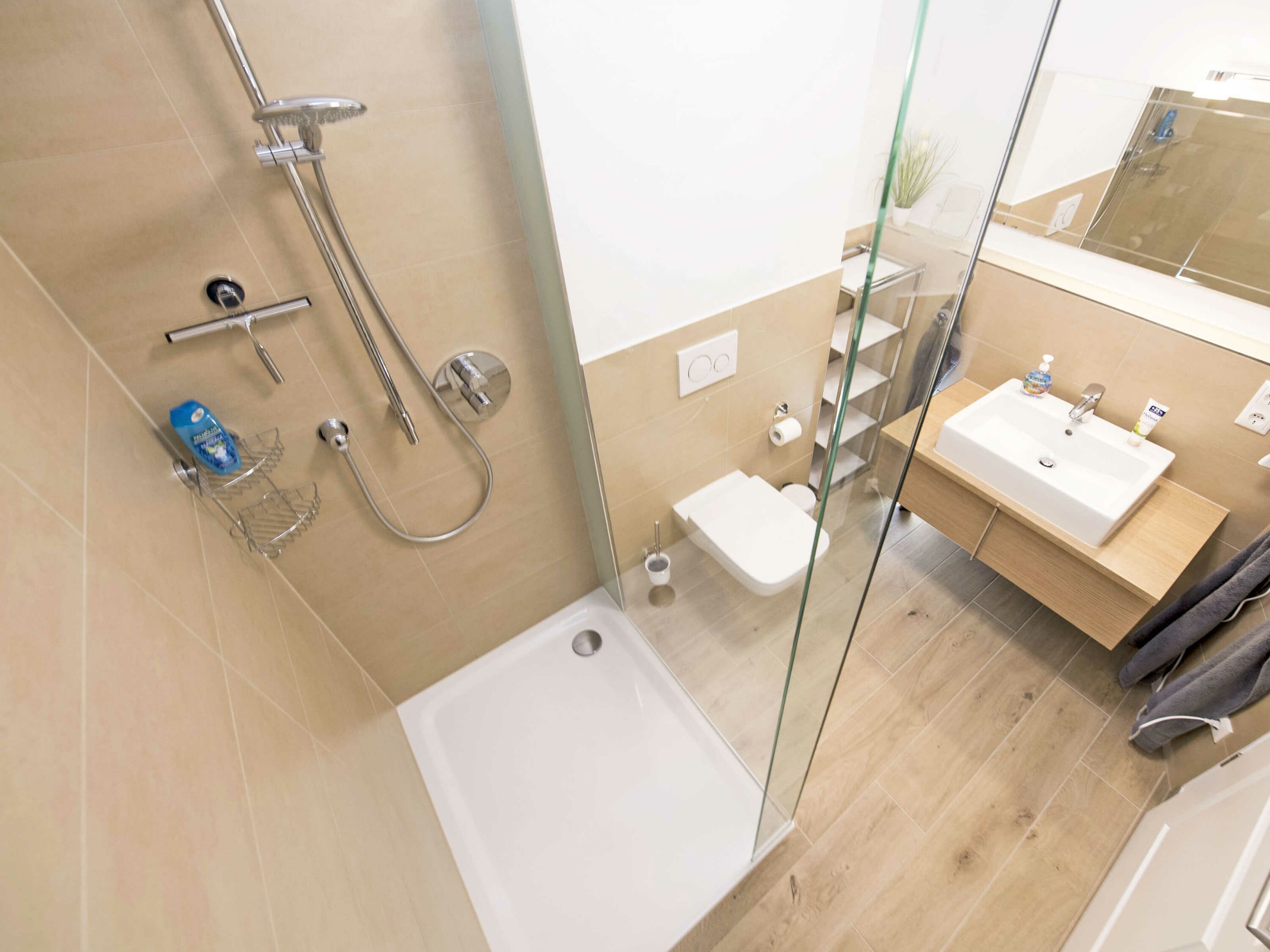 Die beiden Duschbäder sind hochwertig gefliest und verfügen über anspruchsvolle Sanitärobjekte und Armaturen von Grohe und Duravit. Eine Münz-Waschmaschine und -Trockner stehen im Hauswirtschaftsraum im Erdgeschoss für kleines Geld zur Verfügung. Bügelbrett und Bügeleisen sind in der Wohnung vorhanden.