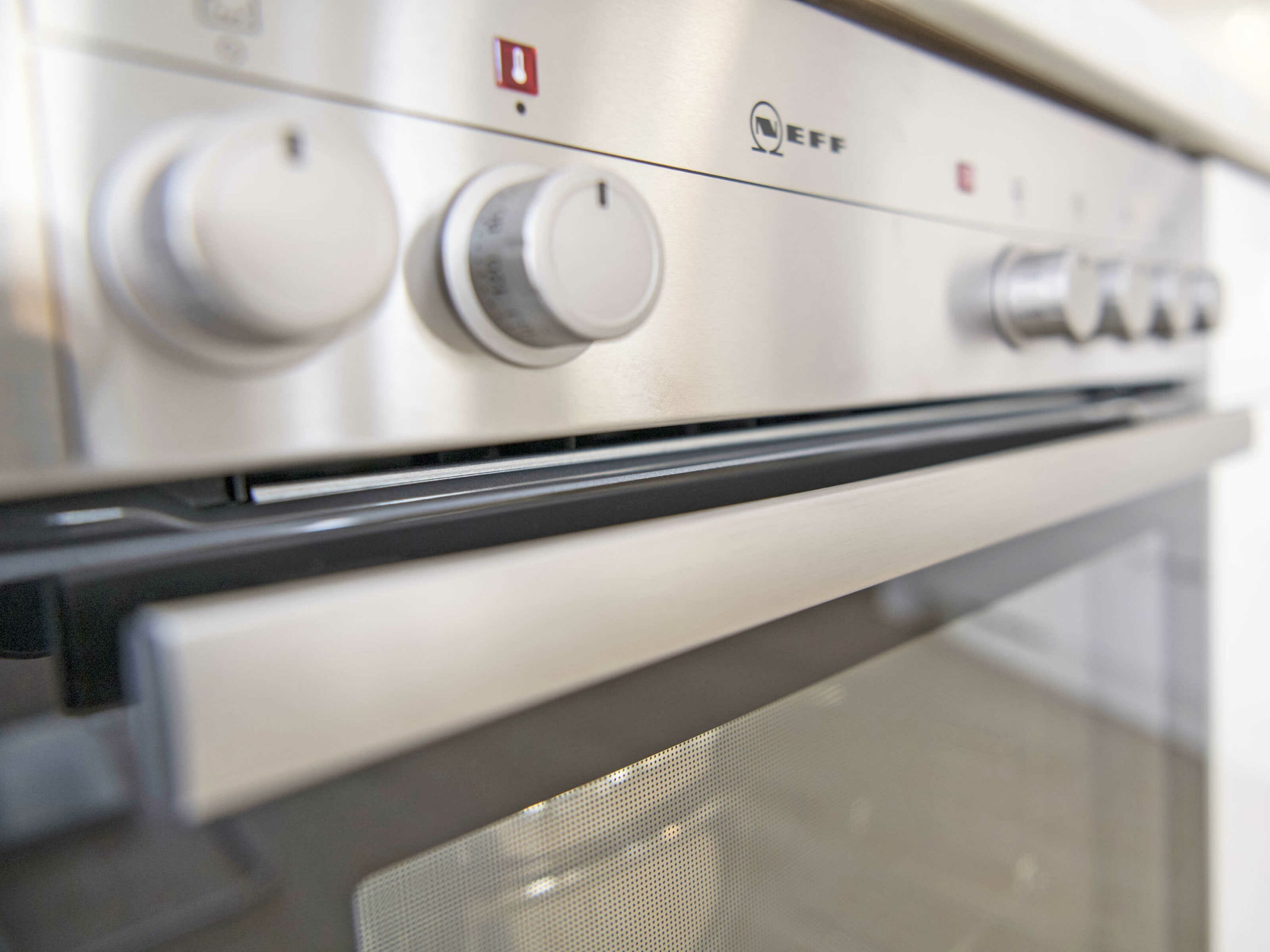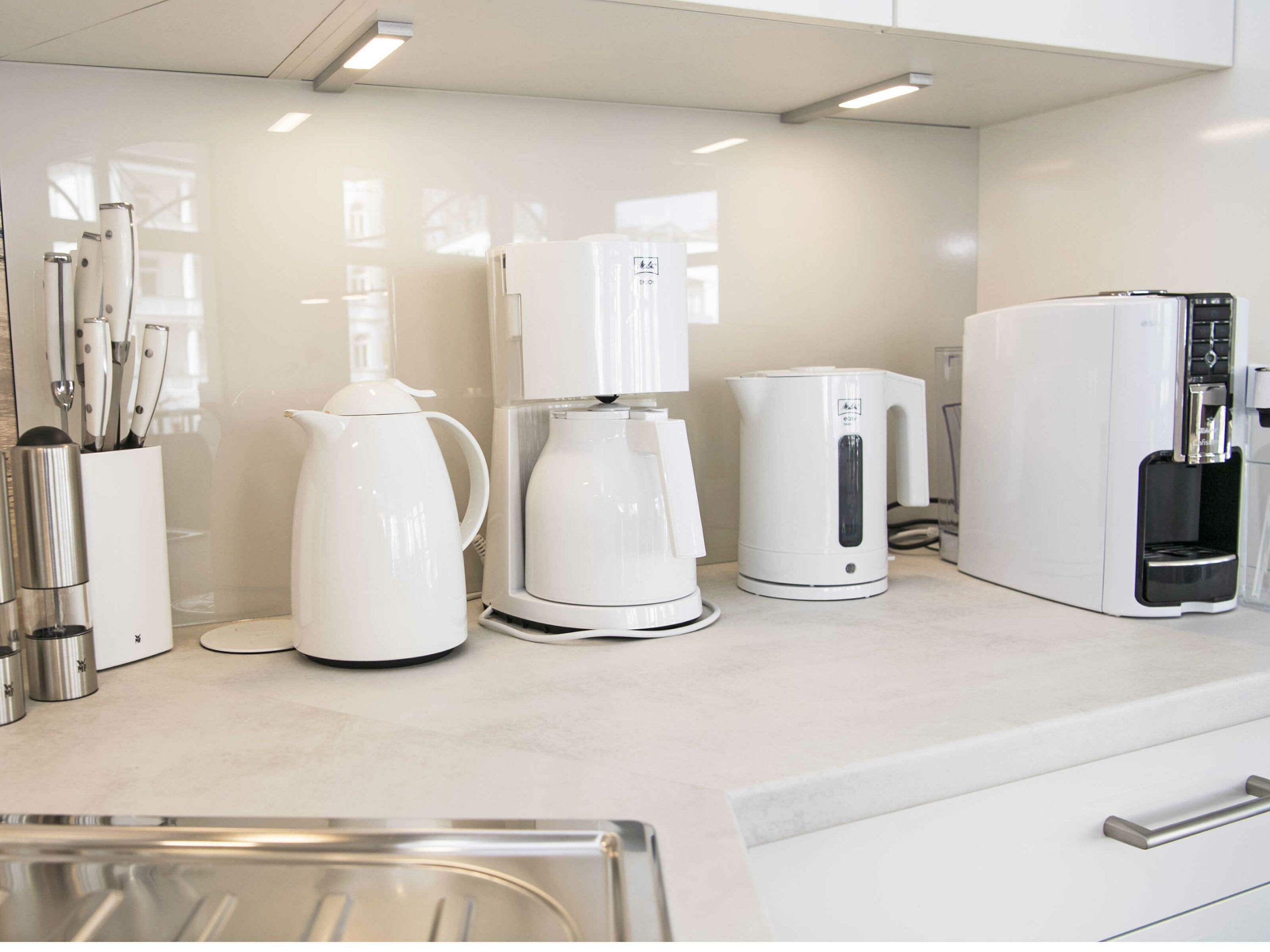 Die vollständig und mit allem Equipment u.a. von WMF eingerichtete offene Küche inklusive Markengeräten von Neff verfügt über einen ausziehbaren Esstisch mit bequemen Leder-Stühlen und einem direkten Zugang zum überdachten Balkon. Ein Tchibo-Cafissimo/Saeco-Kapselautomat zaubert Ihnen leckere Kaffeespezialitäten.