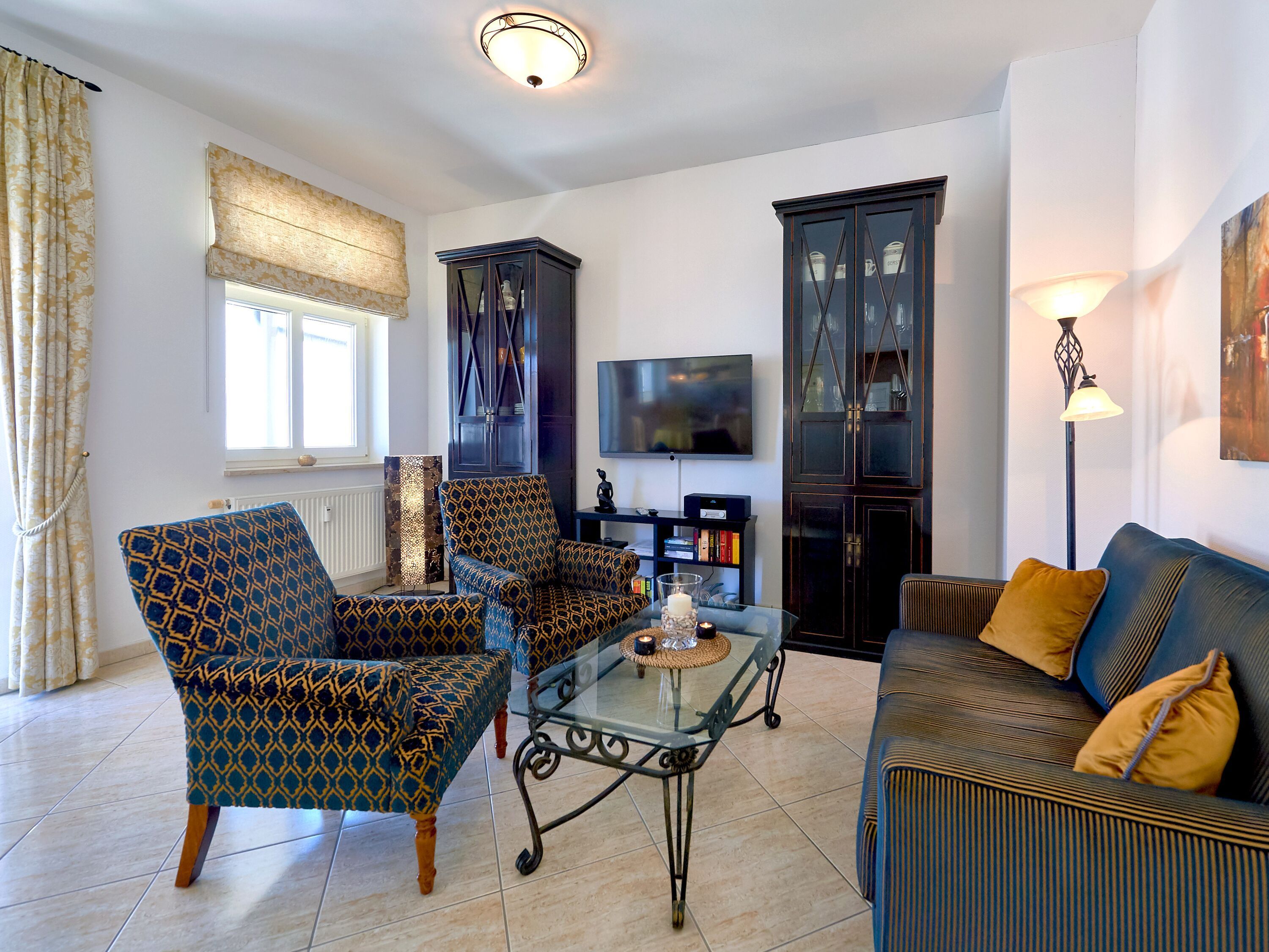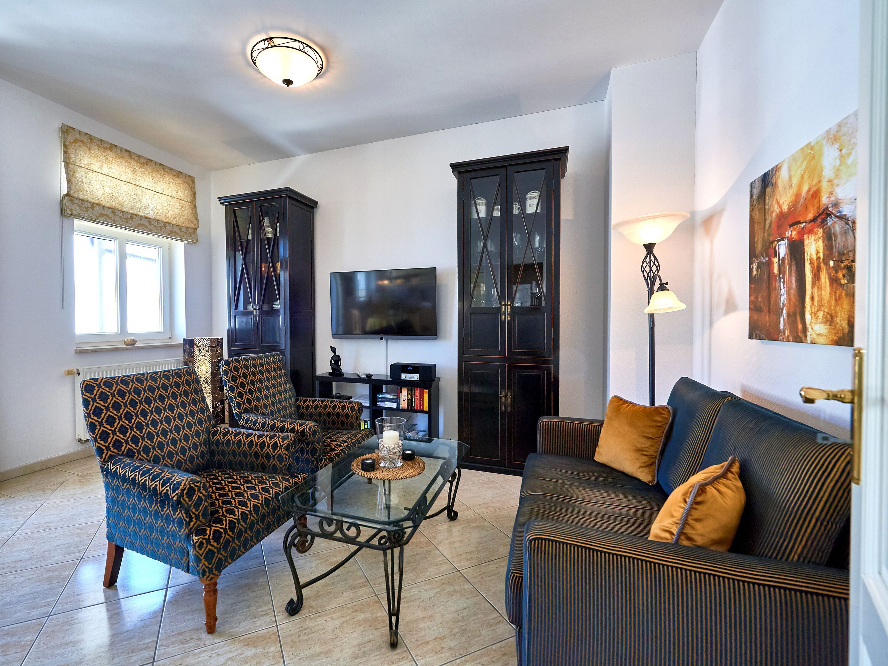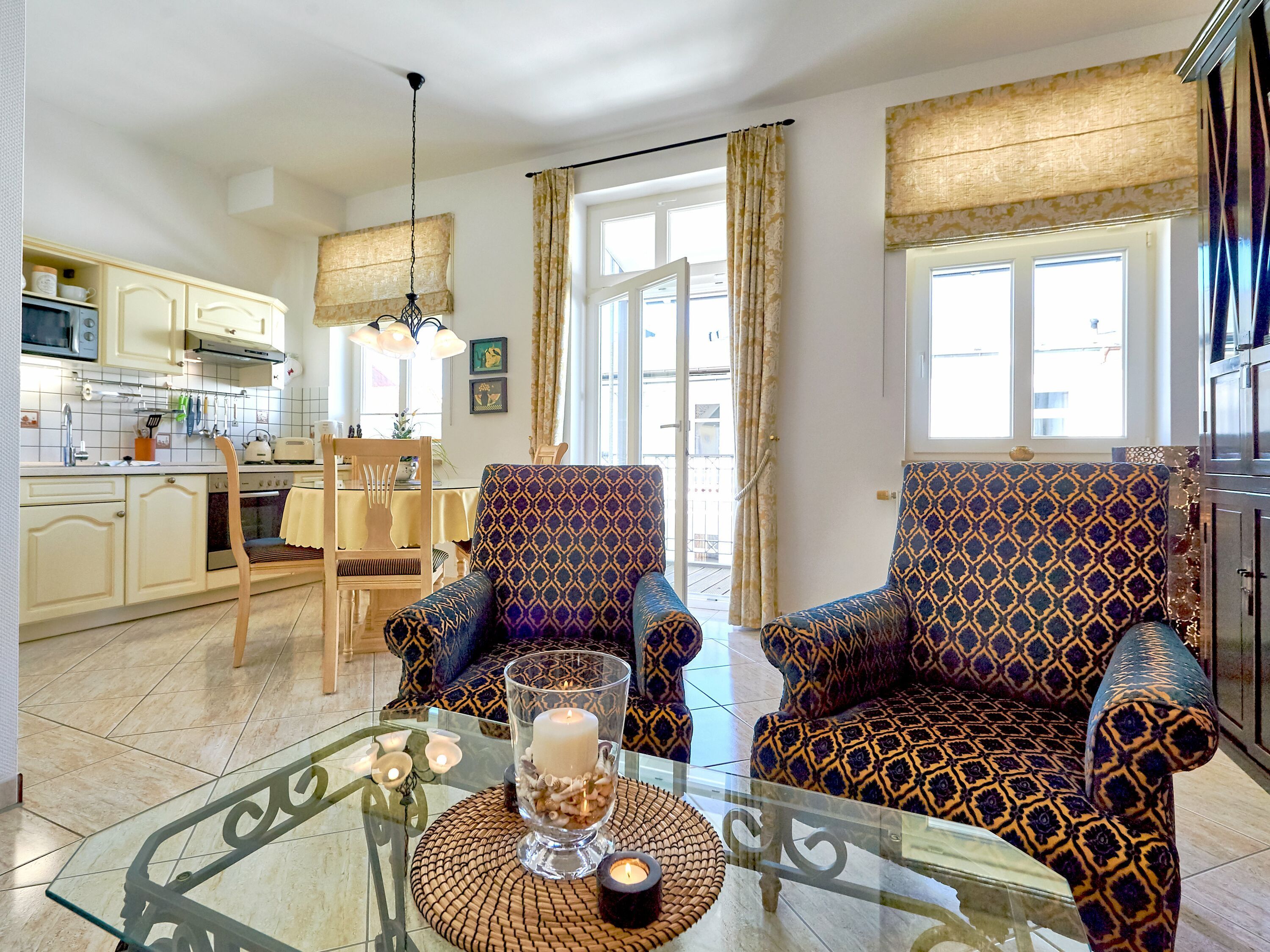 Die romantische Einrichtung dieser Wohnung verleiht eine besonders behagliche Wohlfühl-Atmosphäre. Der sehr großzügige Wohnraum verfügt über einen Loewe-TV inkl. Soundbar & Internetradio und einen DVD-Player. Eine gemütliche Couch und zwei bequeme Sessel laden zum Entspannen und Relaxen ein. Kostenfreies W-LAN ist natürlich auch vorhanden.