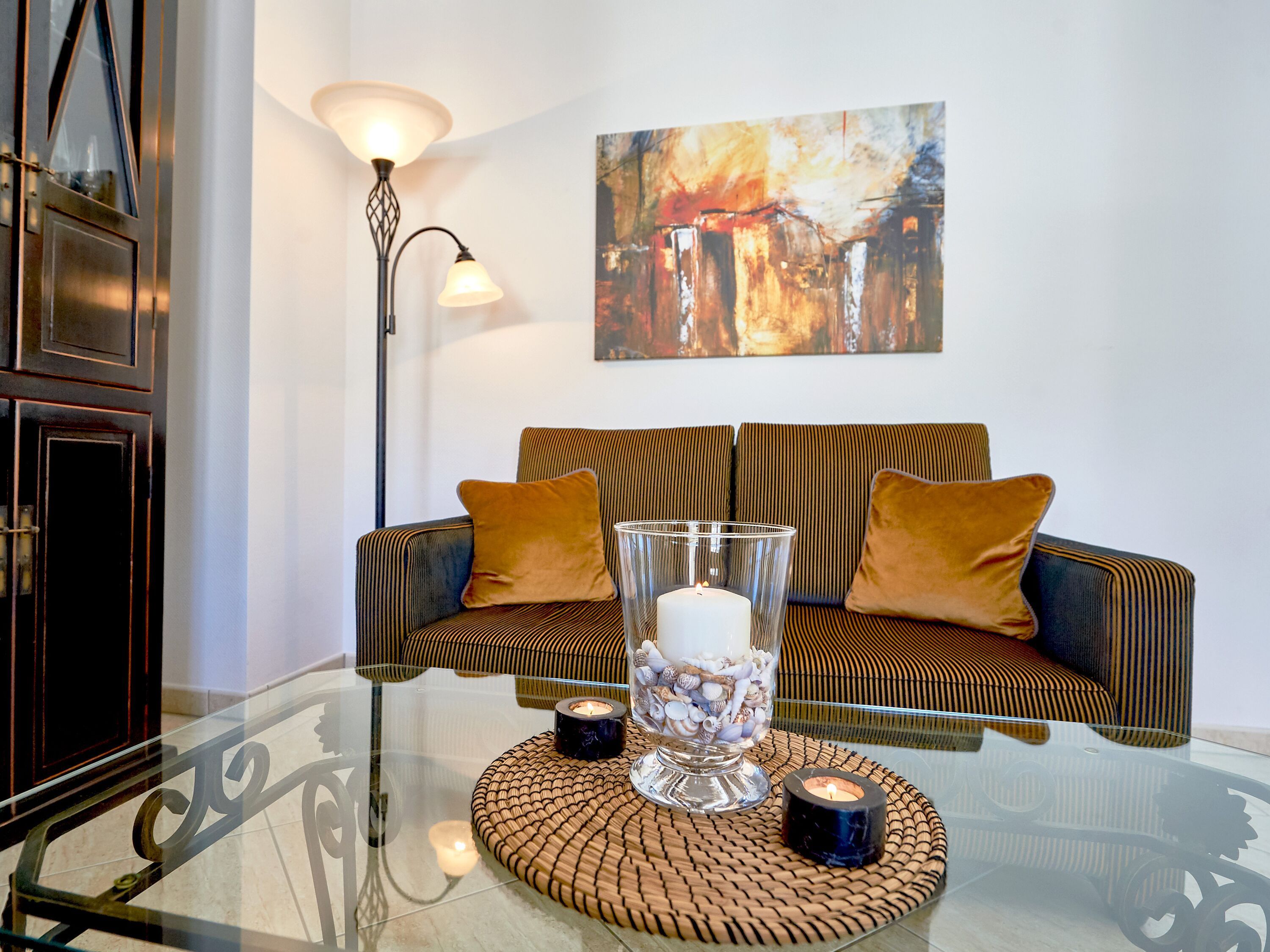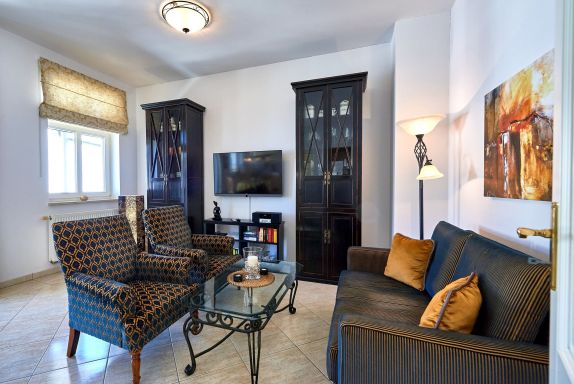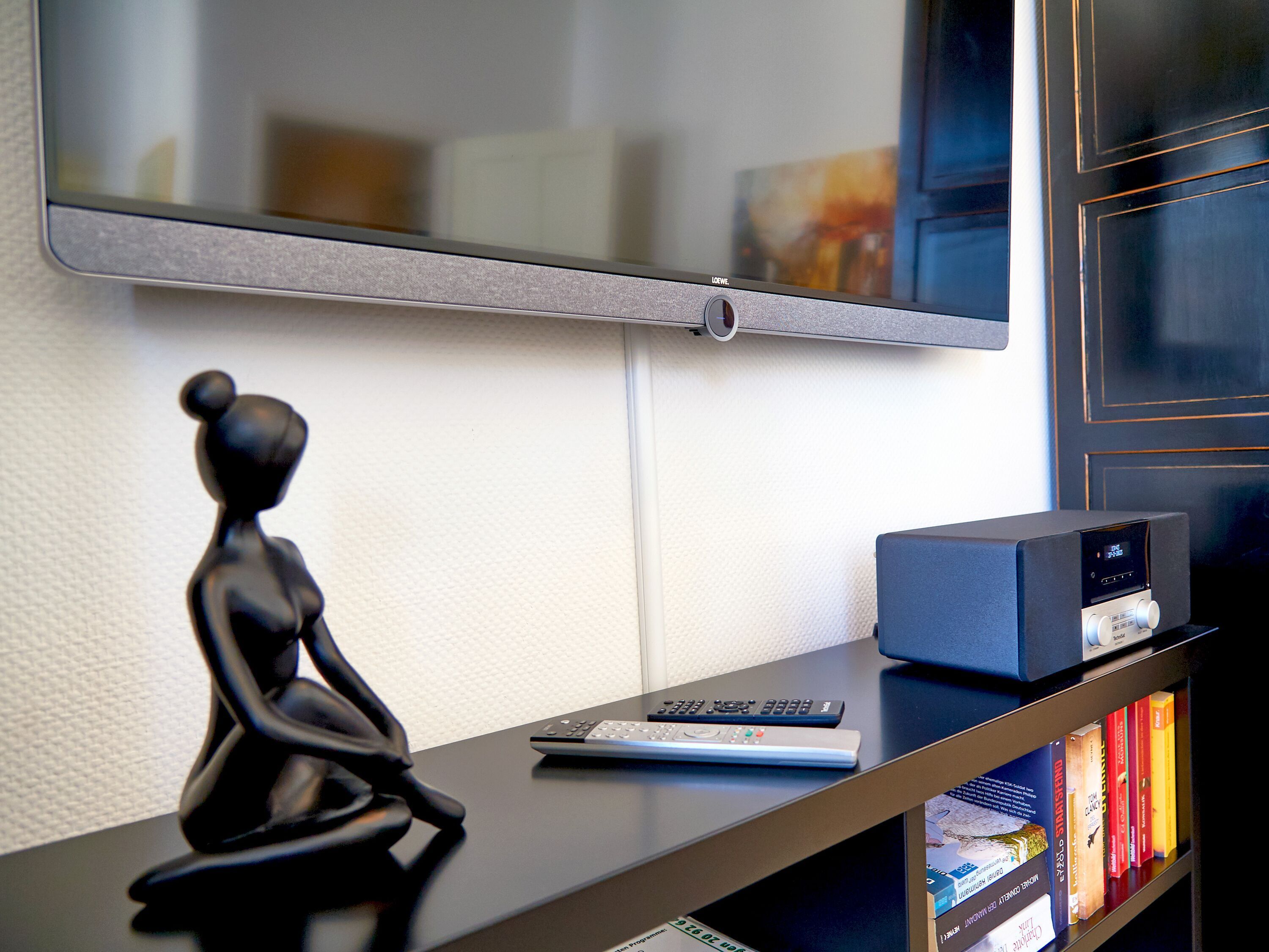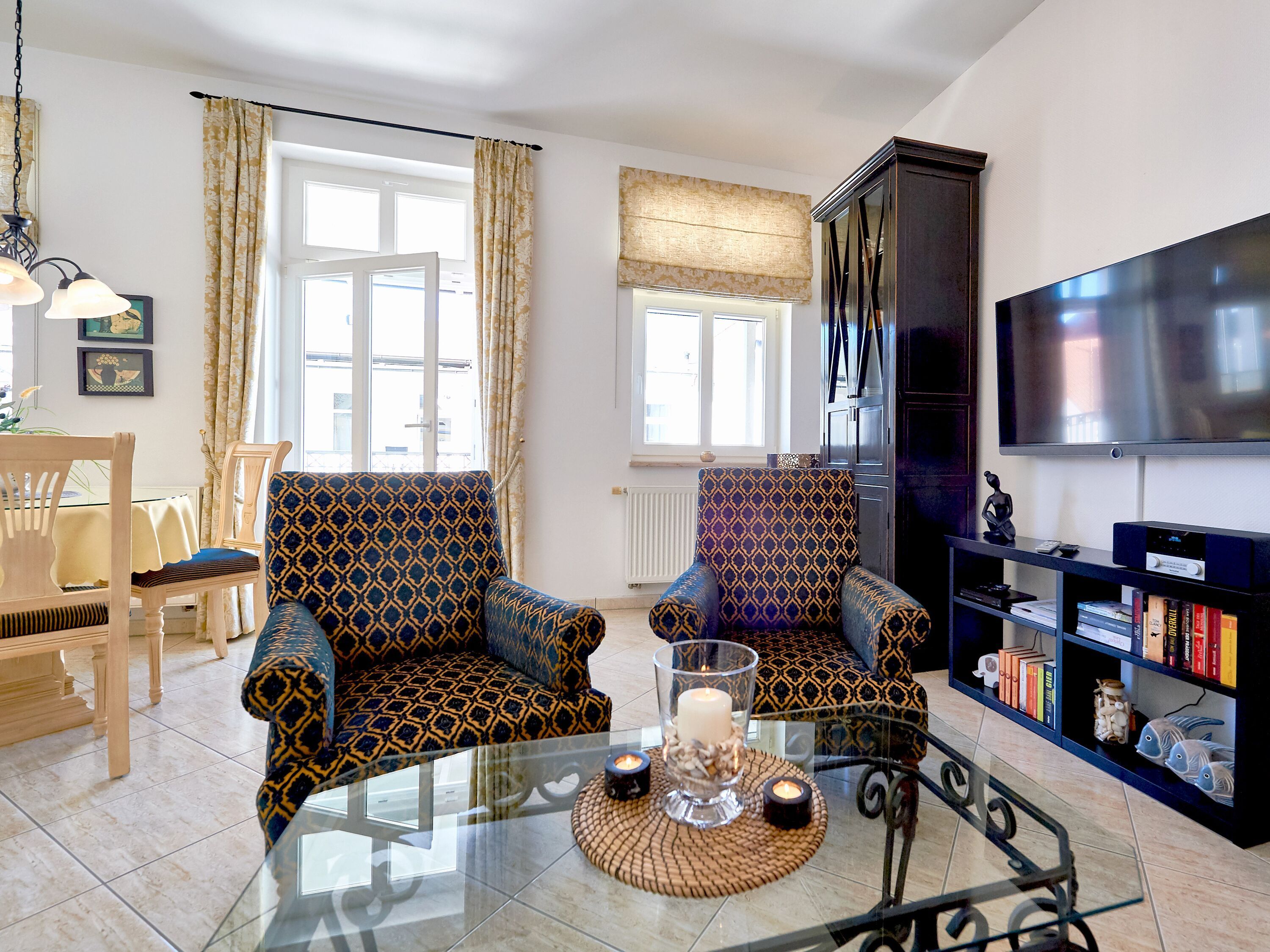 Die romantische Einrichtung dieser Wohnung verleiht eine besonders behagliche Wohlfühl-Atmosphäre. Der sehr großzügige Wohnraum verfügt über einen Loewe-TV inkl. Soundbar & Internetradio und einen DVD-Player. Eine gemütliche Couch und zwei bequeme Sessel laden zum Entspannen und Relaxen ein. Kostenfreies W-LAN ist natürlich auch vorhanden.