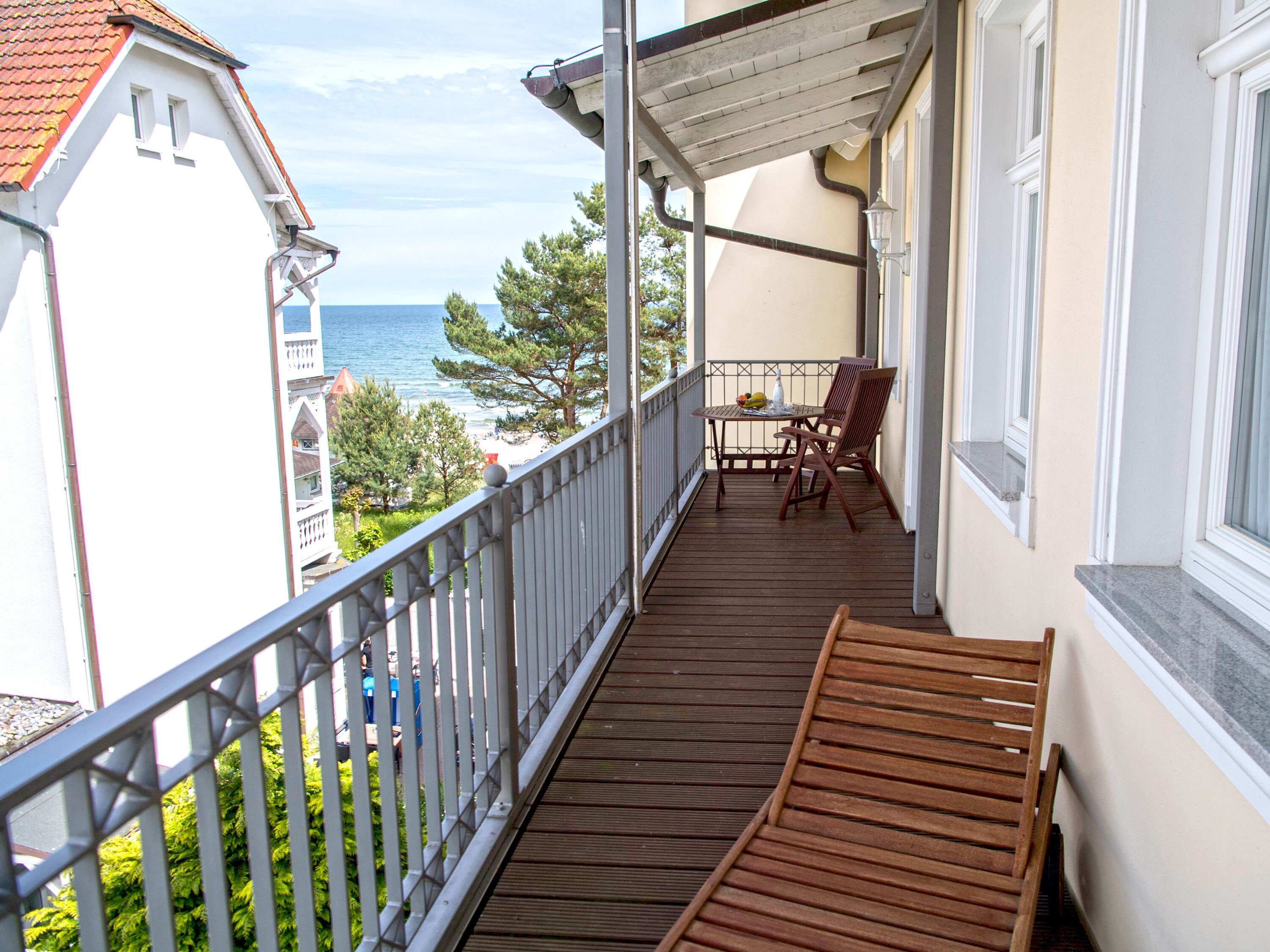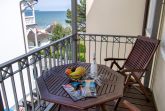 Eines der Highlights dieser Wohnung ist der 11 m lange möblierte Balkon mit seitlichem Meerblick. Dieser ist sowohl vom Wohn- als auch vom Schlafzimmer aus zu betreten und zusätzlich mit zwei Entspannungsliegen ausgestattet. Ab dem frühen Nachmittag bis in die Abendstunden können Sie hier die Sonnenstrahlen und natürlich auch das Meeresrauschen genießen.