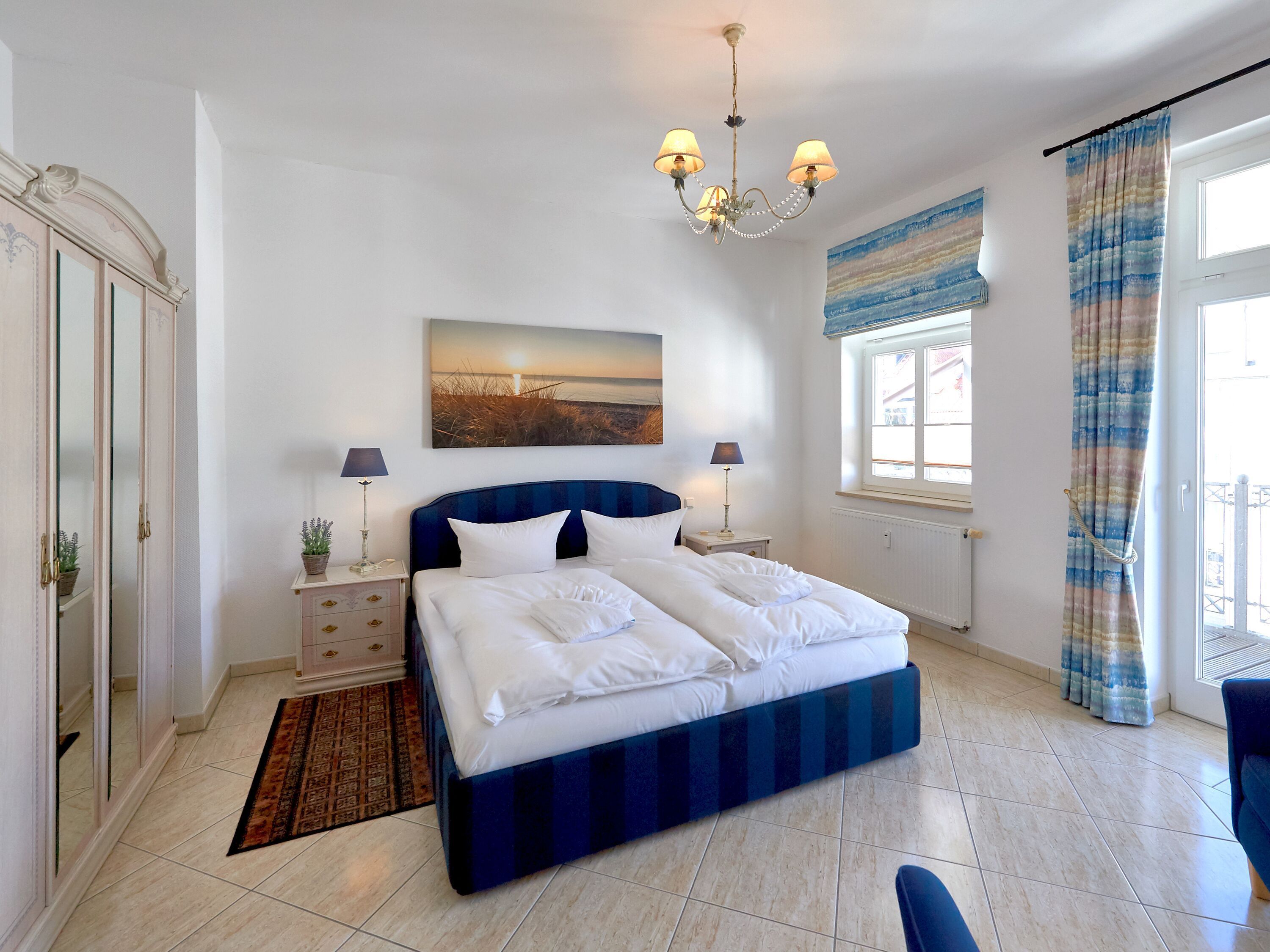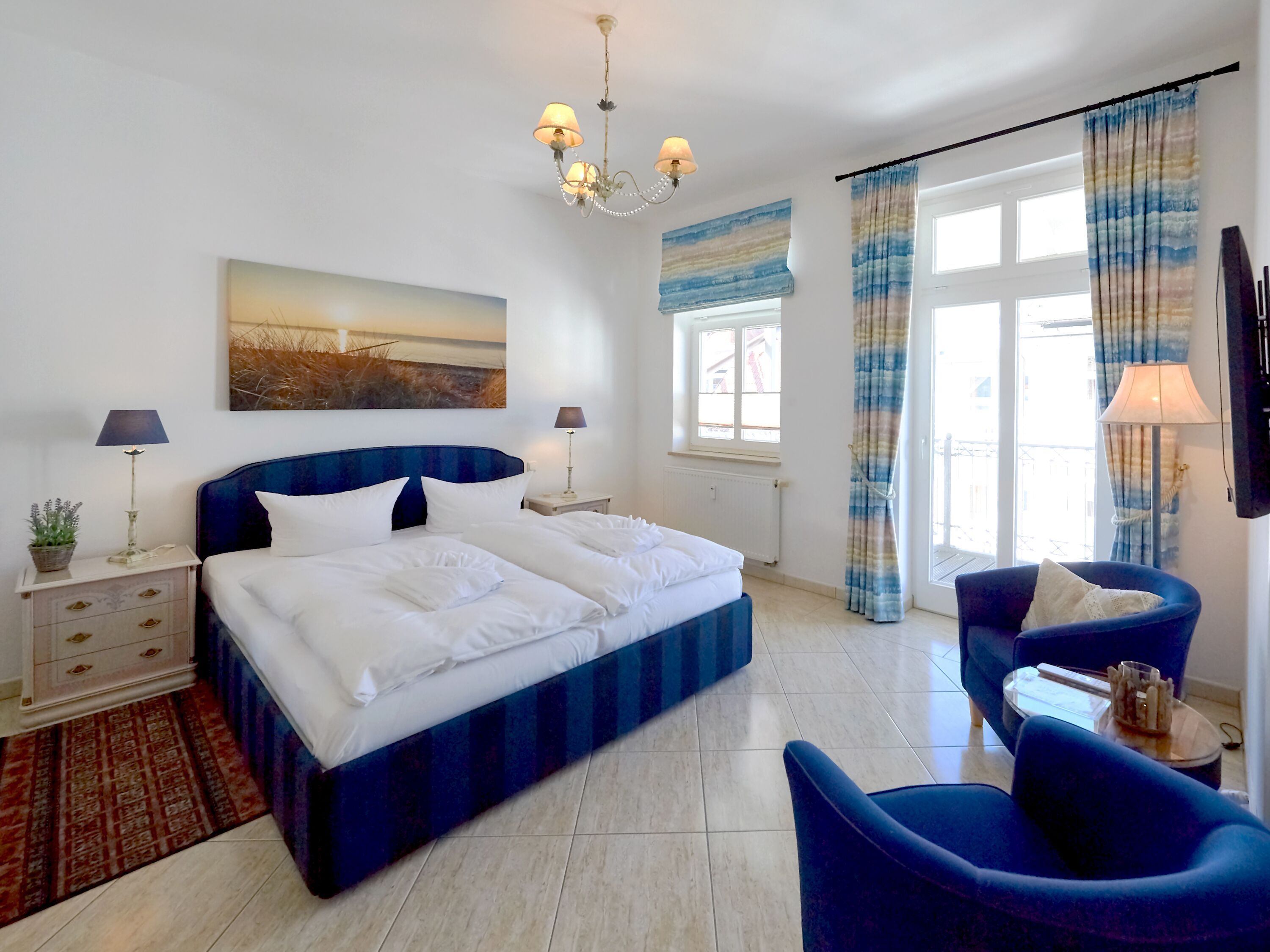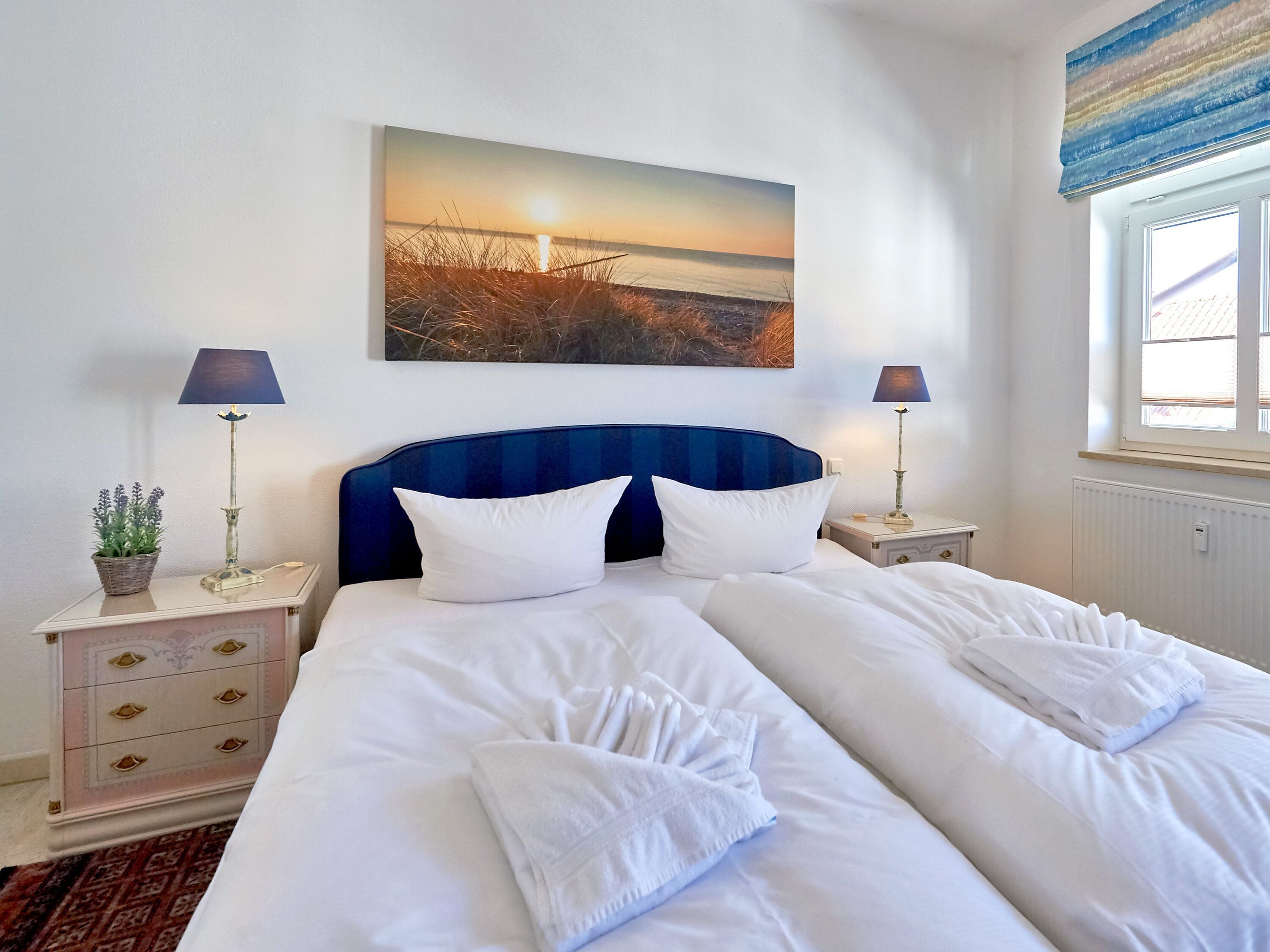 Im sehr geräumigen Schlafzimmer verspricht ein bequemes Doppelbett (1,80 x 2,00 m) süße Träume. Hier finden Sie auch einen Kleiderschrank mit ausreichend Platz für Ihre Urlaubsgarderobe, dazu einen kleinen Safe sowie einen weiteren Loewe-Fernseher.