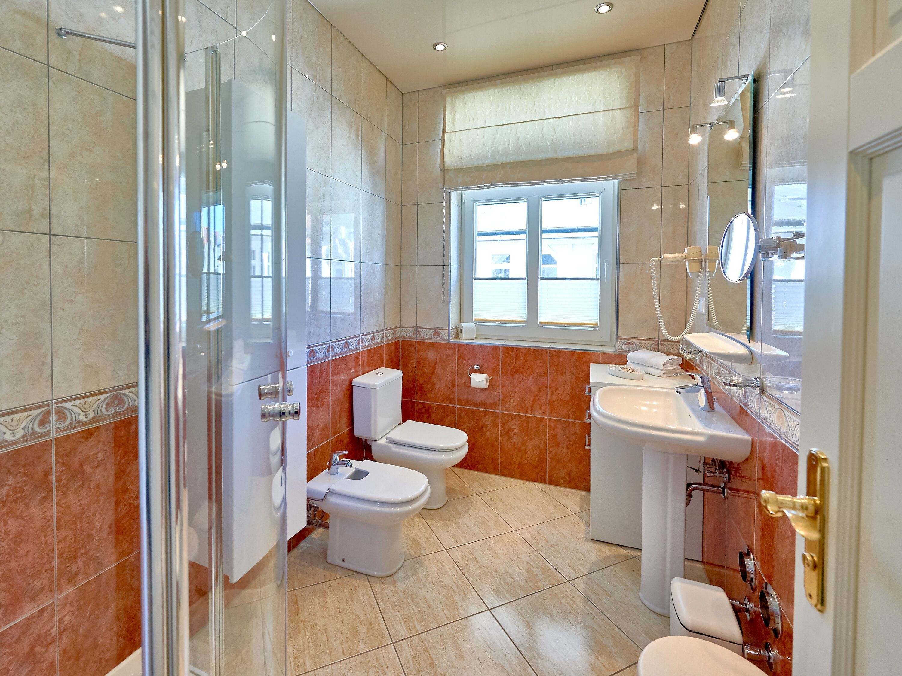 Das elegante Tageslichtbad überzeugt mit Dusche/WC plus Bidet und ist darüber hinaus mit einem beleuchteten Waschtisch mit Kosmetikspiegel und Haartrockner sowie einem beheizbaren Handtuchtrockner ausgestattet.