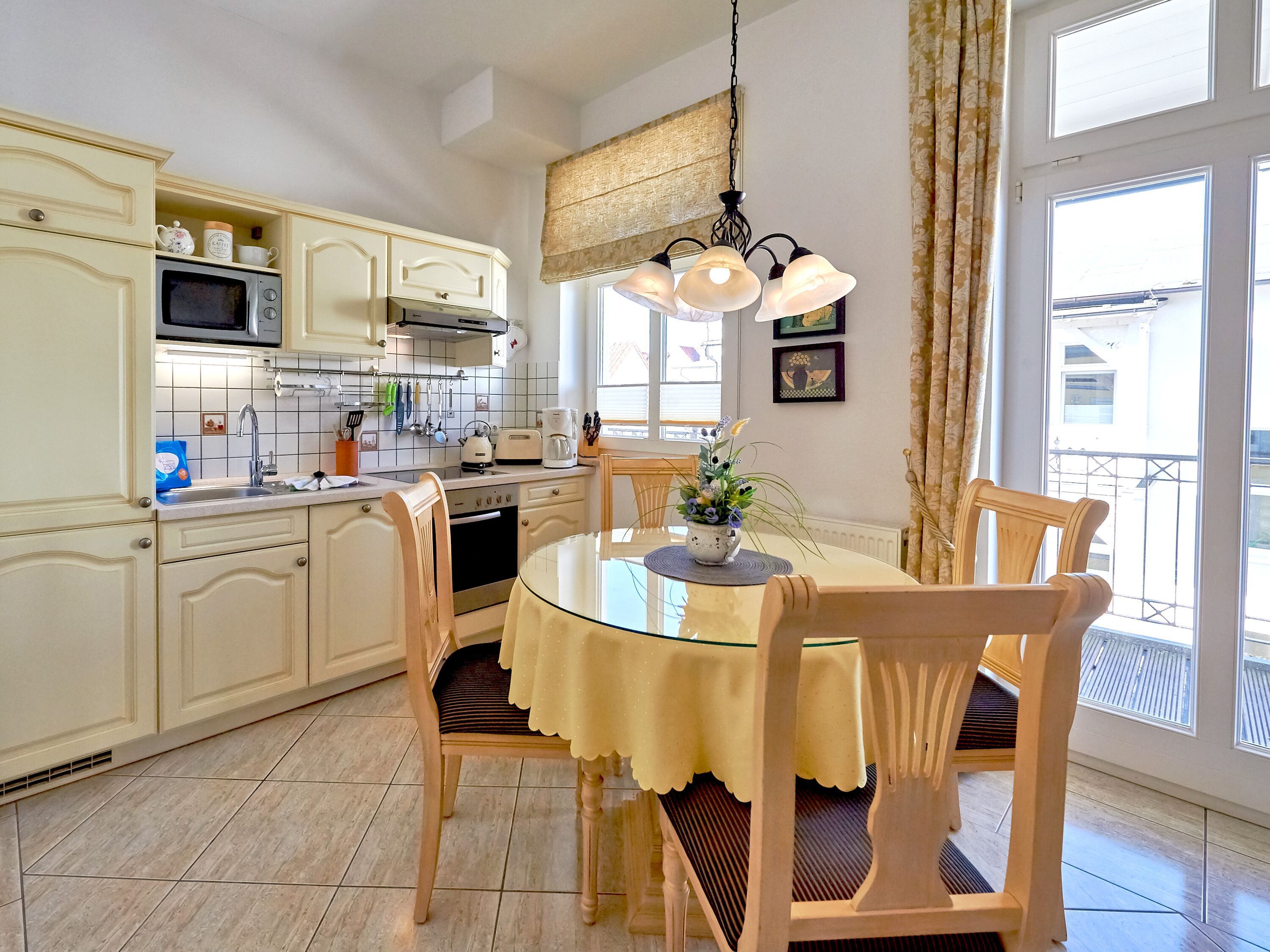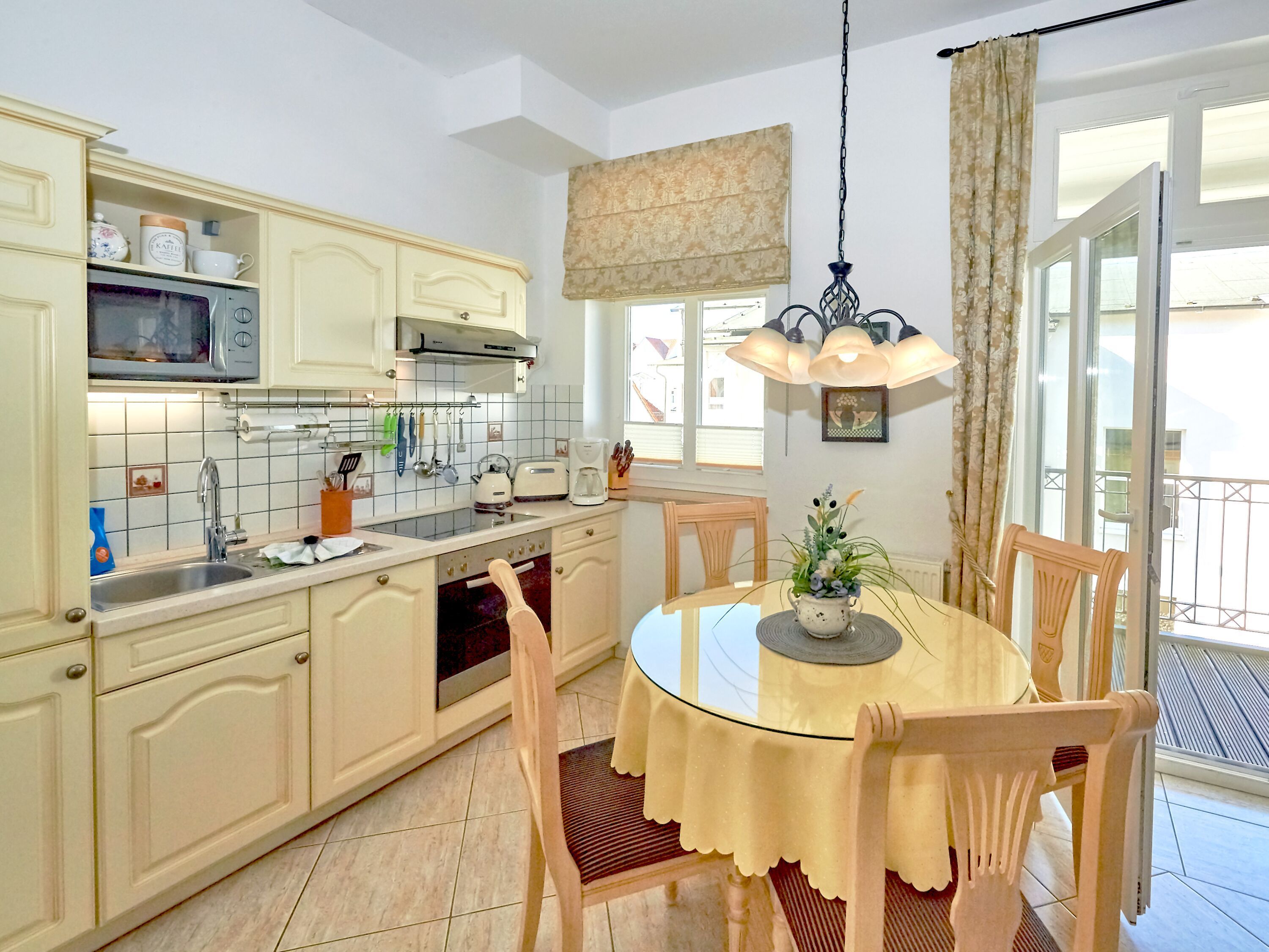 Die komplett ausgestattete Küchenzeile wurde harmonisch in den Wohnbereich integriert und ist mit einem Kühlschrank mit Gefrierfach, einem 4-Zonen-Cerankochfeld, einem Backofen, einem Geschirrspüler, einer Filterkaffee-Maschine sowie Wasserkocher, Toaster, Mikrowelle und diversem Kleininventar ausgestattet. Der große Esstisch bietet ausreichend Platz.