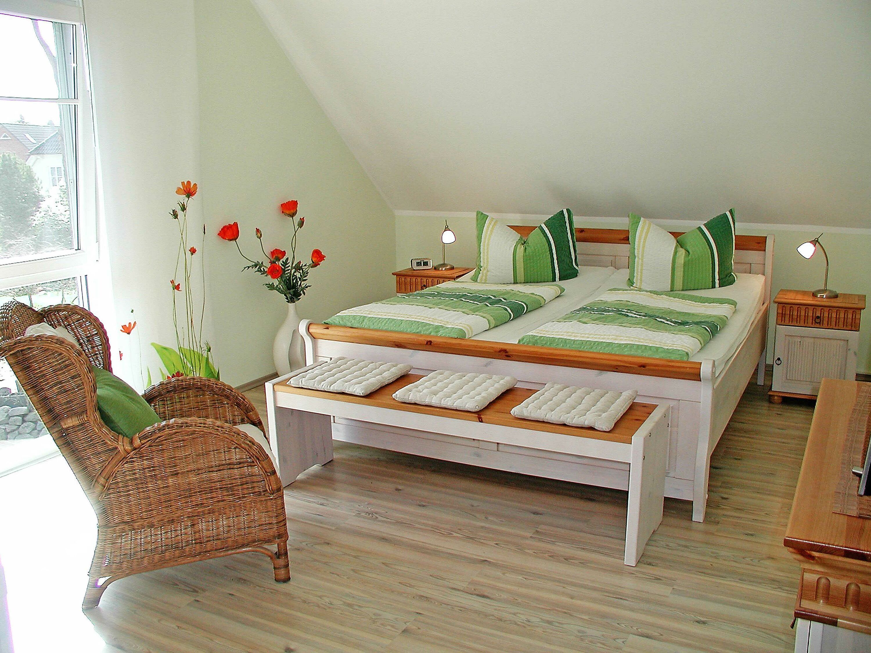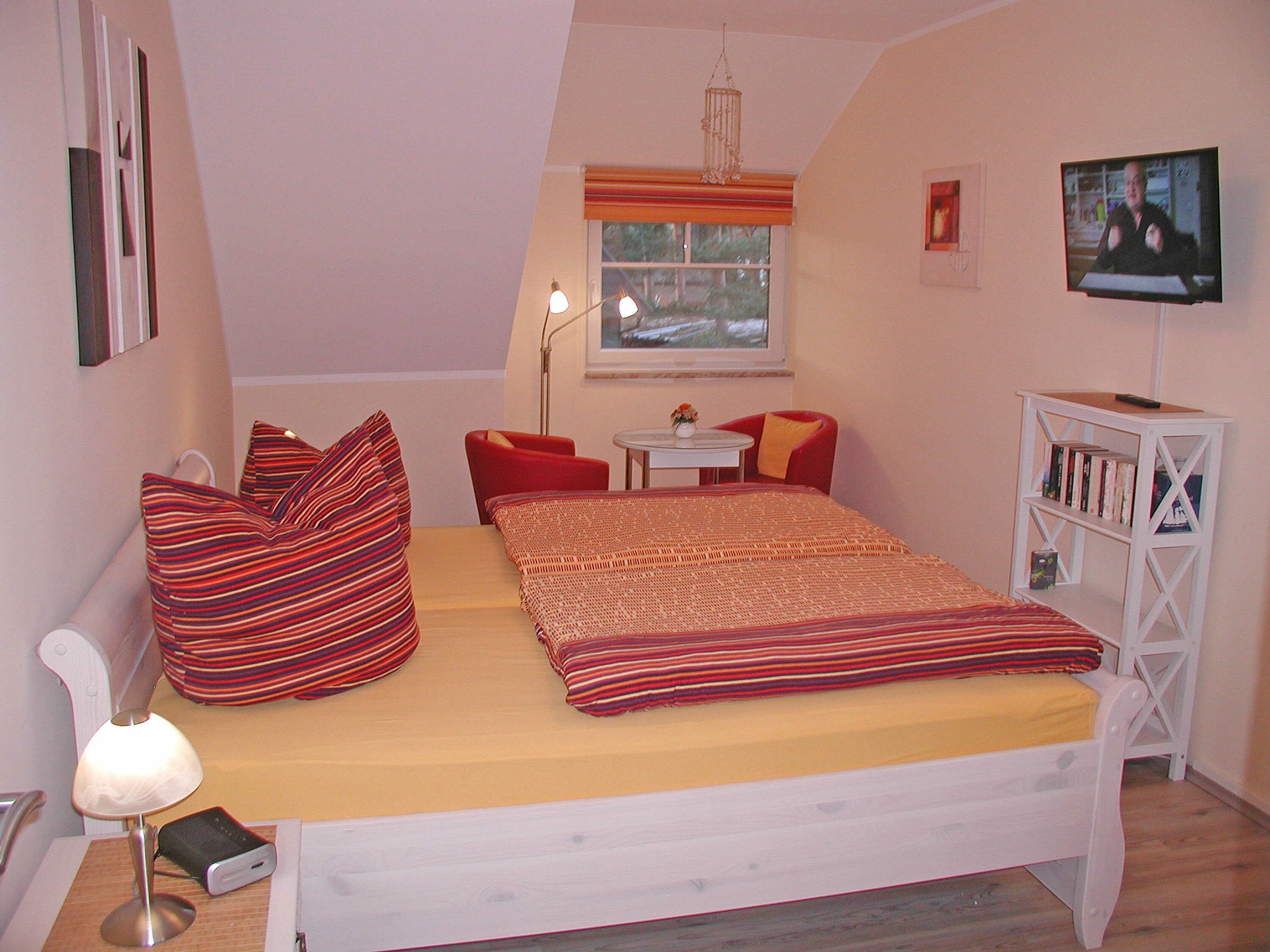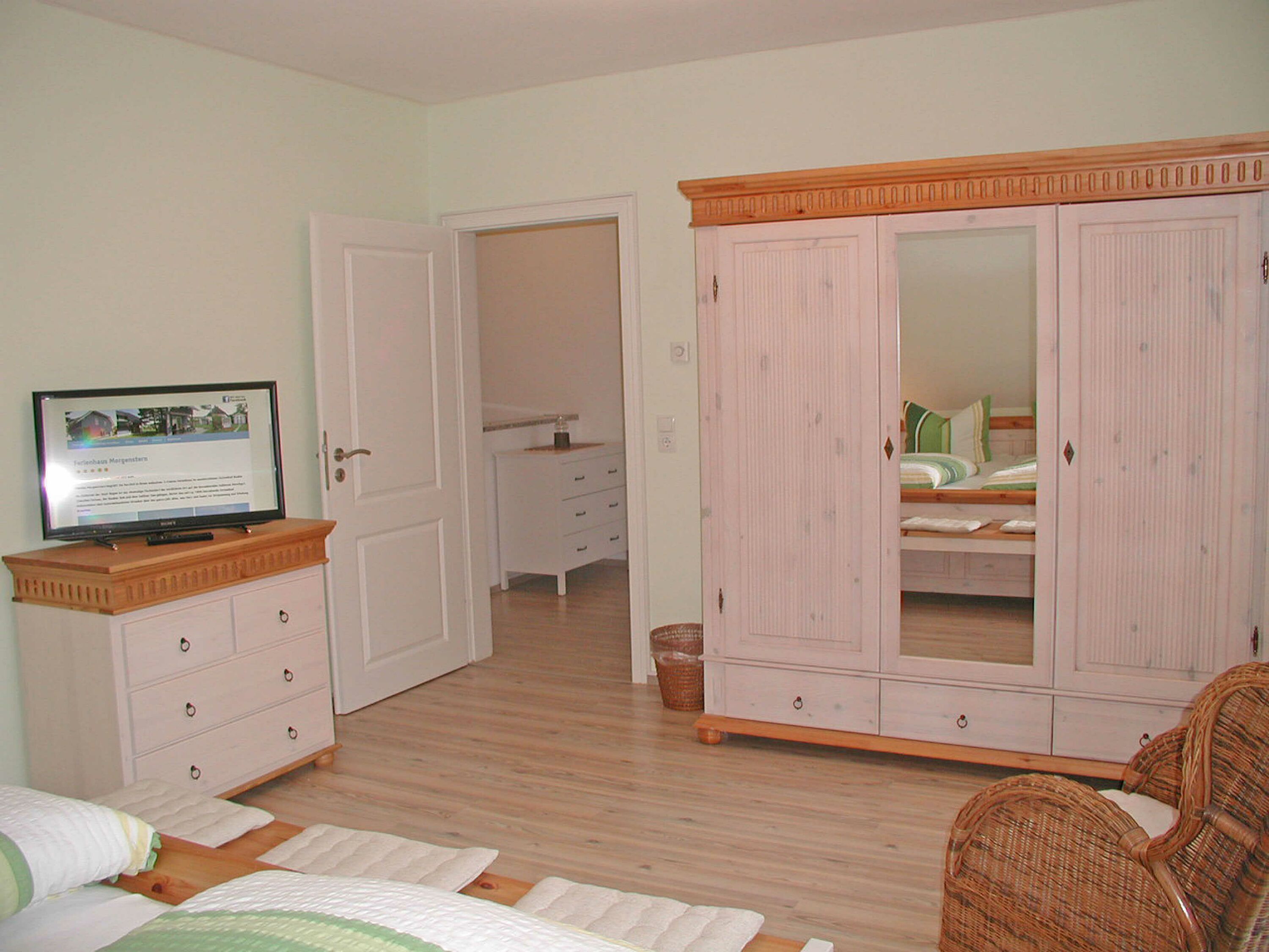 Das zweite Schlafzimmer ist ausgestattet mit einem Doppelbett (1,80 x 2m), zwei Nachtschränkchen mit Lampen, einem Reisekinderbett (60x120cm), Radiowecker, Kleiderschrank, einer Sitzgruppe (2 Sessel, 1 Tisch), Leselampe, Bücherregal mit Büchern, Kleiderdiener und Smart-TV.