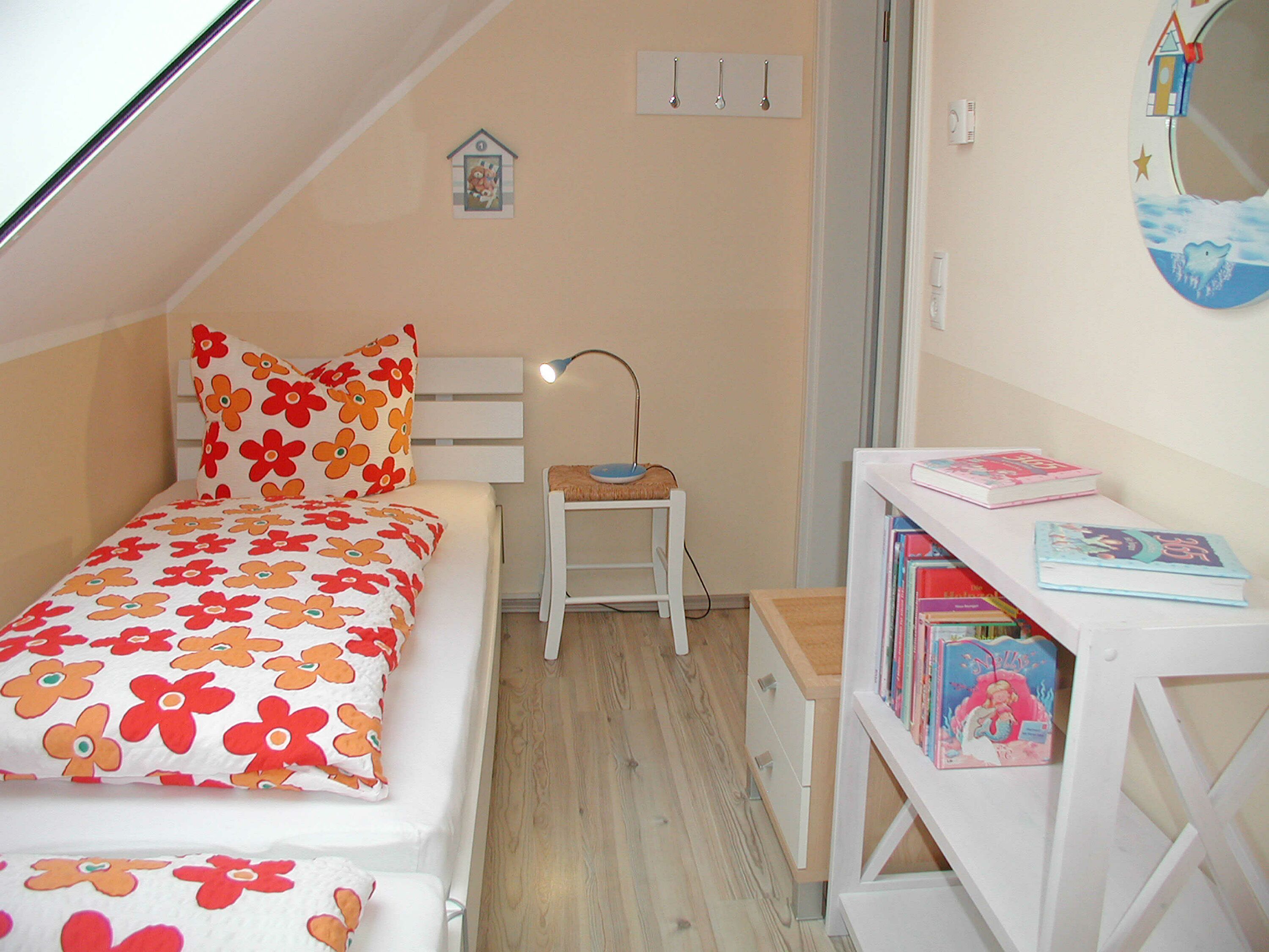 Im Kinderzimmer stehen zwei Betten (90 x 200 cm), ein Kleiderschrank, zwei Nachtschränkchen mit Leselampen, zwei Hocker und ein Bücherregal mit Kinderbüchern zur Verfügung.
