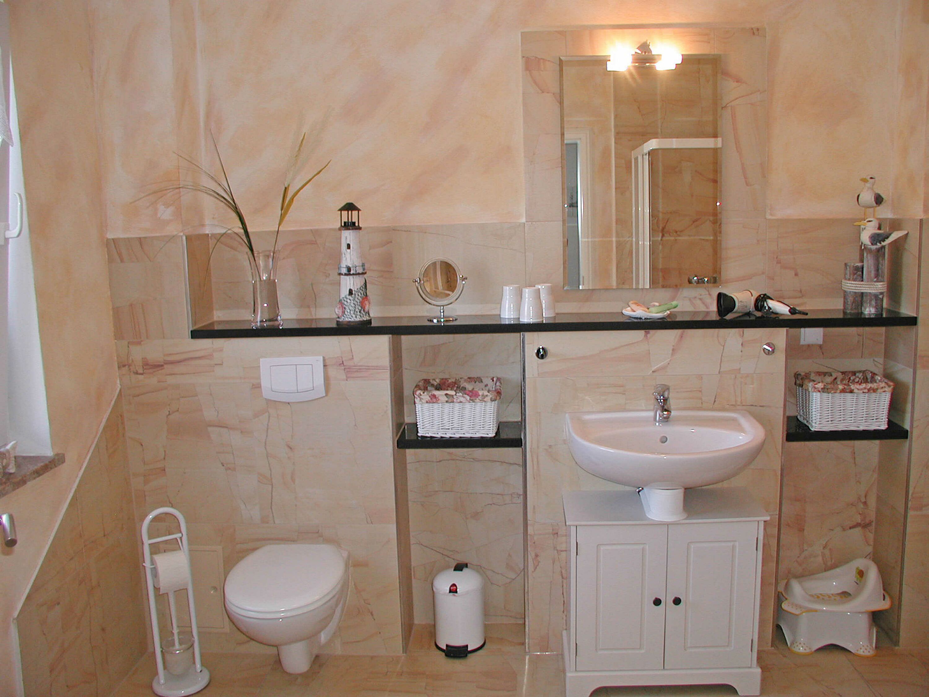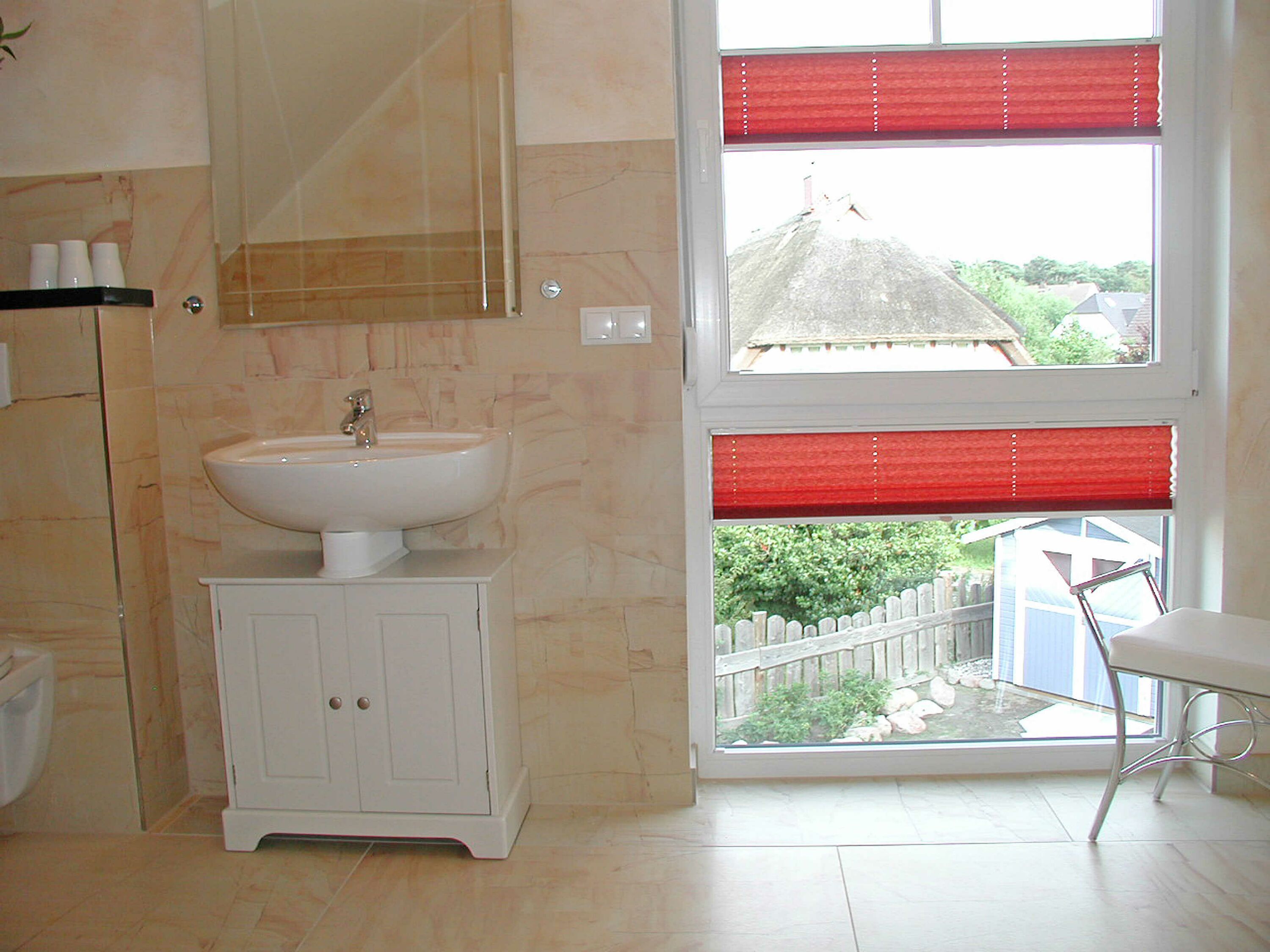 Im Erdgeschoss befindet sich ein Badezimmer mit Dusche, WC, Handtuchtrockner, Waschtisch und Fön. Das Badezimmer im Obergeschoss ist zusätzlich mit einer Regen- und Massagedusche sowie einer Badewanne ausgestattet. Die mit edlen Wood Teak Fliesen ausgestatteten Bäder runden das besondere Ambiente der Bäder in herausragender Weise ab.