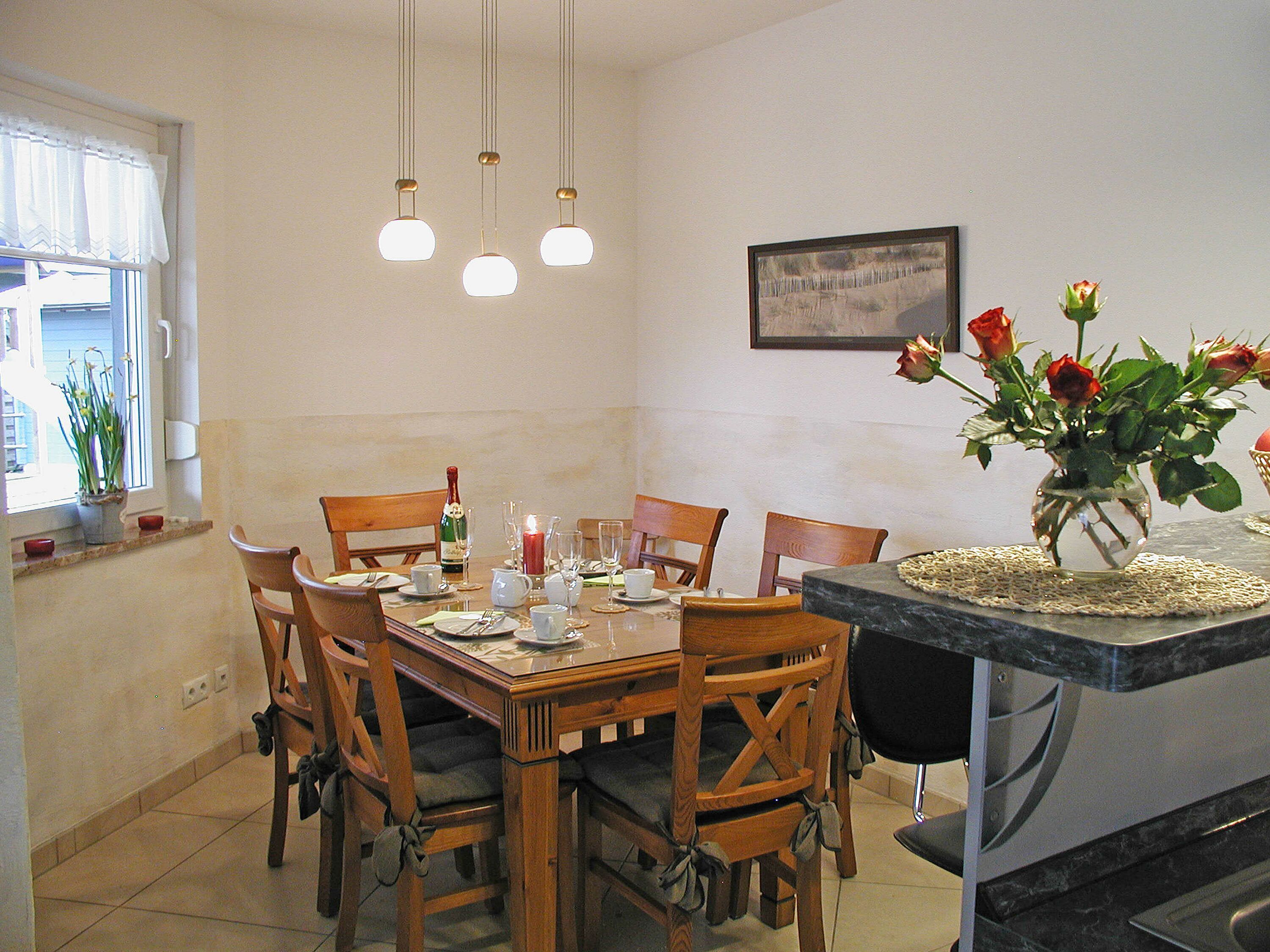 Die Küche überzeugt mit einem Cerankochfeld, Backofen, Geschirrspüler, Mikrowelle, Kühlschrank mit Gefrierfach, Kaffeemaschine, Toaster, Wasserkocher, Rührgerät, Waffeleisen, Stabmixer und allem notwendigen Geschirr. Der separate Esstisch bietet Platz für die ganze Familie. Die teilüberdachte Terrasse vor dem Wohnraum lädt zu entspannten Mahlzeiten im Freien ein. Auf dem Holzkohlegrill kann man sich auch einmal eine deftige Mahlzeit zubereiten.