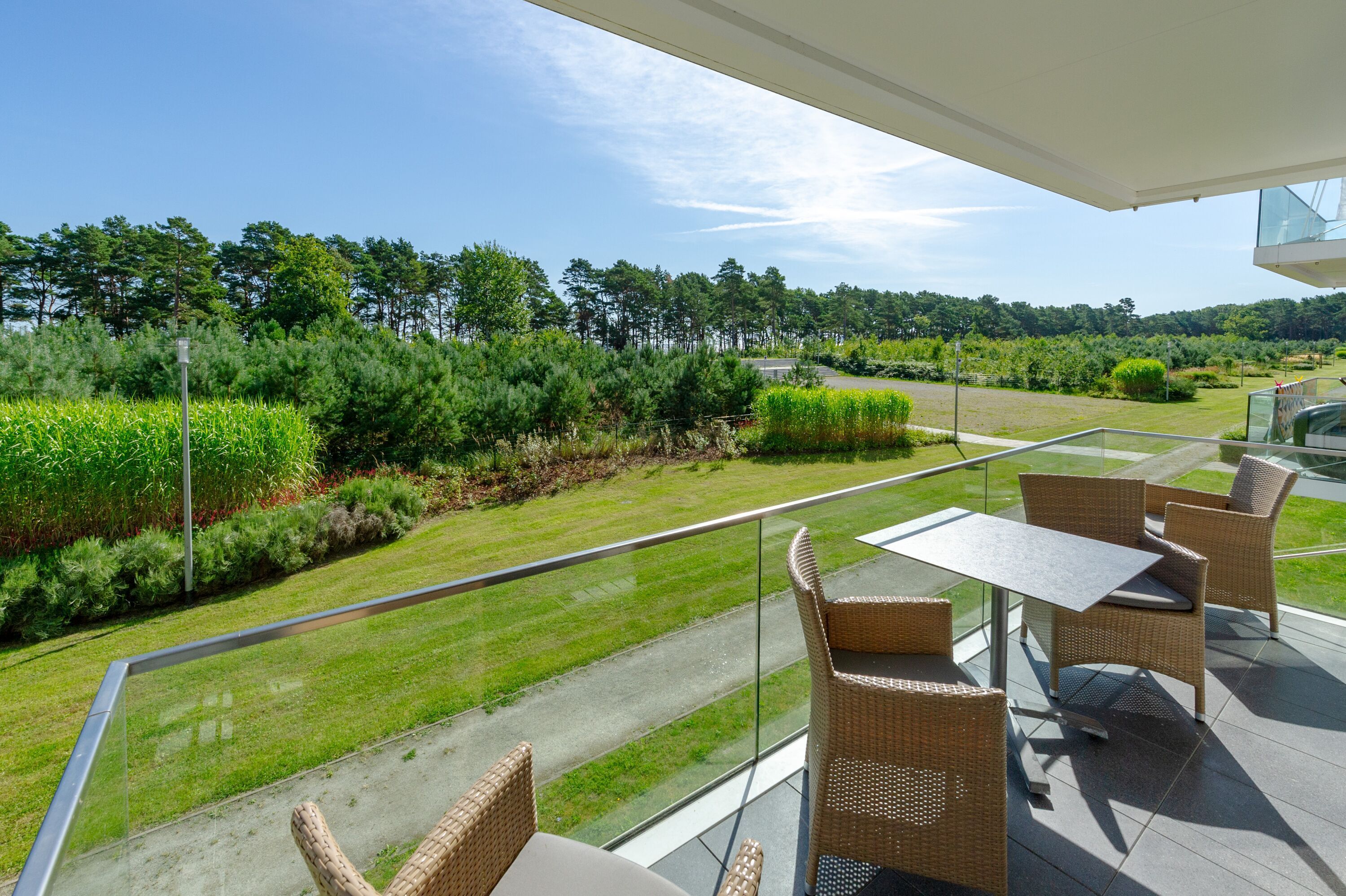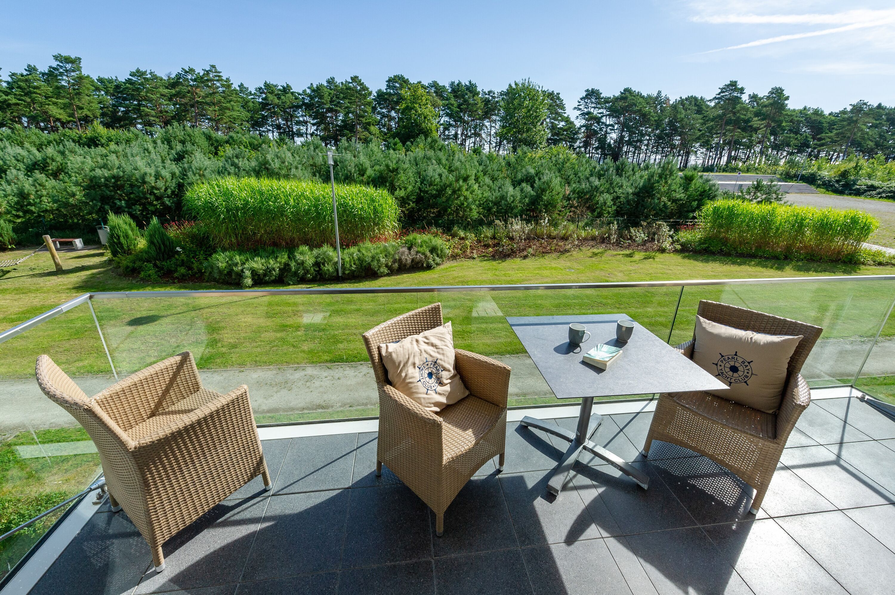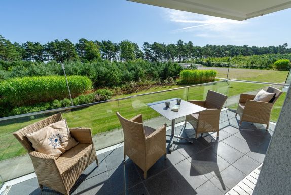 Der dem Wohnzimmer vorgelagerte Balkon ist ca. 10 m² groß und eröffnet Ihnen einen schönen Ausblick auf die gepflegte Grünanlage, das Dünenwäldchen und das schier endlose Meer. Die Balkonmöbel stehen saisonal - in der Regel von Mai bis Ende September - zur Verfügung.
