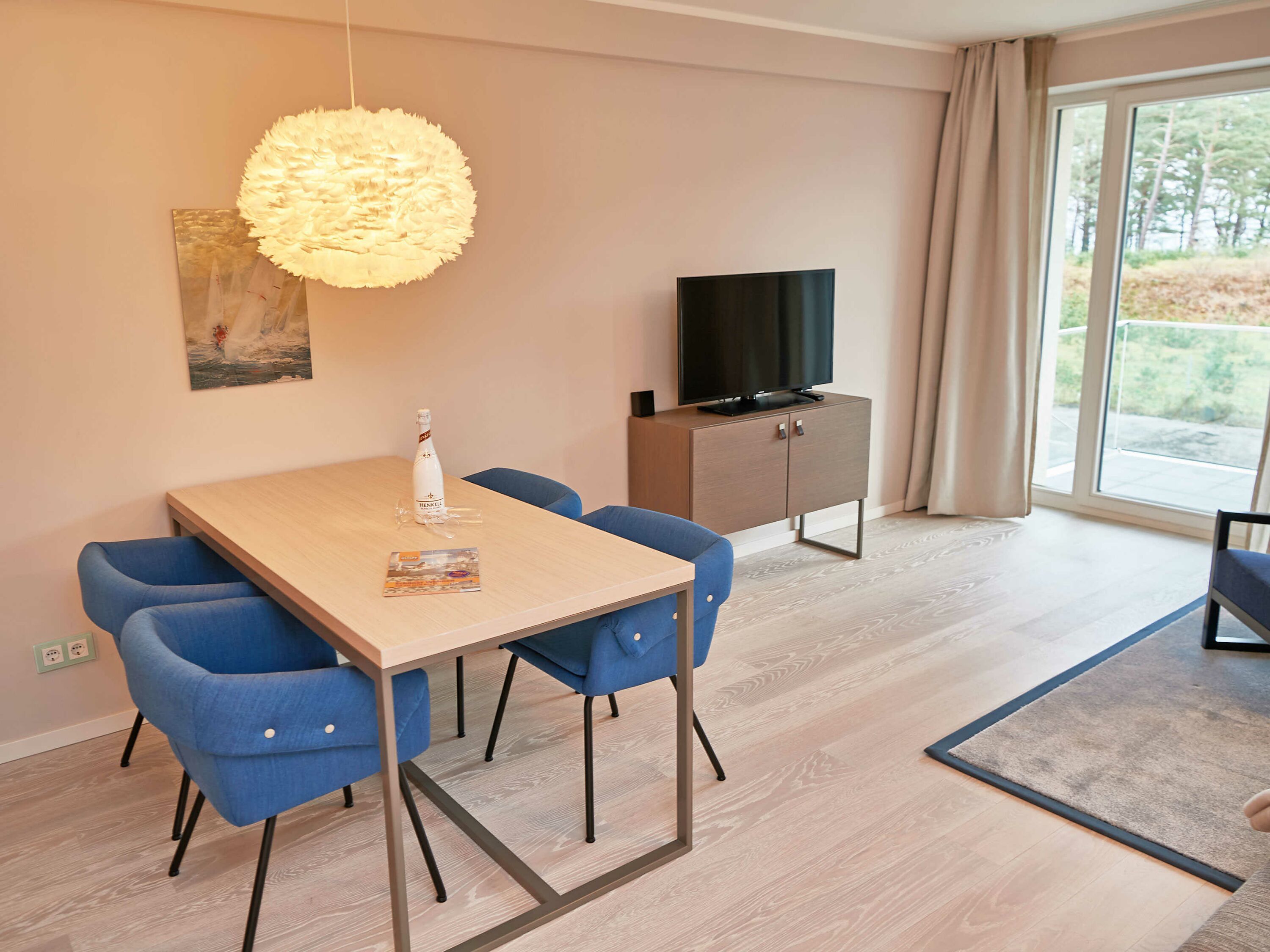 Vom Eingangsbereich aus gelangen Sie in den modern ausgestatteten Wohnbereich mit Couchgarnitur sowie einem Essplatz für bis zu 4 Personen und einer separierten Küchenzeile. Im Wohnbereich finden Sie einen Flachbild-Fernseher mit Home Cinema System, Radio und Blu-ray/DVD/CD Player.