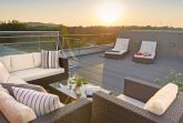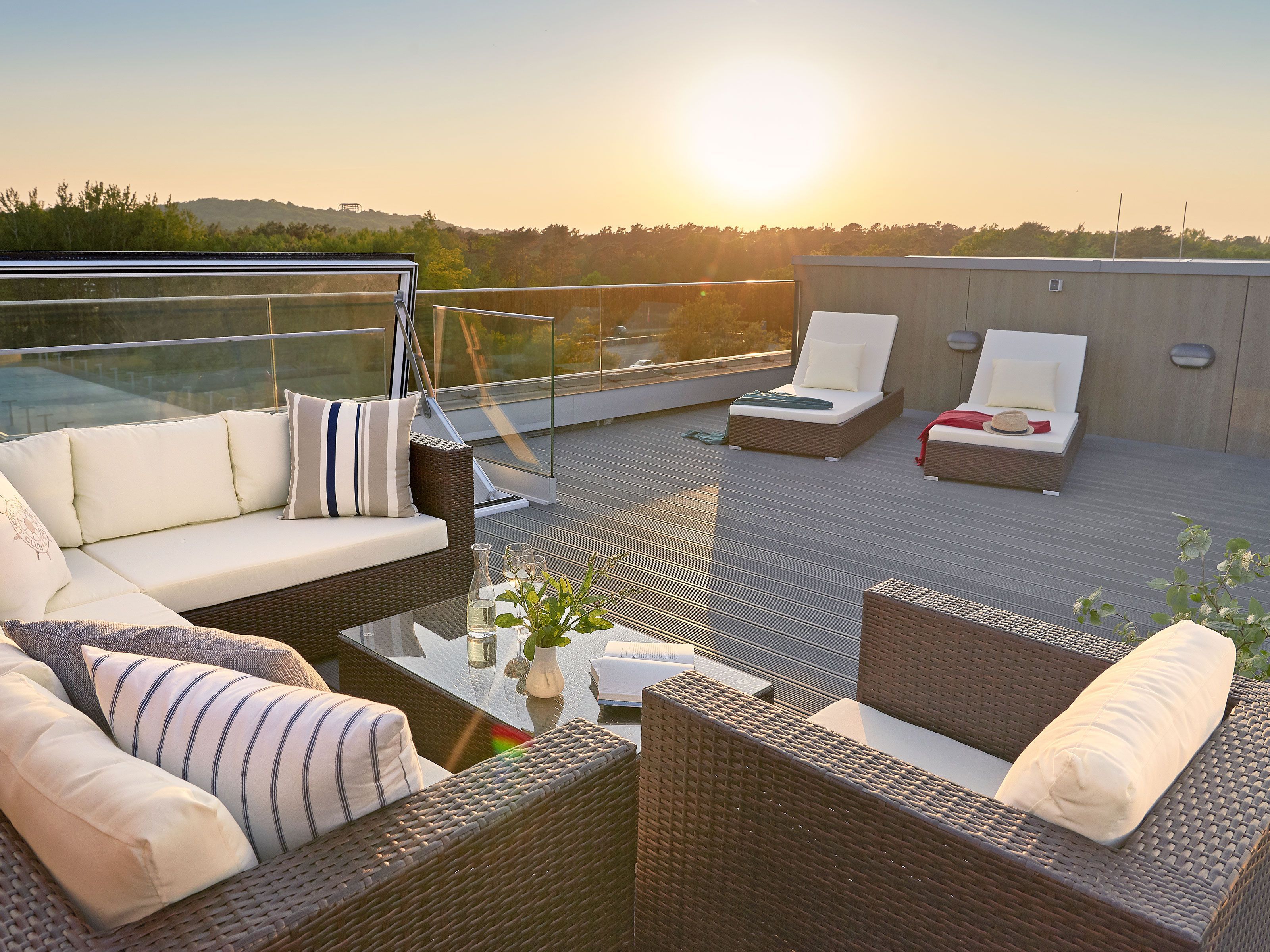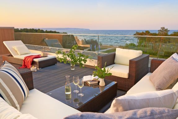 Im Obergeschoss des Hauses - ganz bequem mit dem Fahrstuhl zu erreichen - erwartet Sie das Penthouse Prora mit 101 m² Wohnfläche, einem großen Balkon und zusätzlich einer 35 m² großen Dachterrasse mit einem traumhaften, unverbauten Blick auf die Ostsee. Ob Familie oder Freunde, hier können Sie Gemeinsam Urlaub erleben und Privatsphäre genießen! Die Balkon- bzw. Terrassenmöbel stehen saisonal - in der Regel von Mai bis Ende September - zur Verfügung.