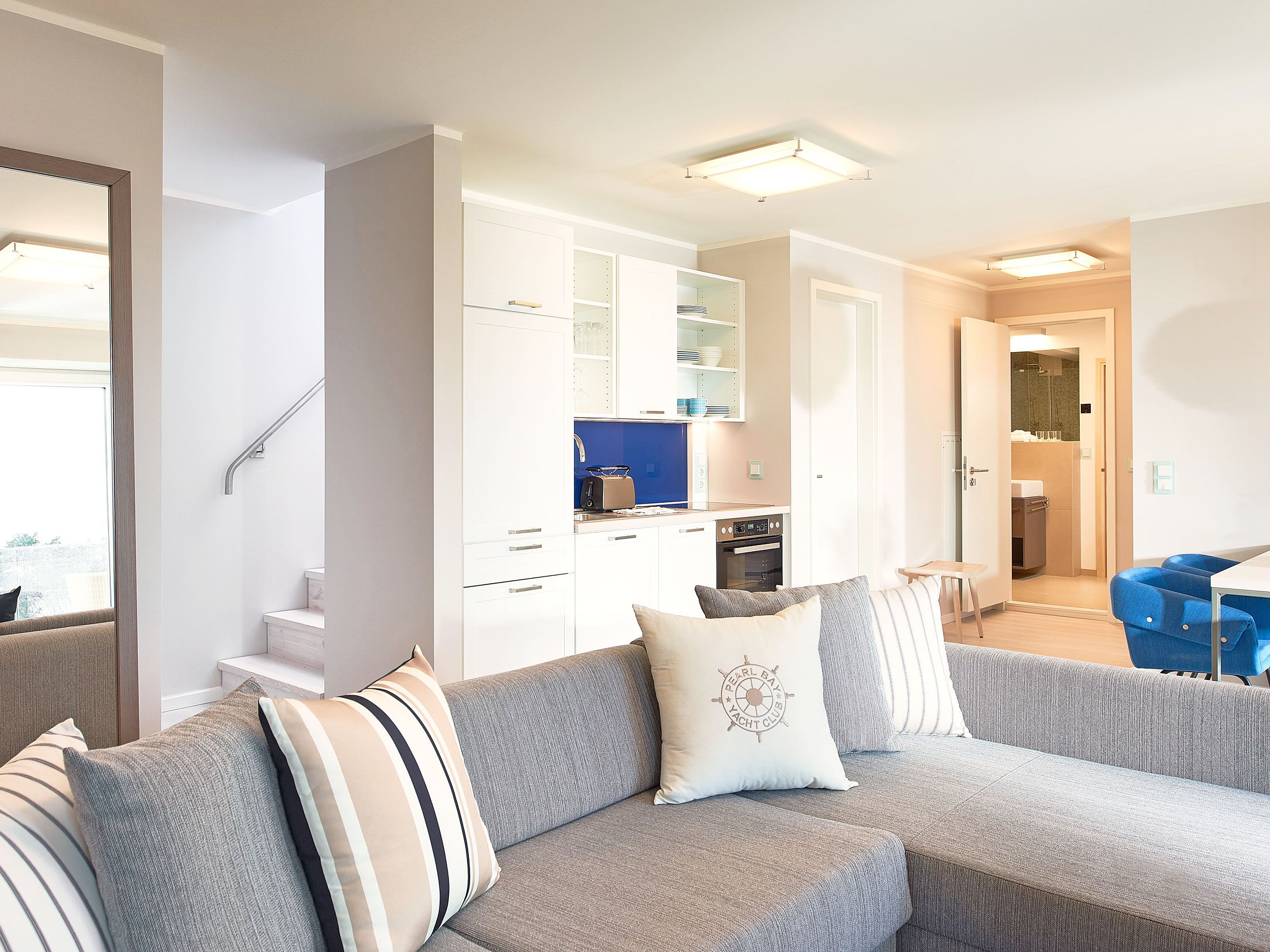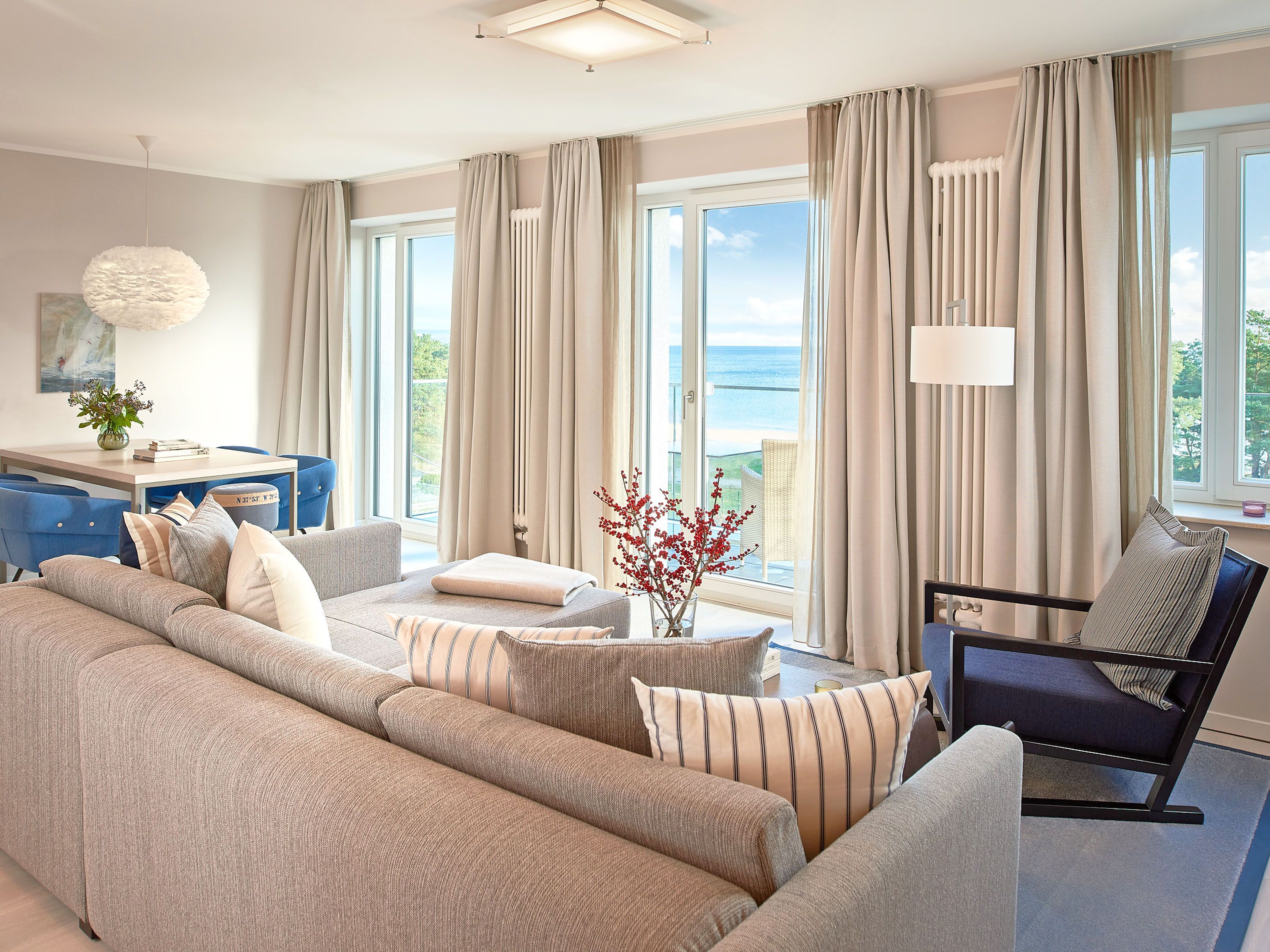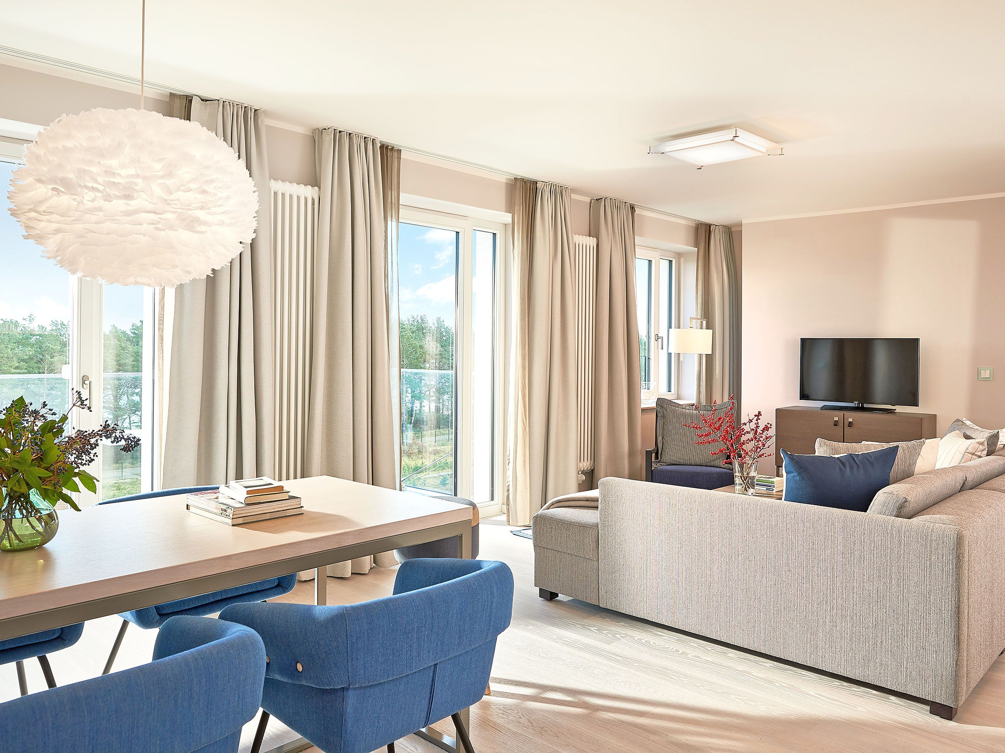 Im modern ausgestatteten, lichtdurchfluteten, großen Wohnzimmer mit hochwertigen Möbeln erwarten Sie eine gemütliche Sitzecke und ein großer Flachbild-TV. Ein W-LAN-Internetzugang steht Ihnen kostenfrei zur Verfügung.