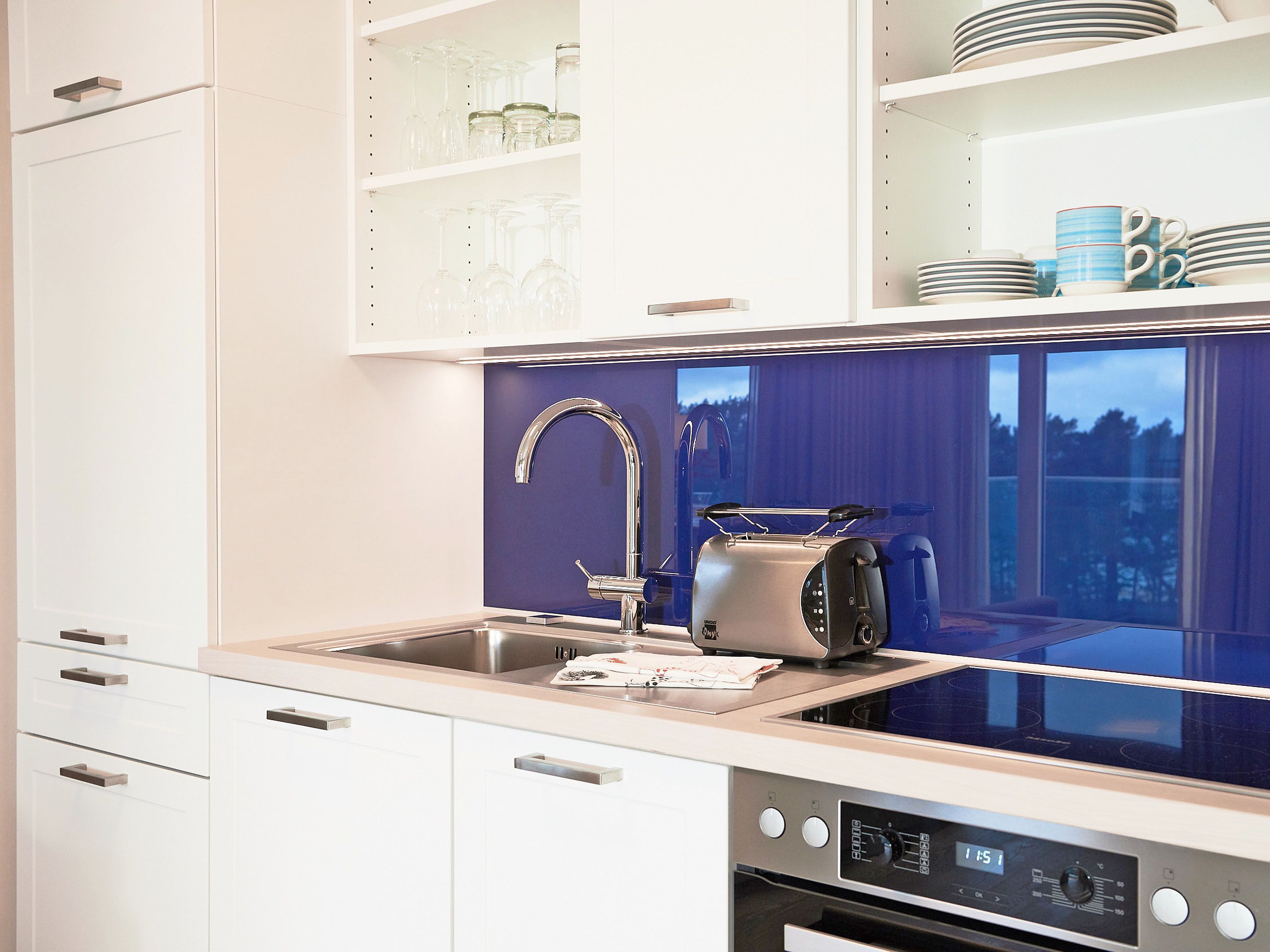 Die komplett ausgestattete, harmonisch in den Essbereich integrierte Einbauküche mit Backofen, Kühlschrank mit Gefrierfach, Geschirrspülmaschine, Kaffeemaschine, Toaster, Wasserkocher und diversem Kleininventar lässt keine Wünsche offen.