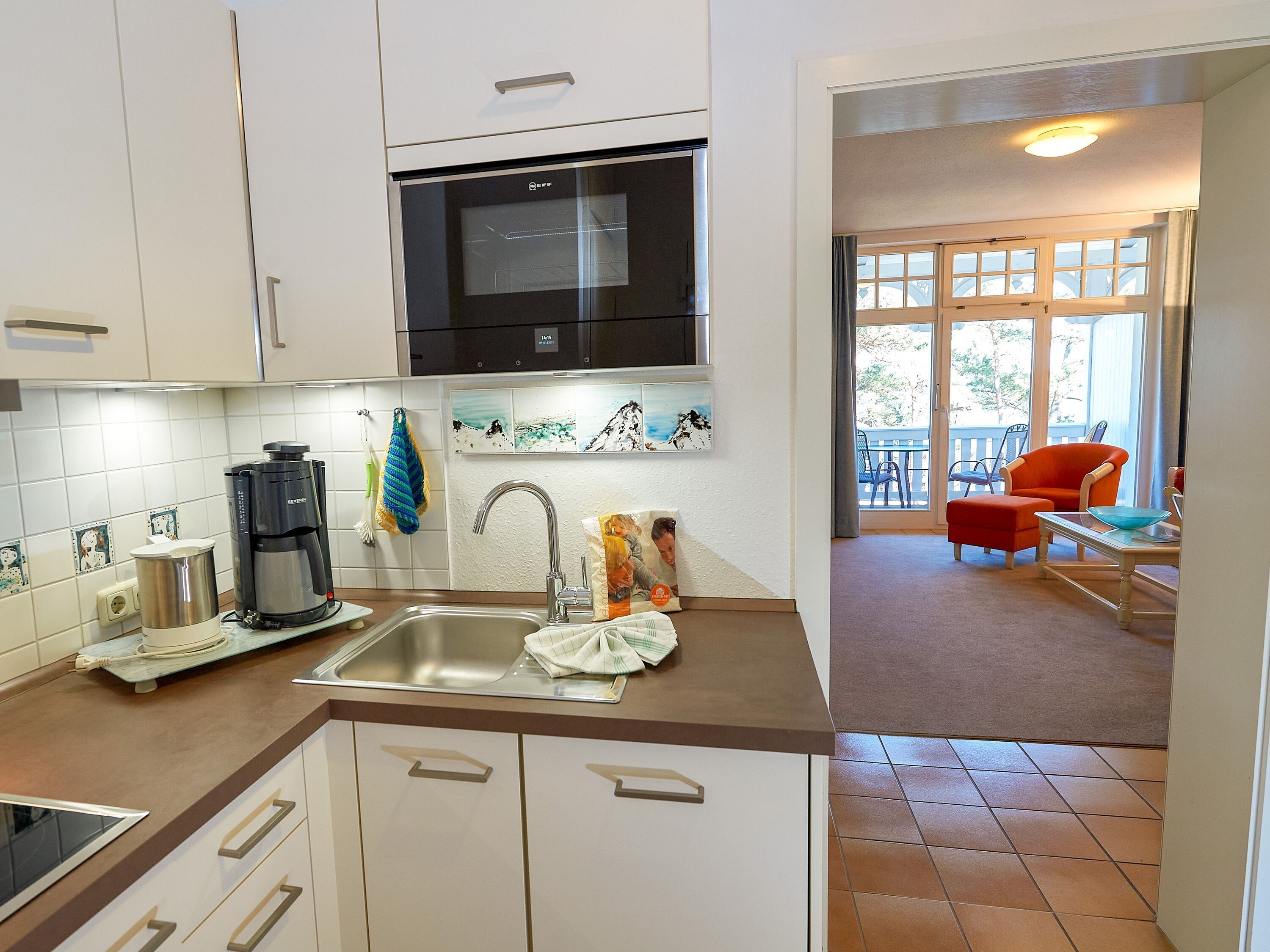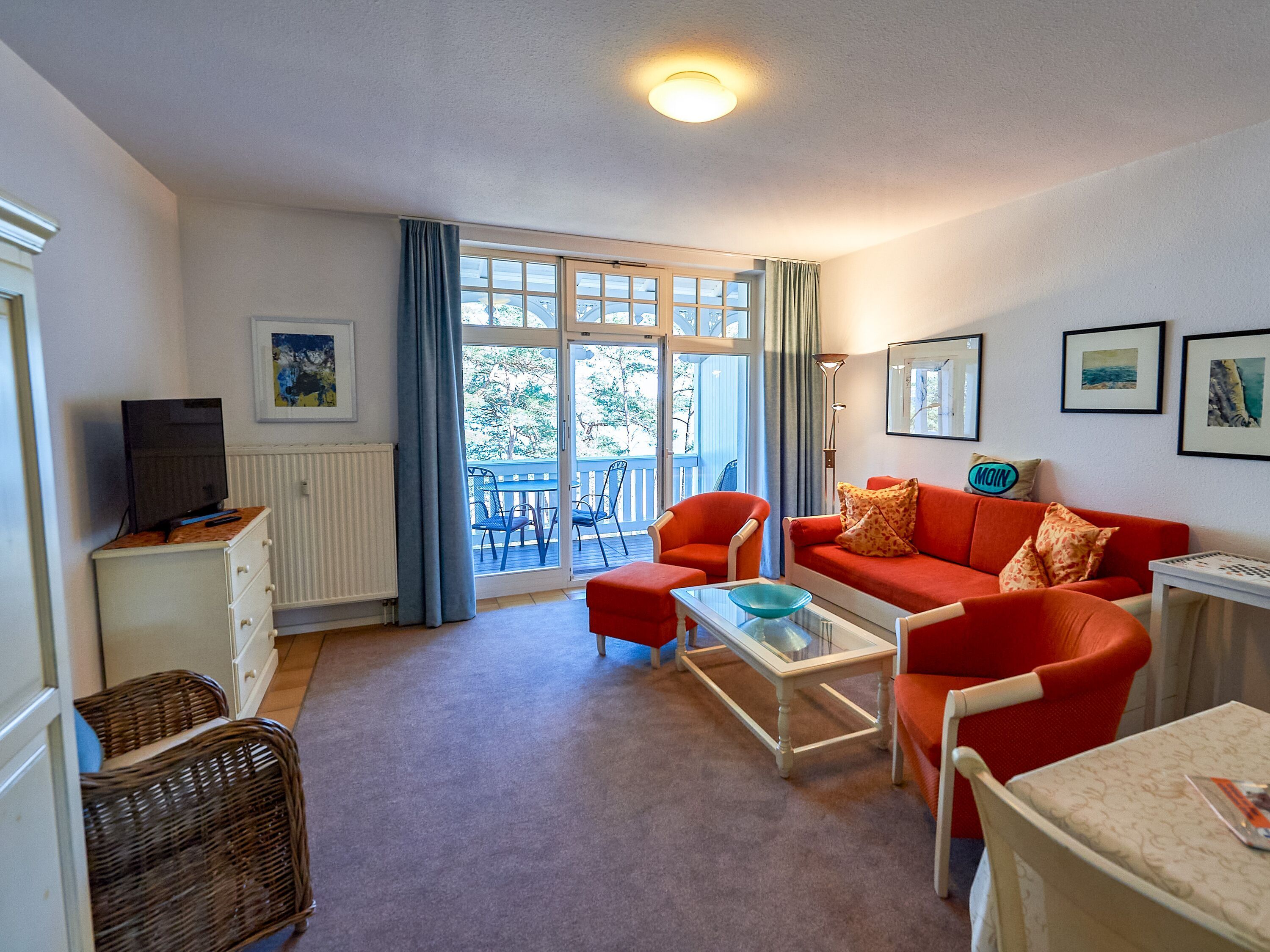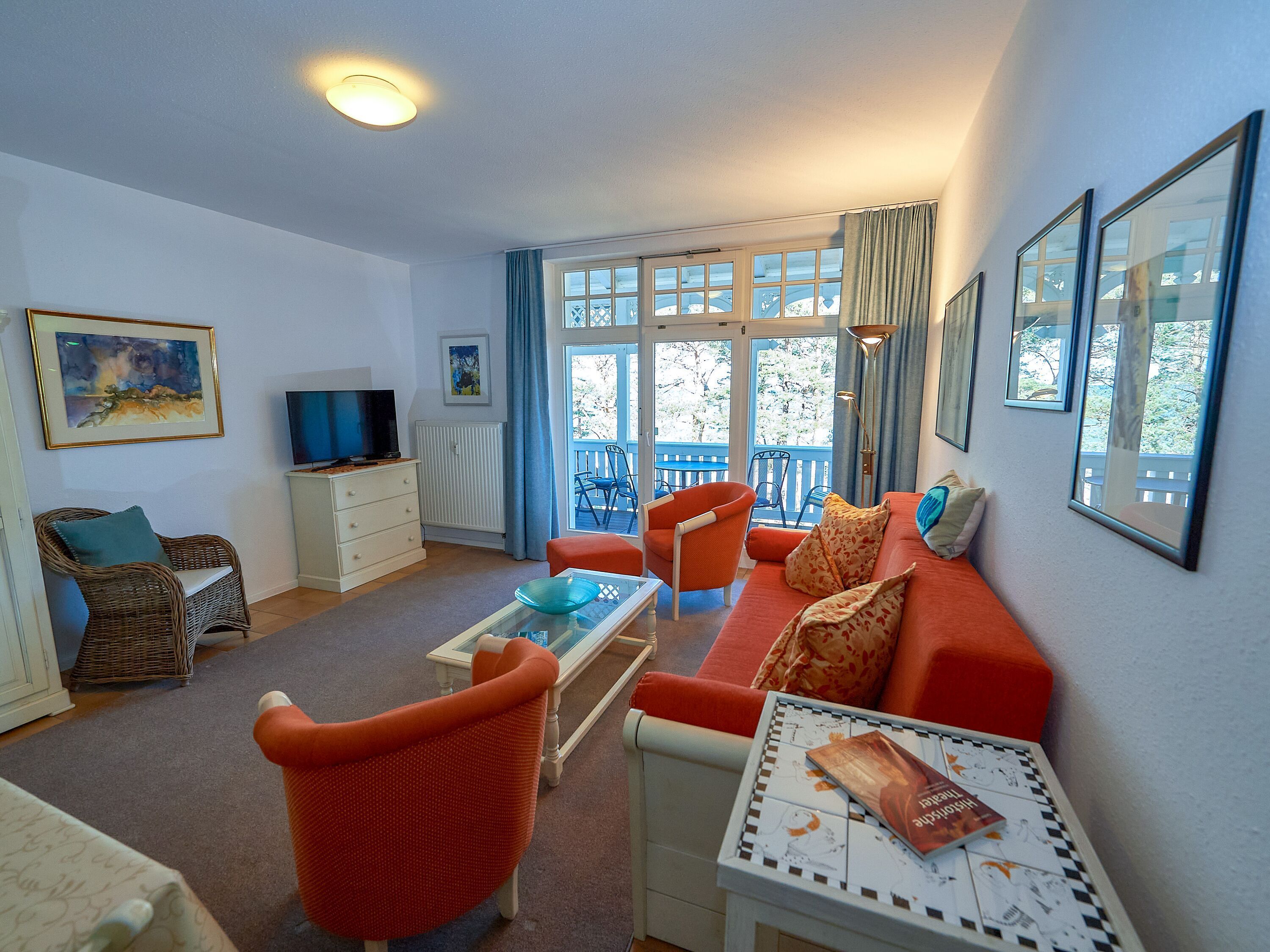 Der hell und freundlich eingerichtete Wohnraum verfügt über einen großen Esstisch für 4 Personen, eine bequeme Schlafcouch sowie einen hochwertigen LOEWE-Flachbild-TV. Vom Wohnraum aus gelangen Sie auf die große möblierte Loggia und können dort mit Blick auf das Meer und das Treiben auf der autofreien Strandpromenade speisen und die Zeit genießen. Die gesamte Wohnung ist mit Bodenfliesen in warmen Naturtönen ausgestattet. Die Wandfliesen in Küche und Bad wurden von der bekannten Keramikerin Kathrin Grünke original für diese Wohnung angefertigt. An den Wänden laden Aquarelle der Rüganer Maler H. Petrick, W. Goes, Ch. Rosenow zum Entdecken, Staunen und sich Freuen ein.