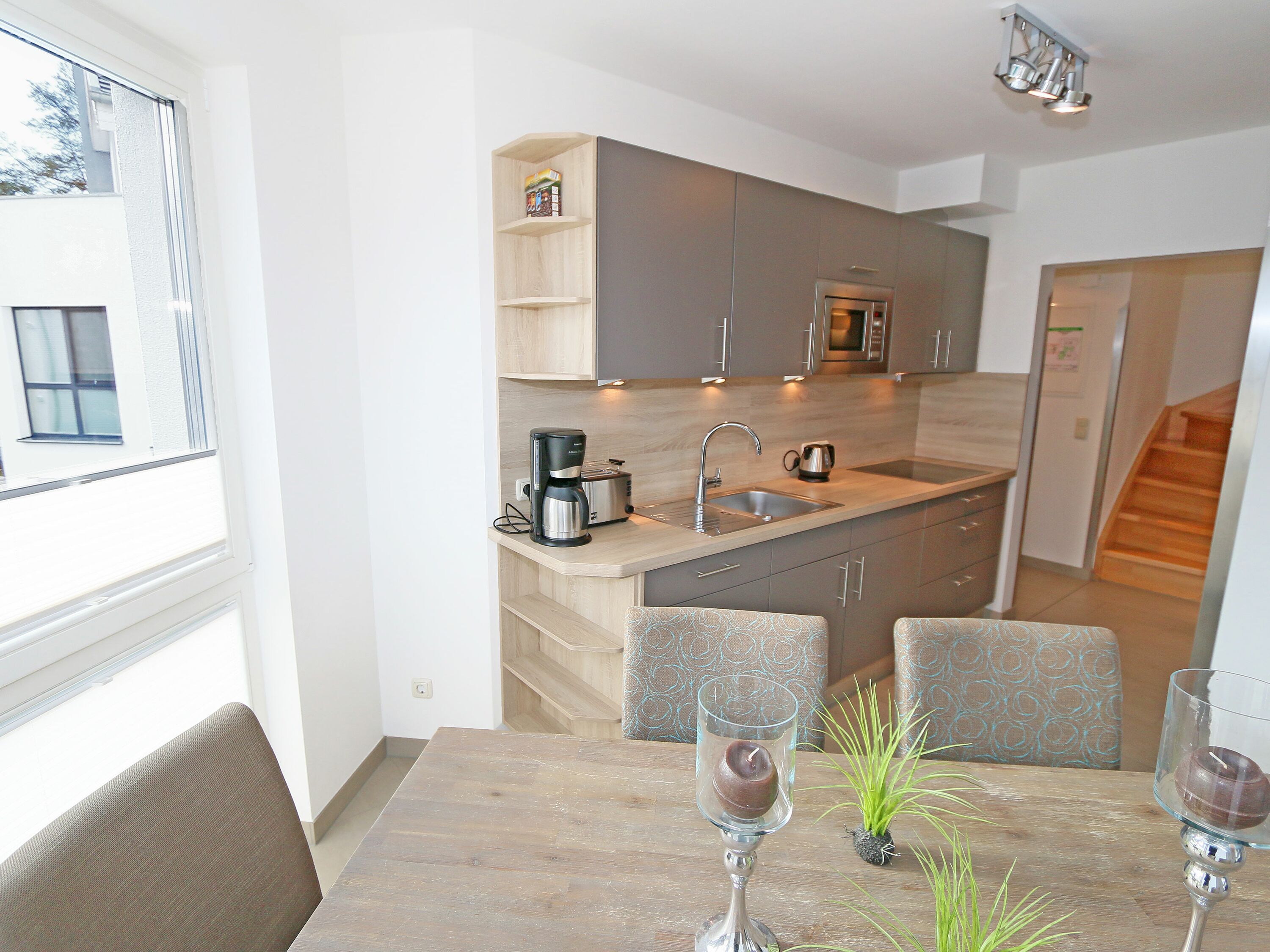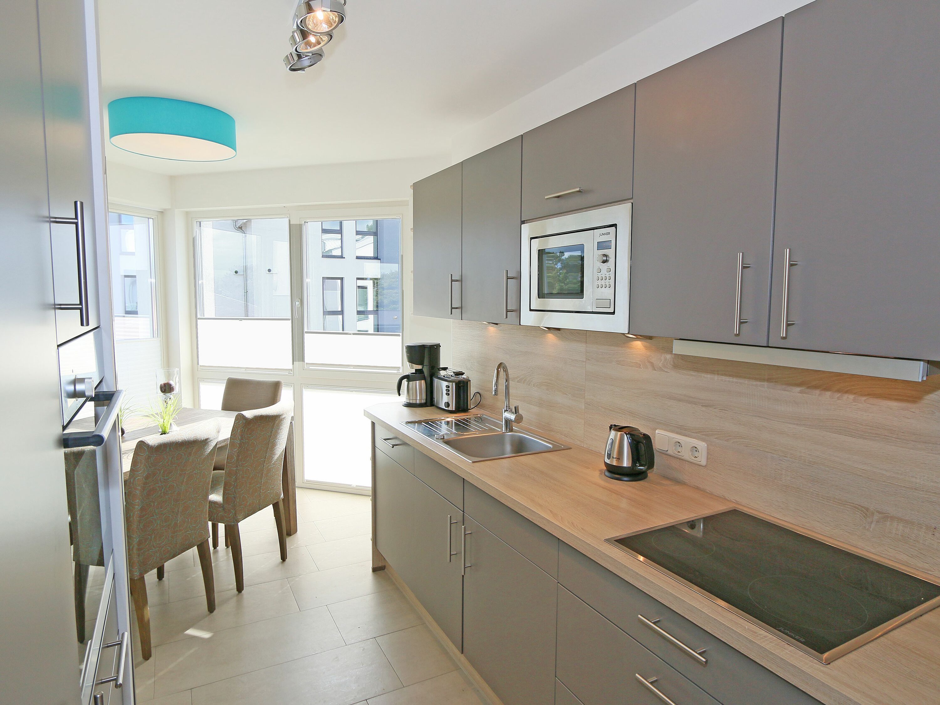 • Küchenzeile mit Waschmaschine, Geschirrspüler, Kühlschrank mit Gefrierfach, Backofen, 4 Zonen-Cerankochfeld, Mikrowelle, Kaffeemaschine, Toaster, Wasserkocher und diversen Küchenutensilien