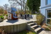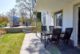 Vom Wohn- Essbereich kommt man auf die ca. 15 m² große überdachte Terrasse sowie auf eine zweite Terrasse, auf welcher sich ein Strandkorb befindet, der zum Sonnenbaden einlädt, wenn man abseits vom Trubel relaxen möchte. Eine Terrasse mit Gartenmöbeln ist überdacht und die zweite Terrasse verfügt über einen Strandkorb. Der ca. 200 m² große liebevoll angelegt Garten ist komplett umzäunt.