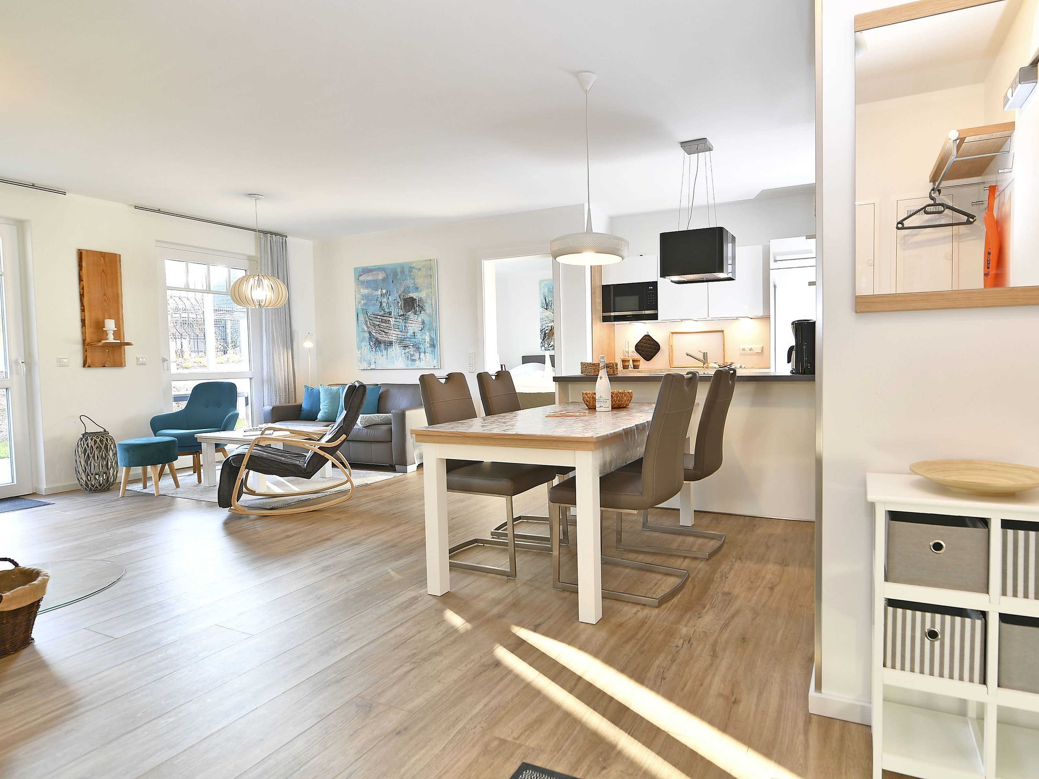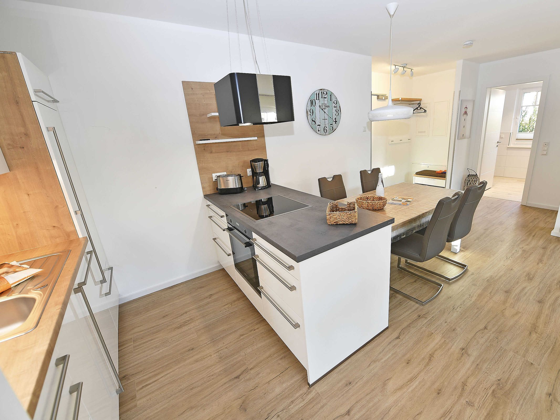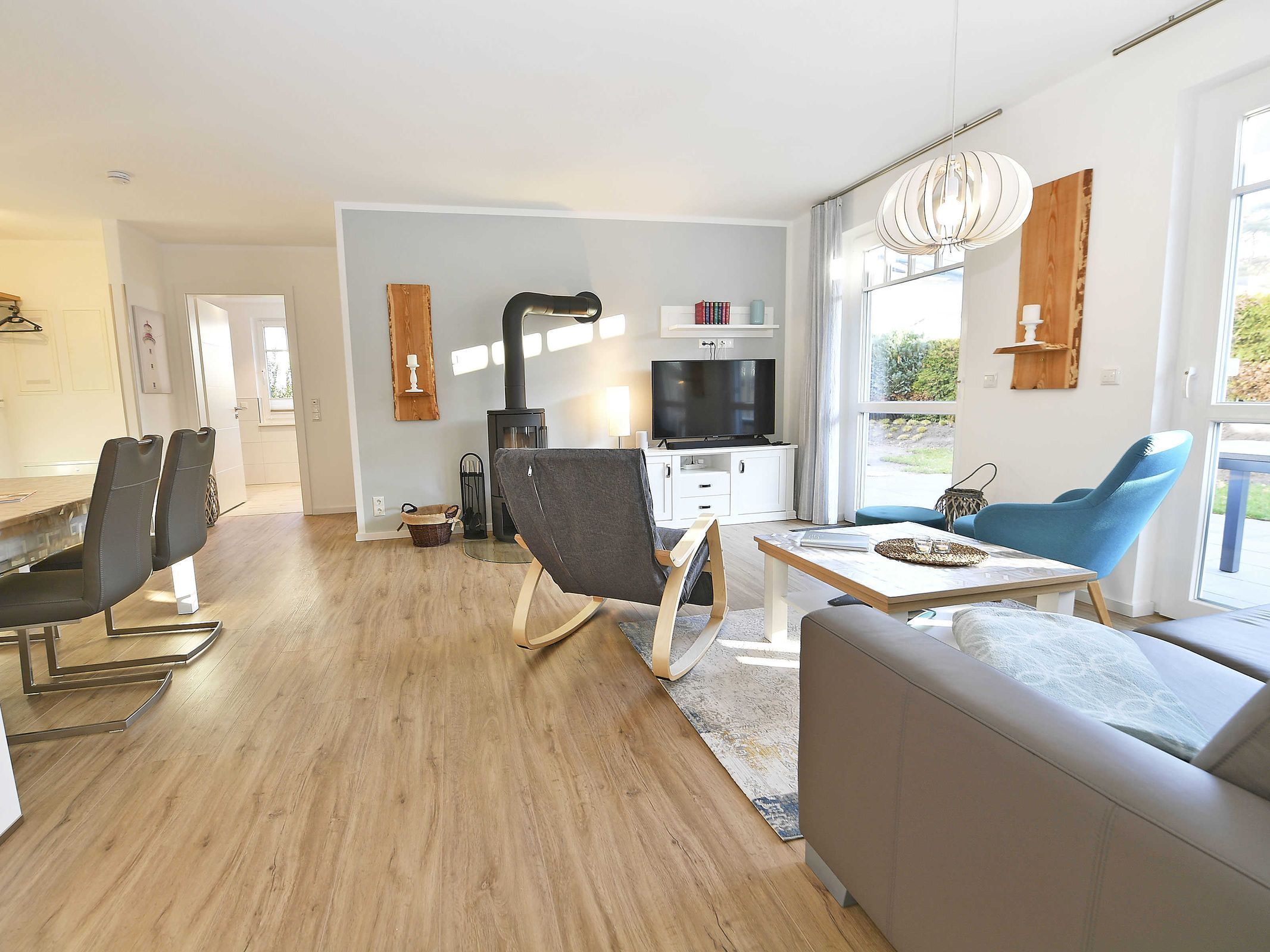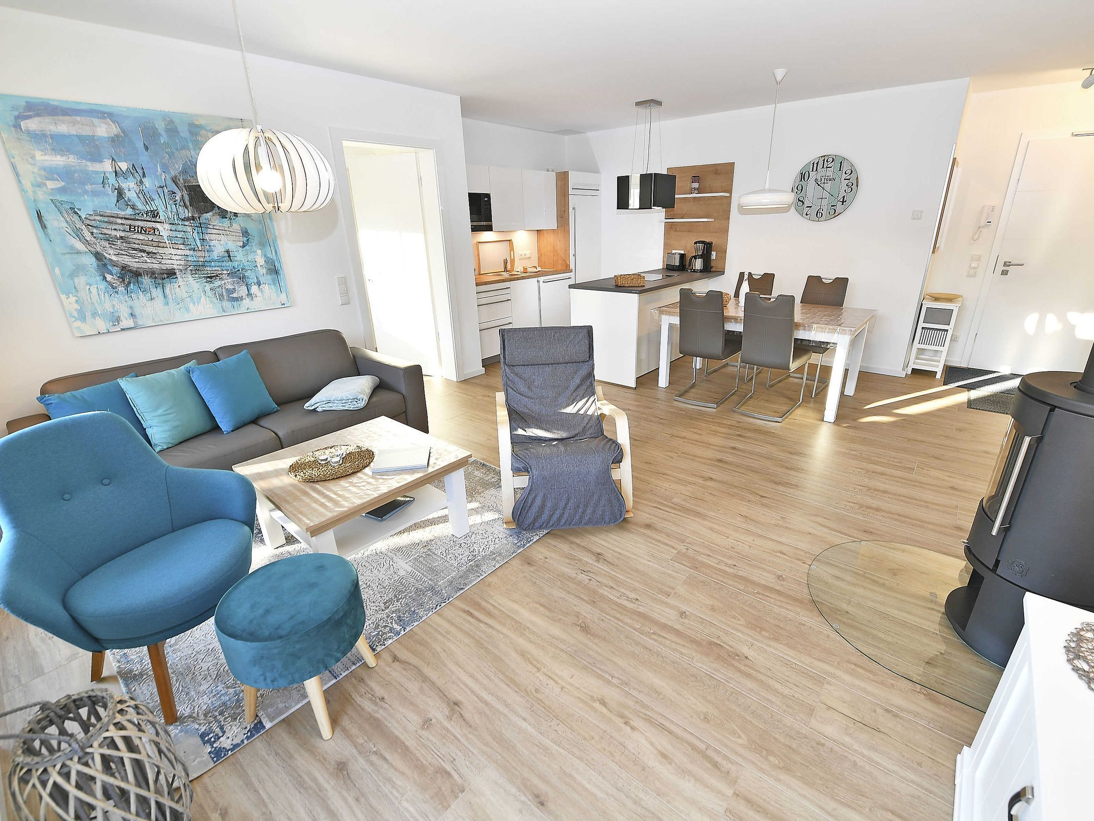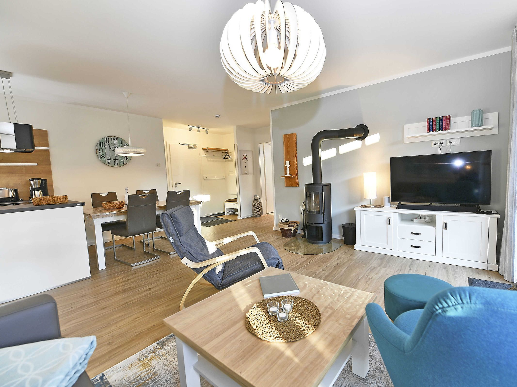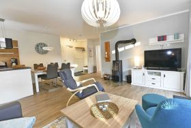 Im 34 m² großen kombinierten Wohn- und Essbereich befinden sich eine behagliche Sitzecke, sowie eine moderne Einbauküche mit Kochinsel. An dem großen Esstisch finden bis zu 5 Personen Platz. Ein Kamin sorgt für Gemütlichkeit.