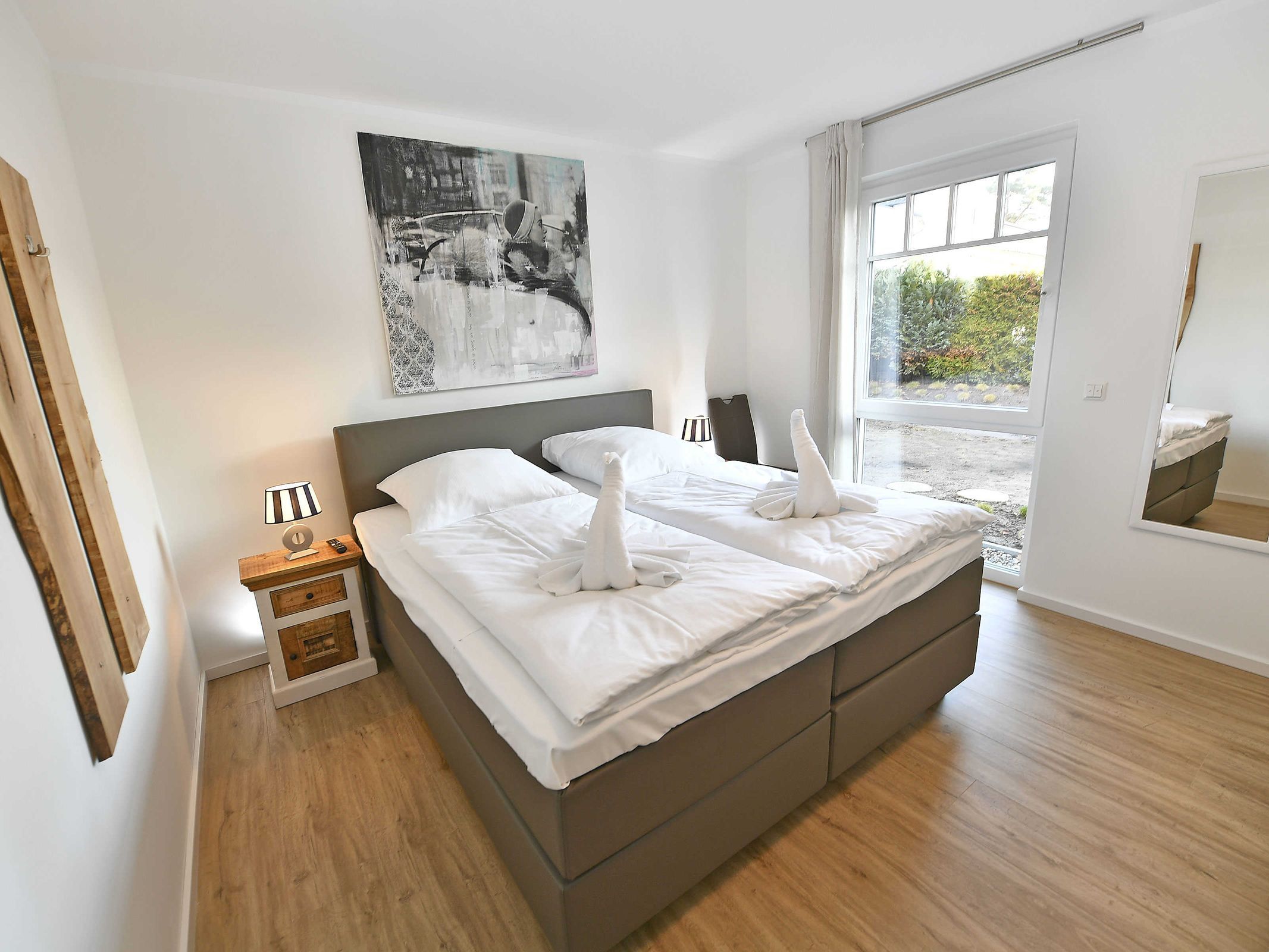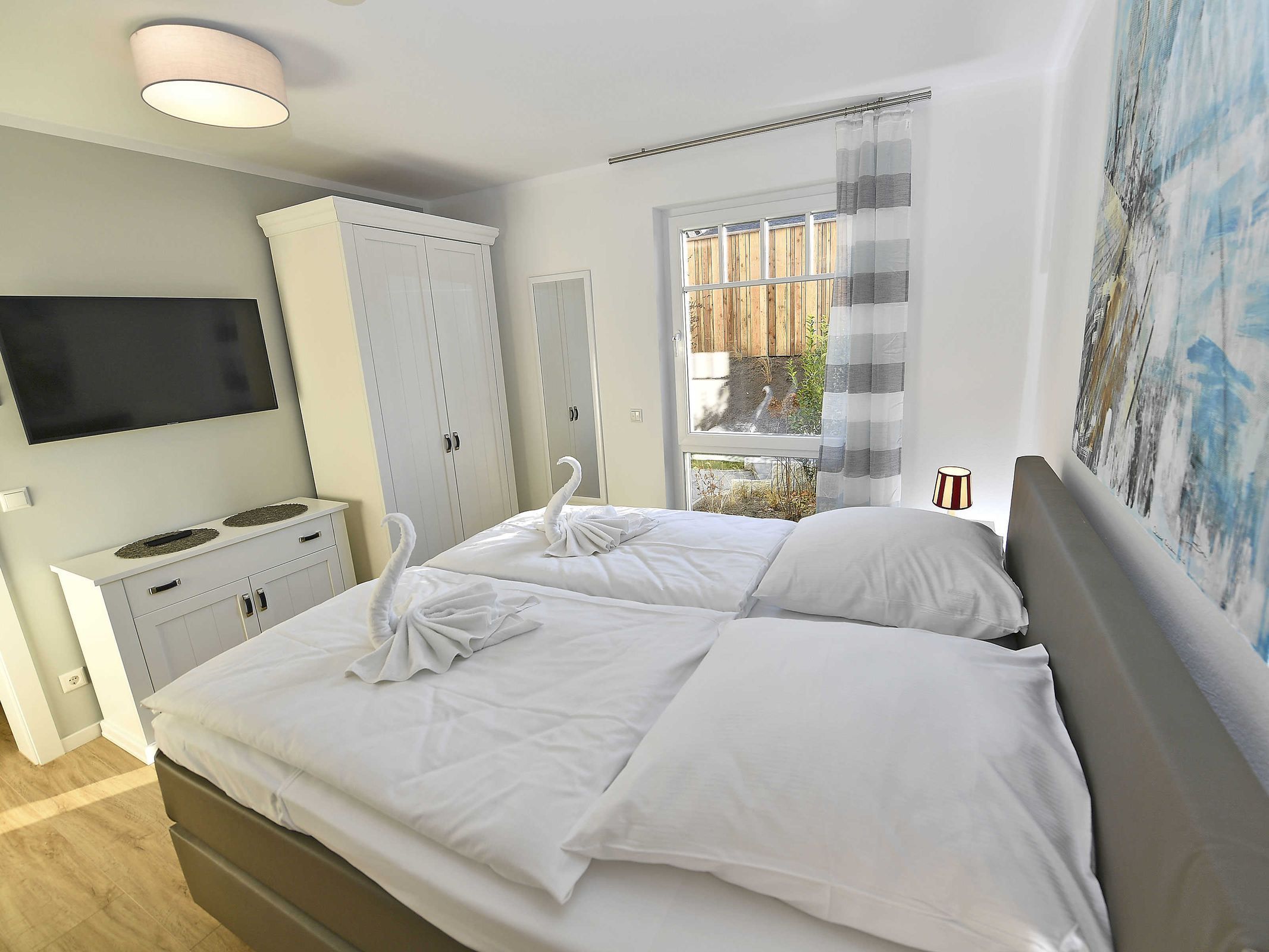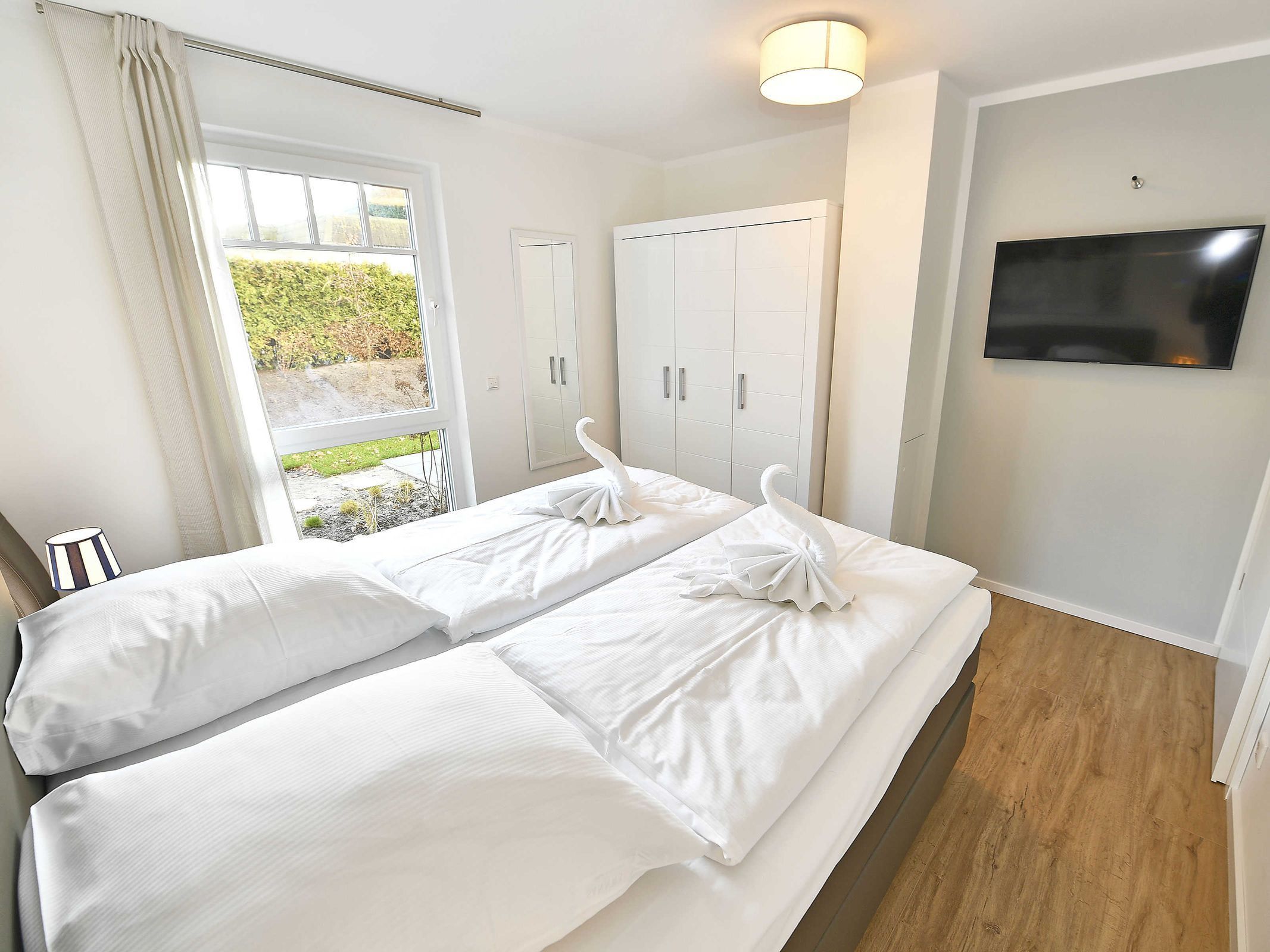 Die Erdgeschosswohnung verfügt über zwei separate Schlafzimmer jeweils mit einem Boxspringbett 180 x 200 cm (allergikerfreundlich) und genügend Stauraum für Ihre Garderobe, sowie in jedem Schlafzimmer einen Flachbild TV.