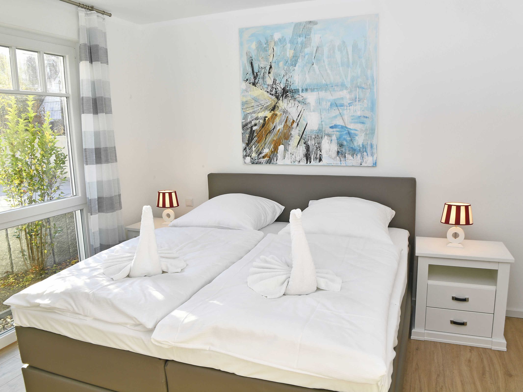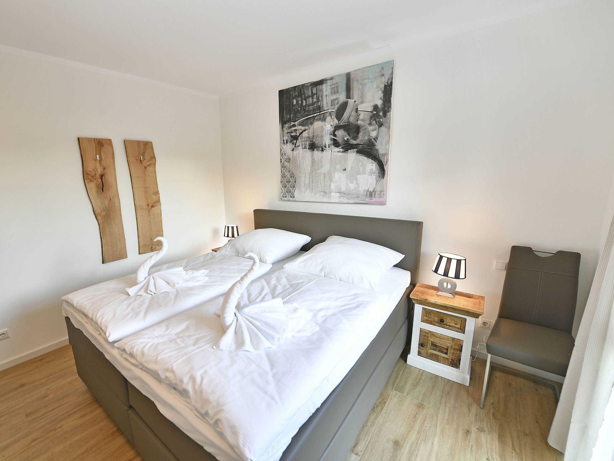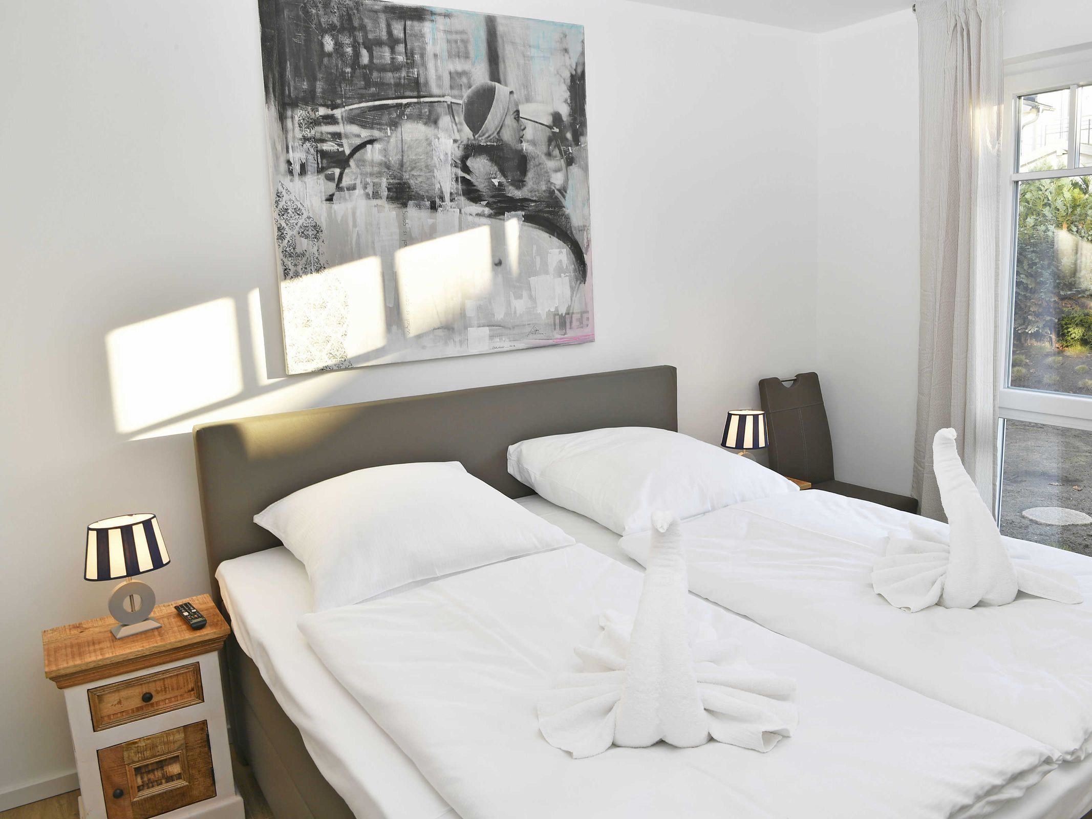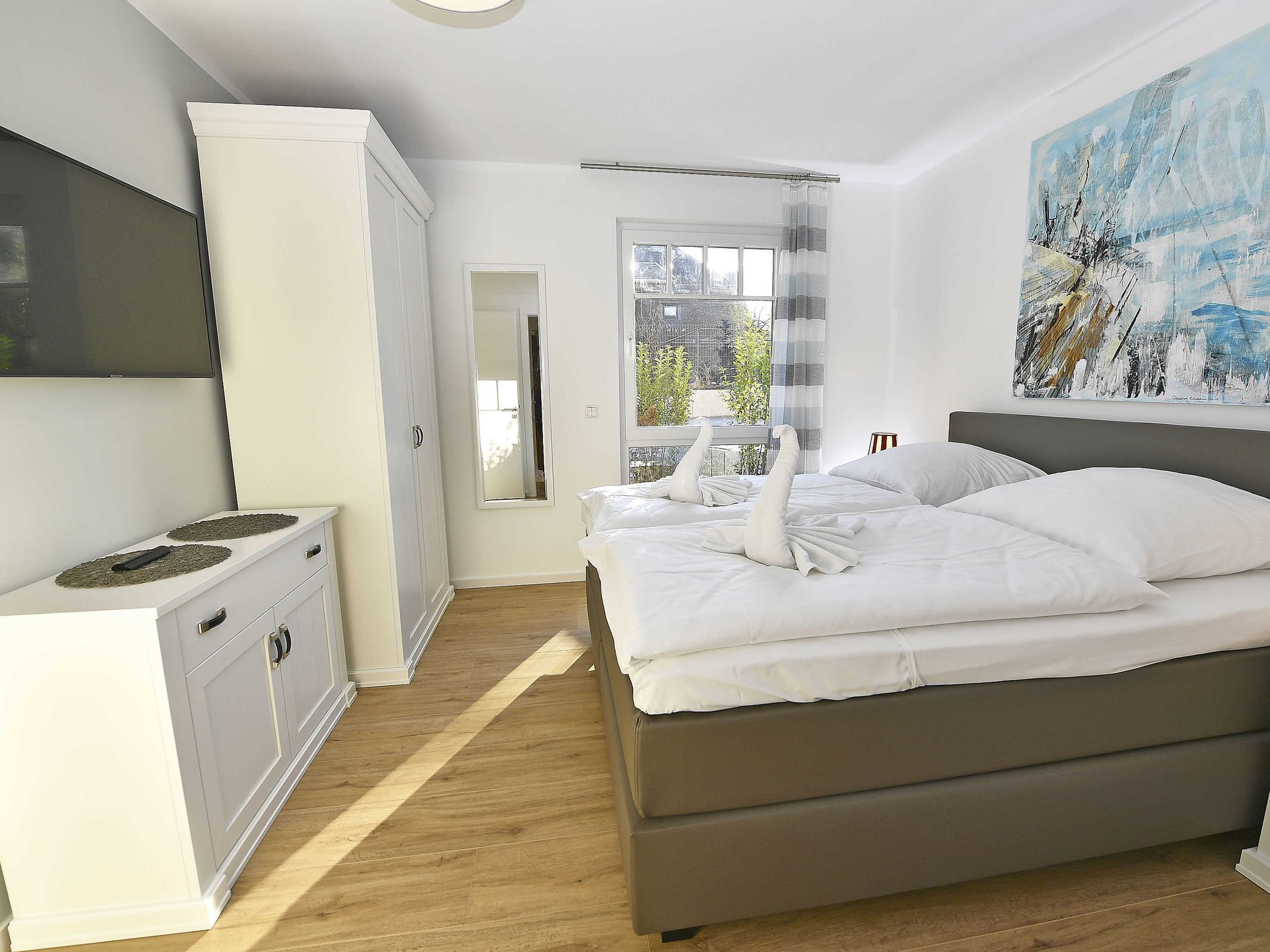 Die Erdgeschosswohnung verfügt über zwei separate Schlafzimmer jeweils mit einem Boxspringbett 180 x 200 cm (allergikerfreundlich) und genügend Stauraum für Ihre Garderobe, sowie in jedem Schlafzimmer einen Flachbild TV.