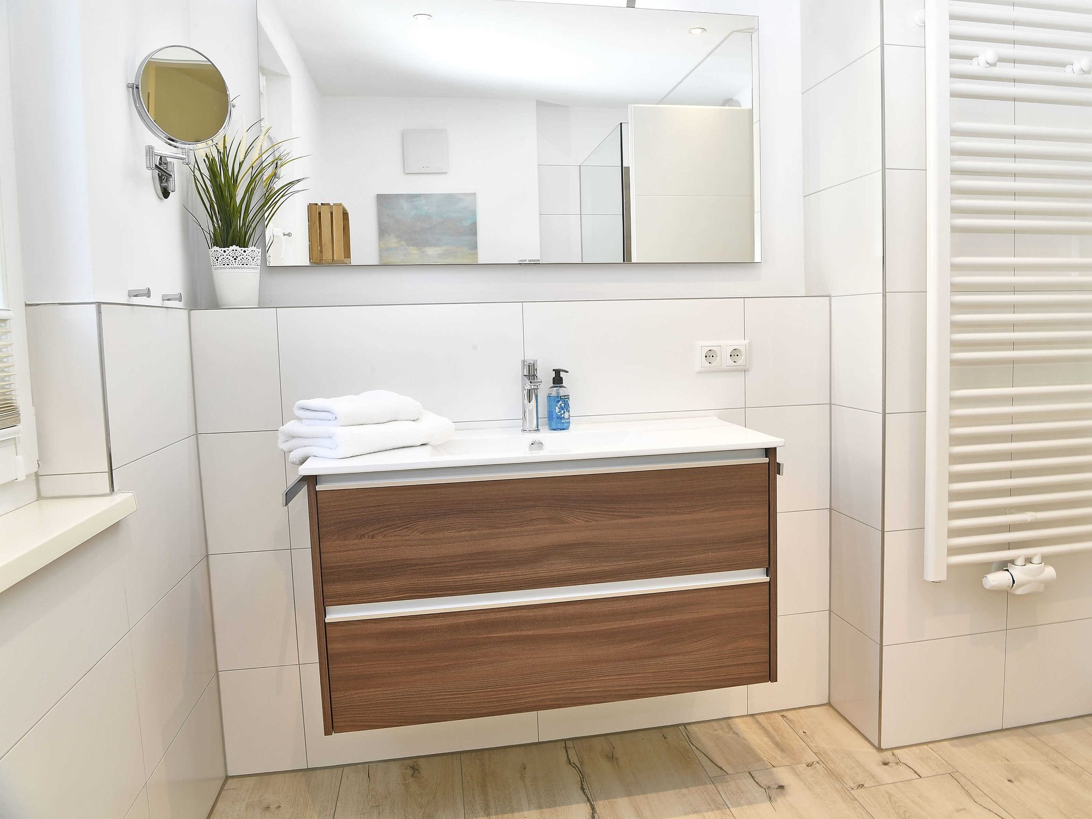 Die Fußböden im Wohnbereich und in den Schlafzimmern sind aus hochwertigen Vinyl- Desingboden in heller Sandeiche, der zu 100% frei von Weichmachern und PVC ist.