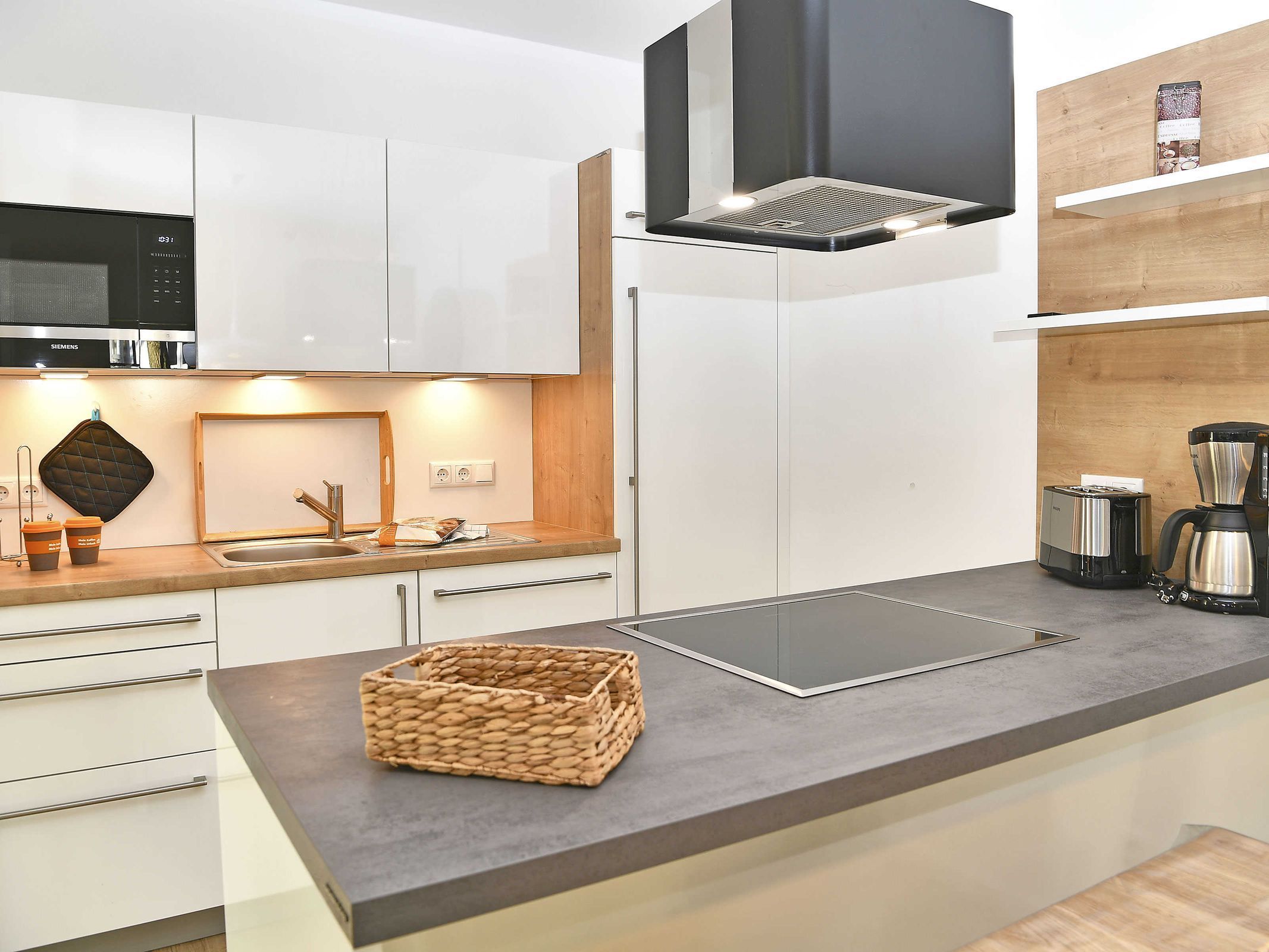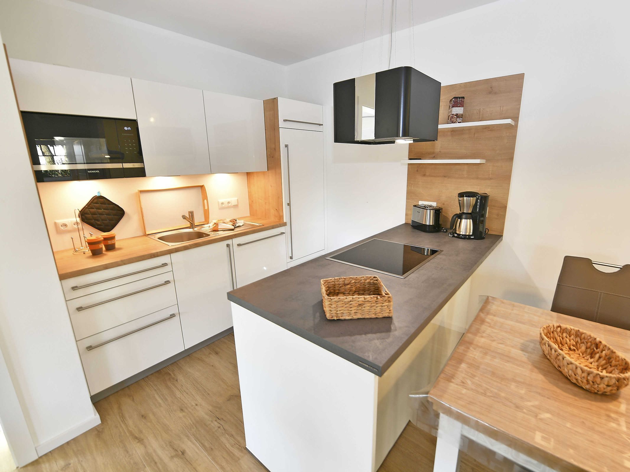 Die perfekt in den Wohnbereich integrierte Küchenzeile ist komplett ausgestattet mit einem Backofen, einer Geschirrspülmaschine, einer Mikrowelle auf Augenhöhe, einem Kühlschrank mit Gefrierfach, Kaffeemaschine, Toaster, Wasserkocher, weiteren Kochutensilien und einer Kochinsel mit einem 4-Platten-Induktionskochfeld.