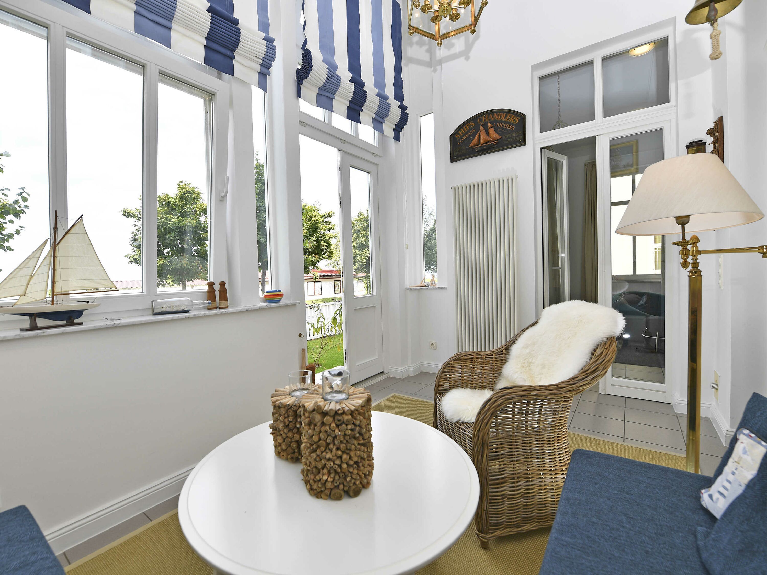 Vom Wintergarten und angrenzendem Wohnbereich aus können Sie den traumhaften Panoramablick auf die Ostsee genießen und haben nahezu unmittelbaren Zugang zum Strand. Das Wohnzimmer verfügt über: Flachbild-Fernseher (versenkbar), DVD-Player, Radio/CD-Player und eine kleine Ferienbibliothek.