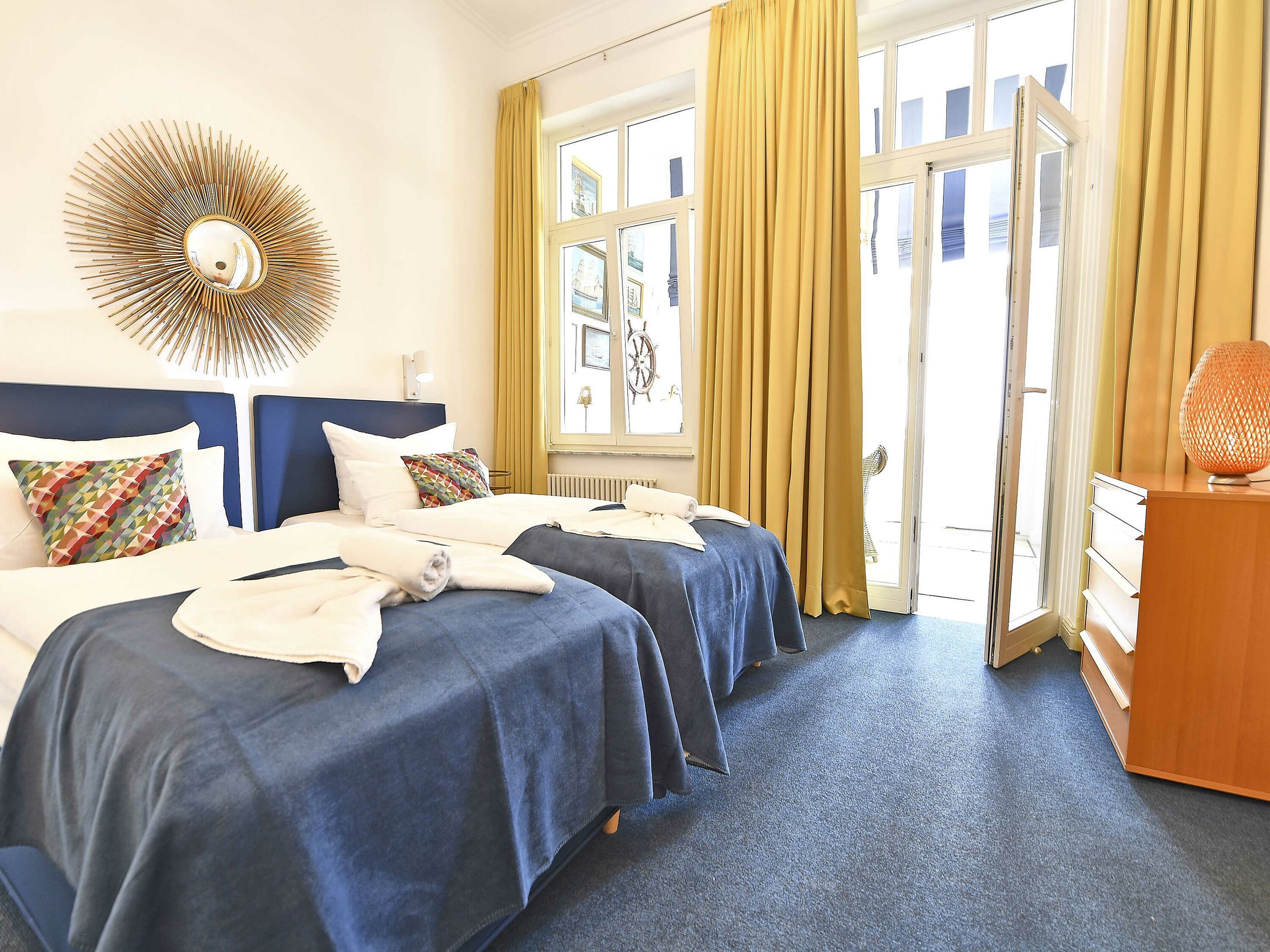 Das Appartement verfügt über zwei Schlafzimmer. Ein Schlafzimmer mit zwei Einzelbetten liegt hinter dem Wintergarten zur Seeseite. Das zweite Schlafzimmer mit Doppelbett verfügt über einen zusätzlichen Flachbild-Fernseher. Von der Terrasse aus haben Sie einen seitlichen Seeblick und Sitzgelegenheiten im Freien.