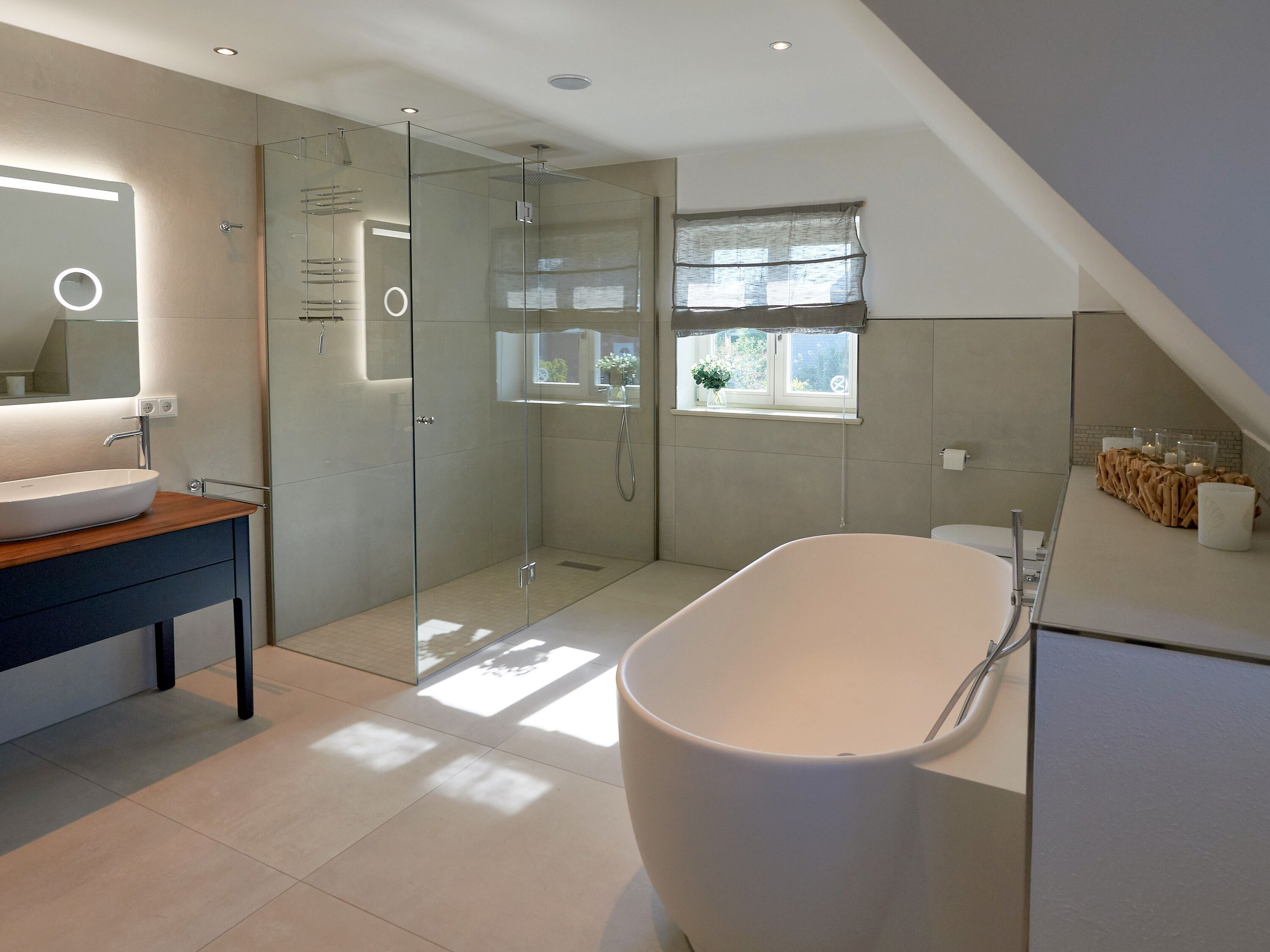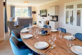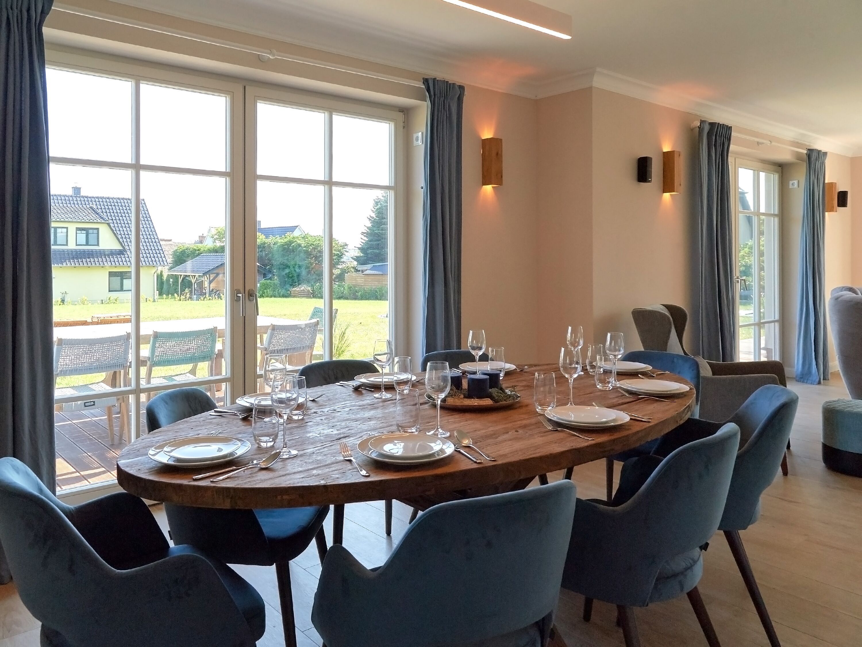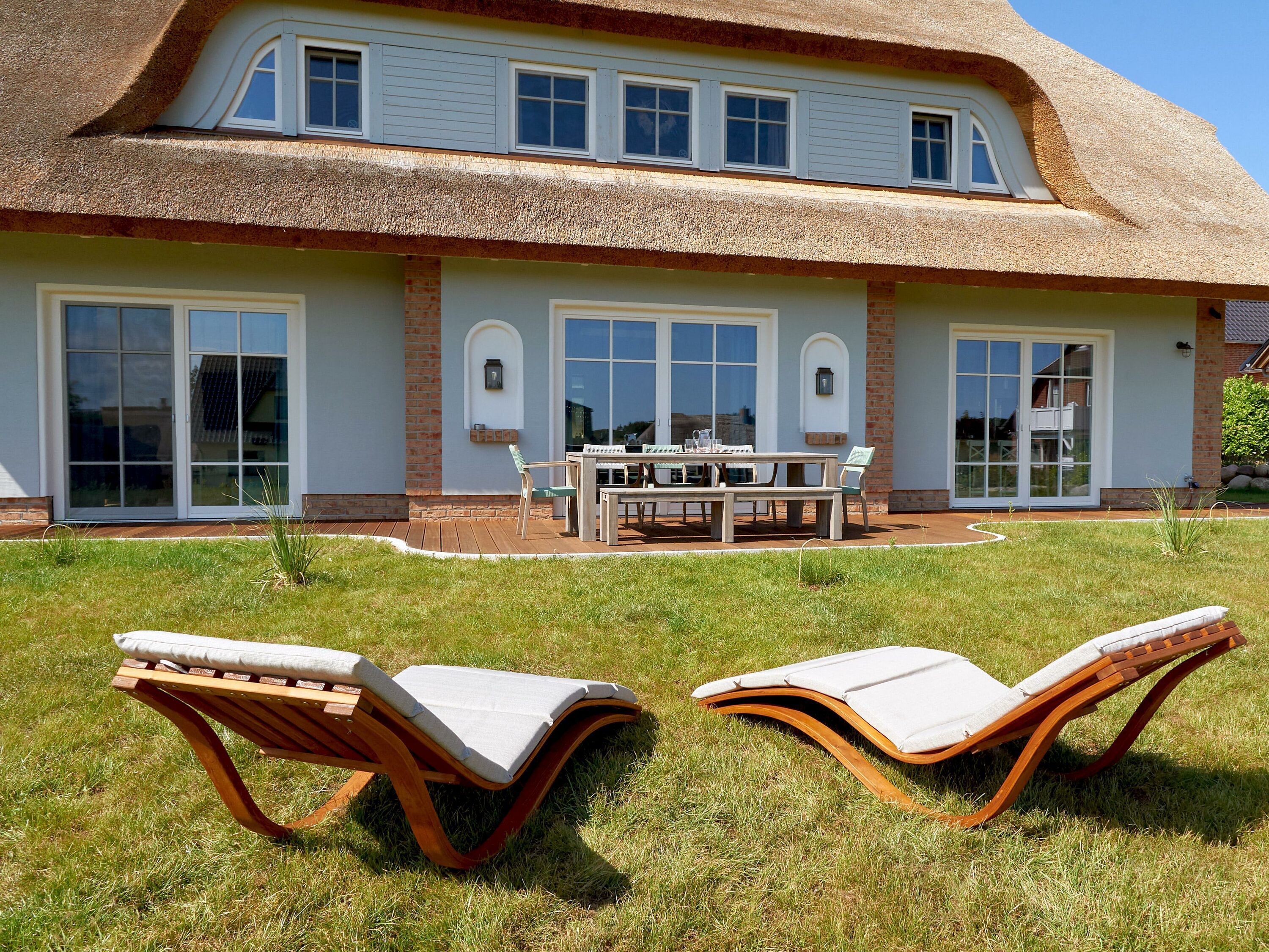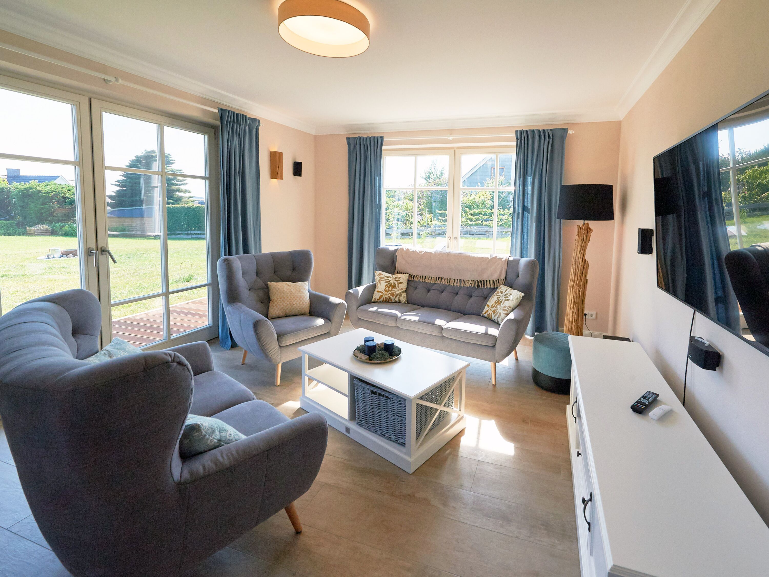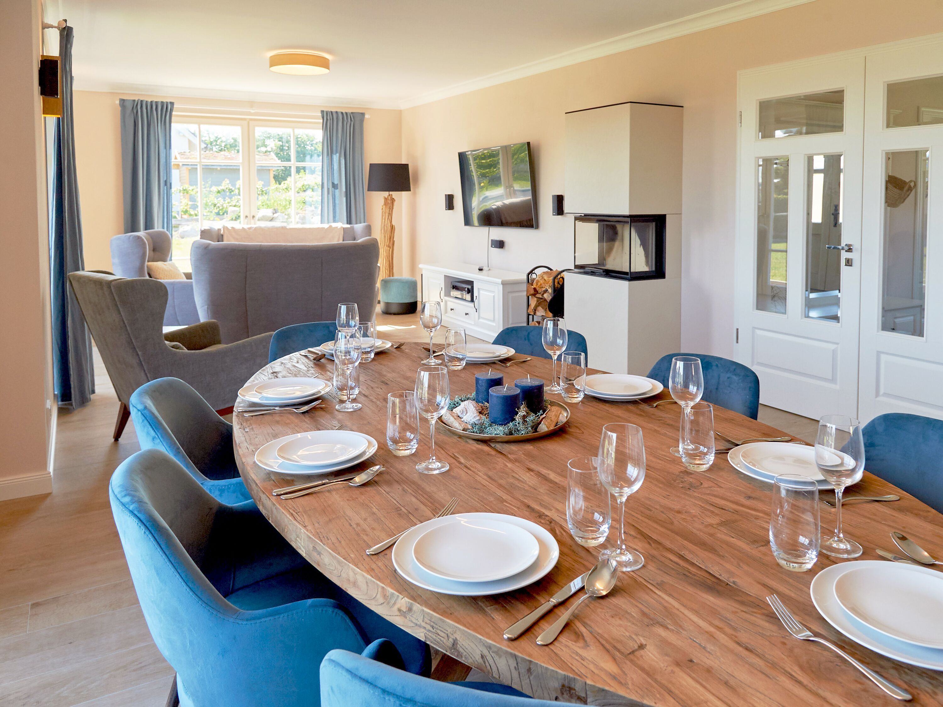 Der großzügige und lichtdurchflutete Wohn- und Essbereich mit direktem Blick ins Naturschutzgebiet befindet sich im Erdgeschoss. Das Wohnzimmer ist u.a. mit einem gemütlichen Sofa, einer Soundanlage und einem Smart-TV ausgestattet. Besonders in den kühleren Jahreszeiten sorgt der Kamin für eine romantische und angenehme Atmosphäre. Die riesige Sonnenterrasse zur Südseite mit gemütlicher Sitzgruppe lädt zum Entspannen ein. Die Balkon- bzw. Terrassenmöbel stehen saisonal - in der Regel von Mai bis Ende September - zur Verfügung.