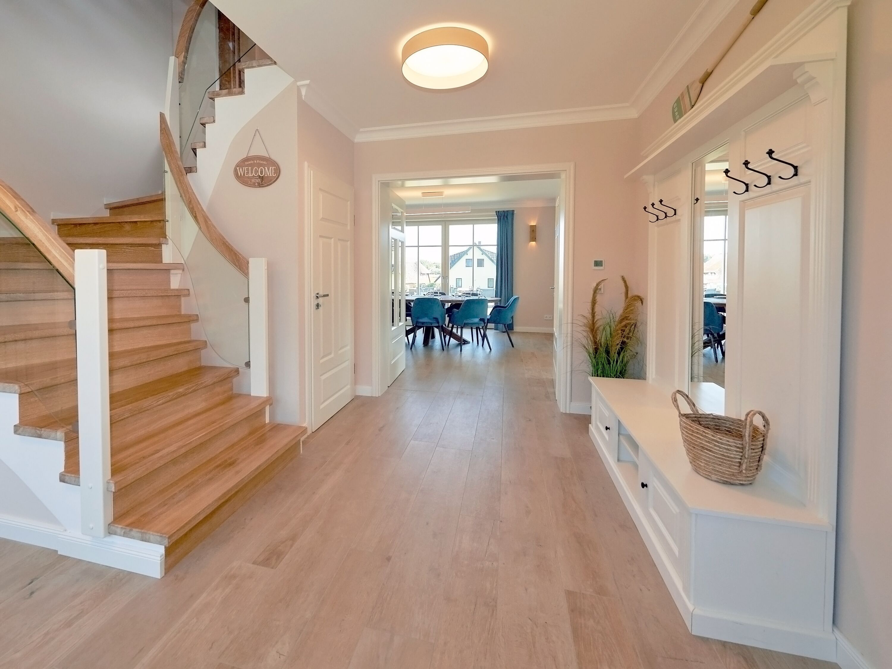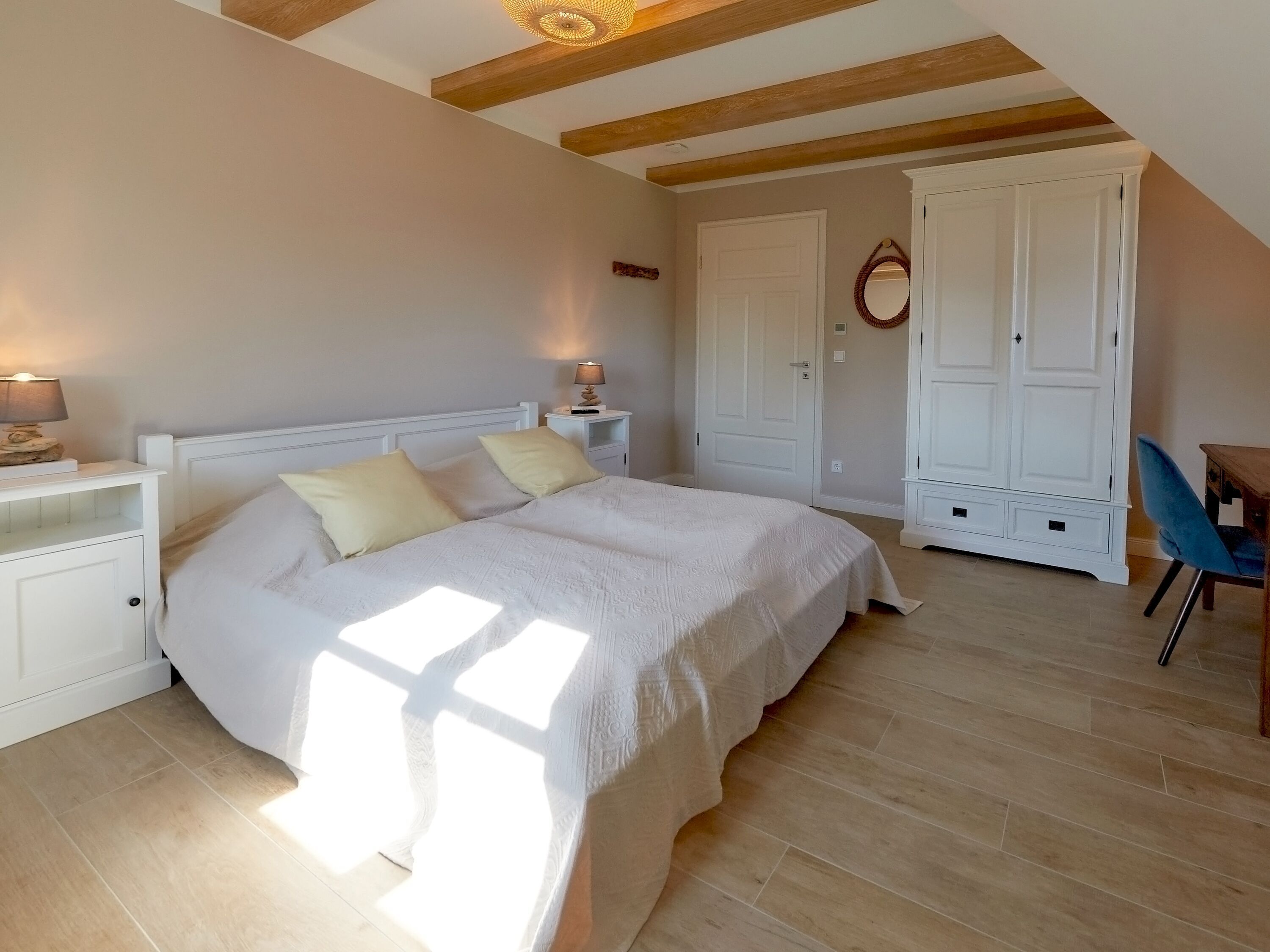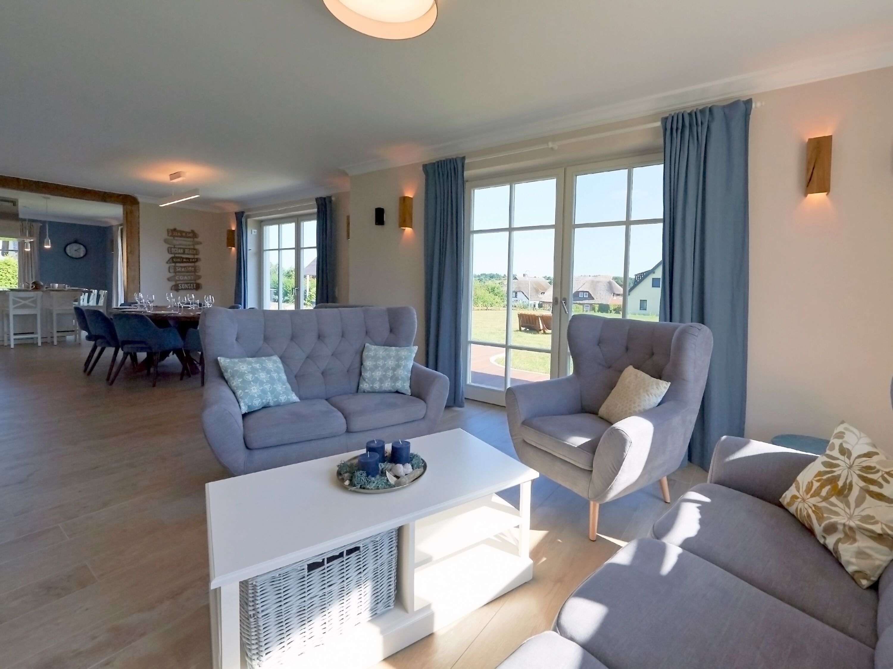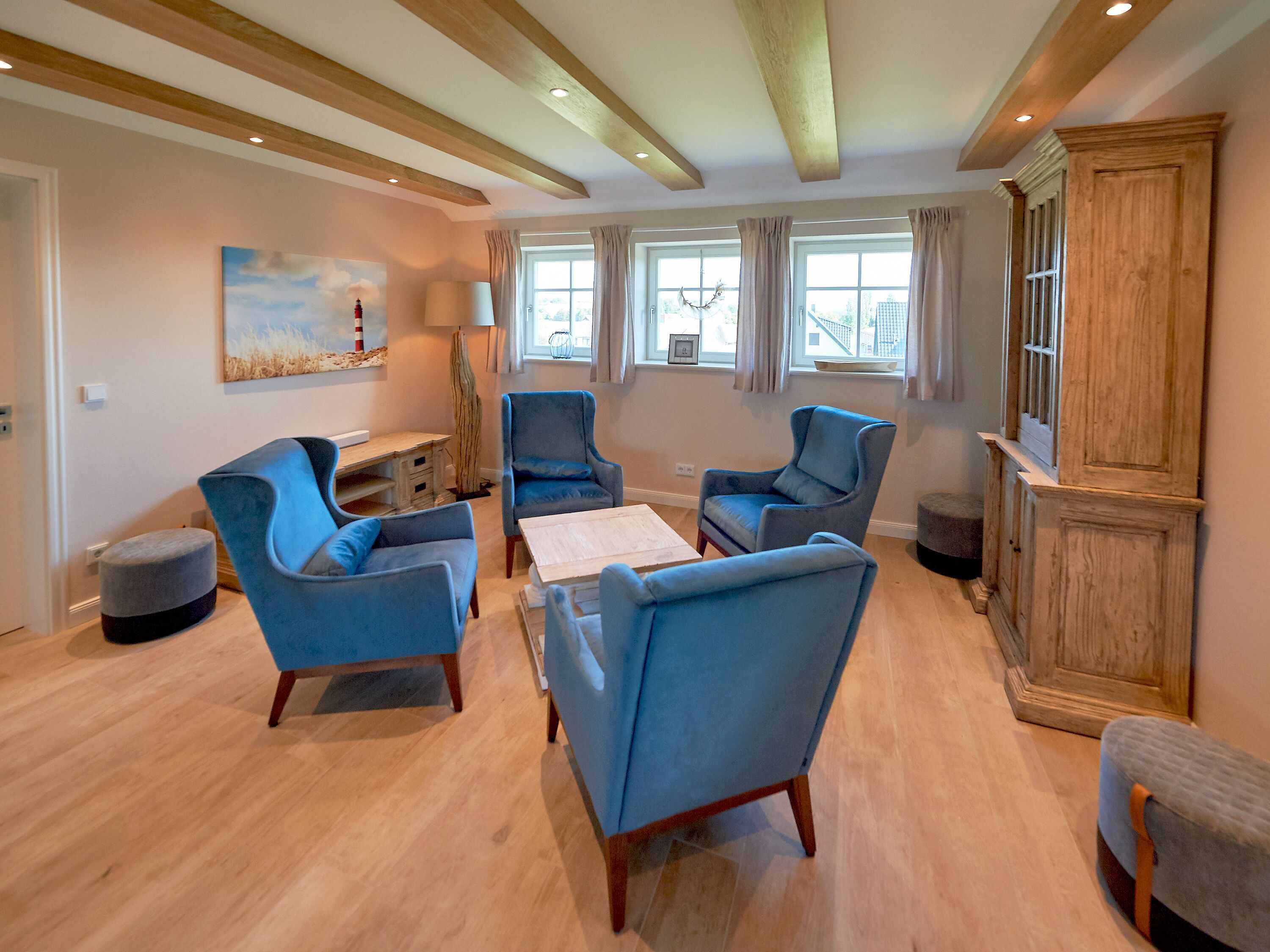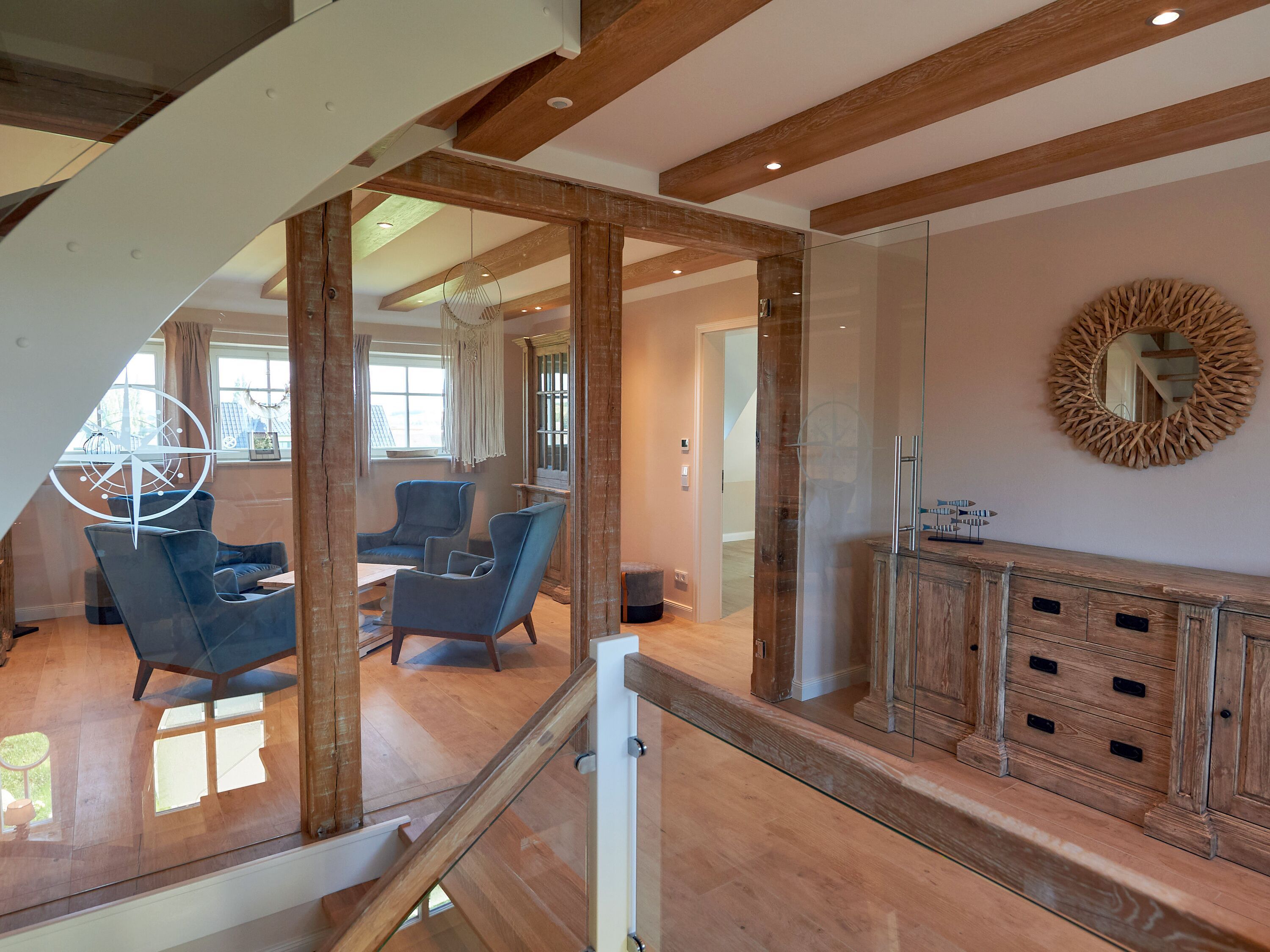 Im Obergeschoss lädt übrigens auch der zweite Wohnbereich - der Raum Boddenblick“ - zu gemütlichen Stunden ein, sei es nun beim gemeinsamen Pläneschmieden, bei einem Gesellschaftsspiel oder einfach beim Genießen des herrlichen Ausblicks auf den Bodden sowie das umliegende Biosphärenreservat.