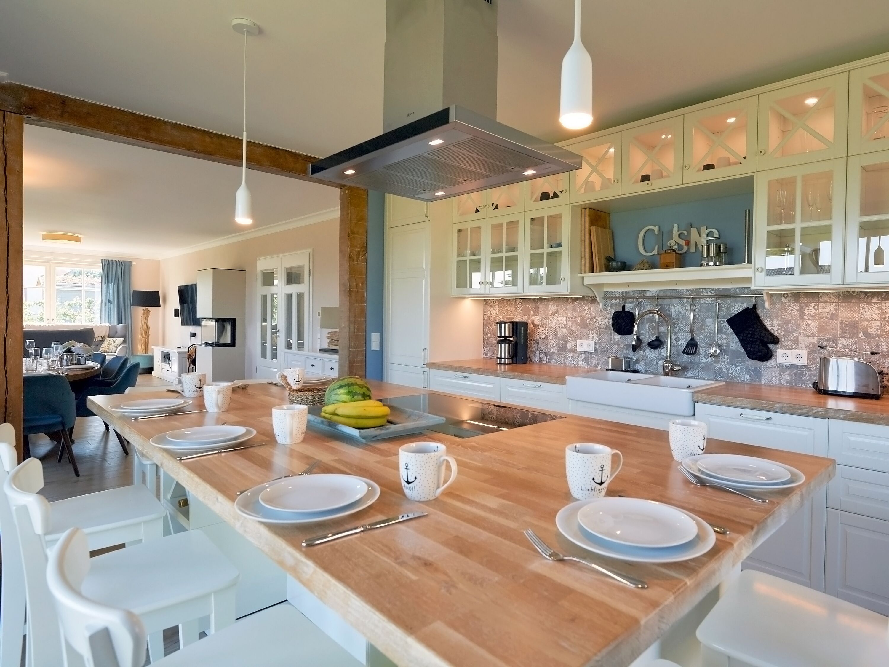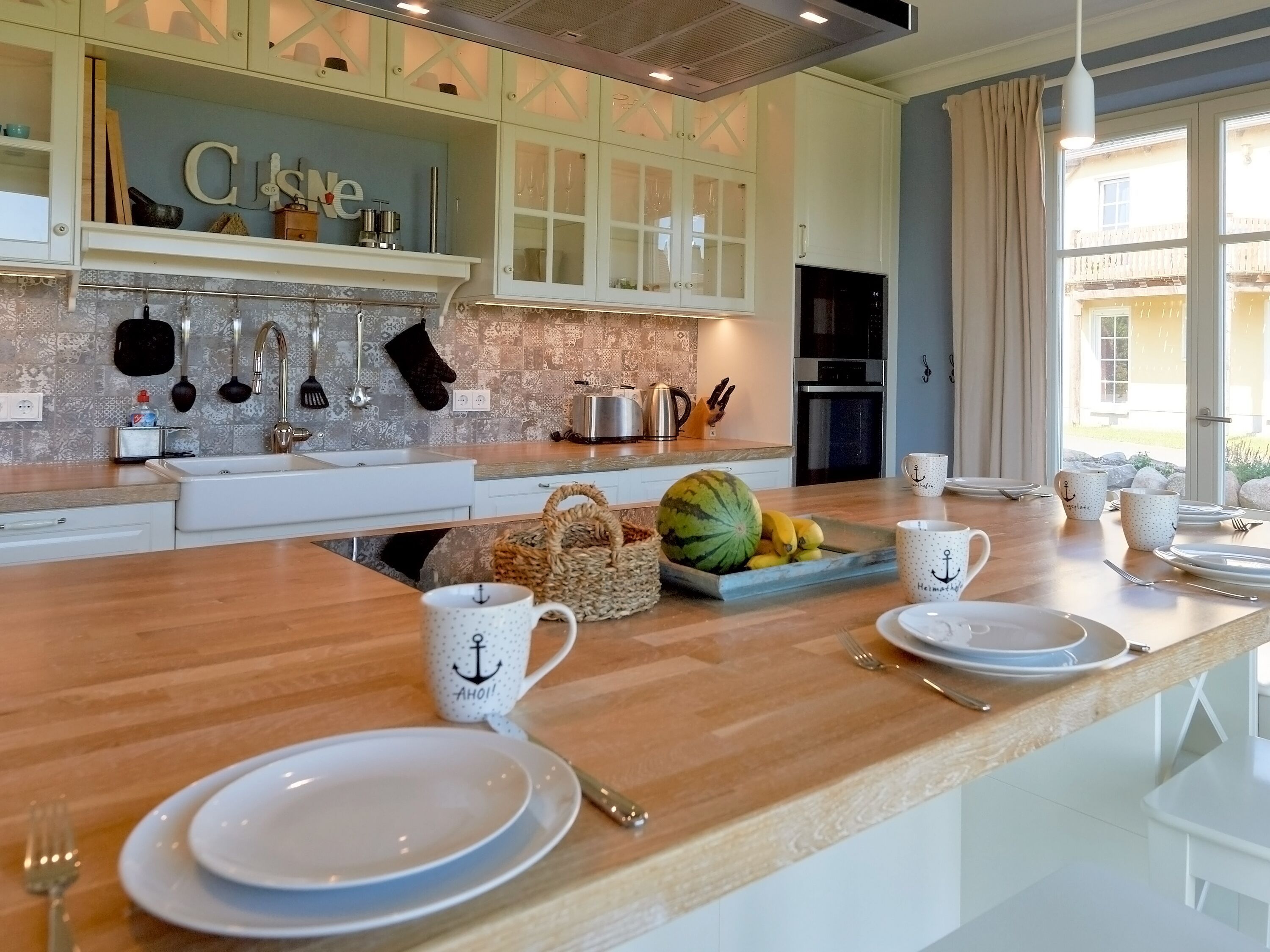 Die harmonisch in den Wohnbereich integrierte Küchenzeile ist mit einem Backofen, einer Mikrowelle, einem Geschirrspüler, einem großen Kühlschrank mit Gefrierfach, einer Kaffeemaschine, einem Toaster, Wasserkocher und diversem Kleininventar allerbestens ausgestattet. Die freistehende Kochinsel mit Sitzmöglichkeit rundet das Wohnküchenflair perfekt ab.