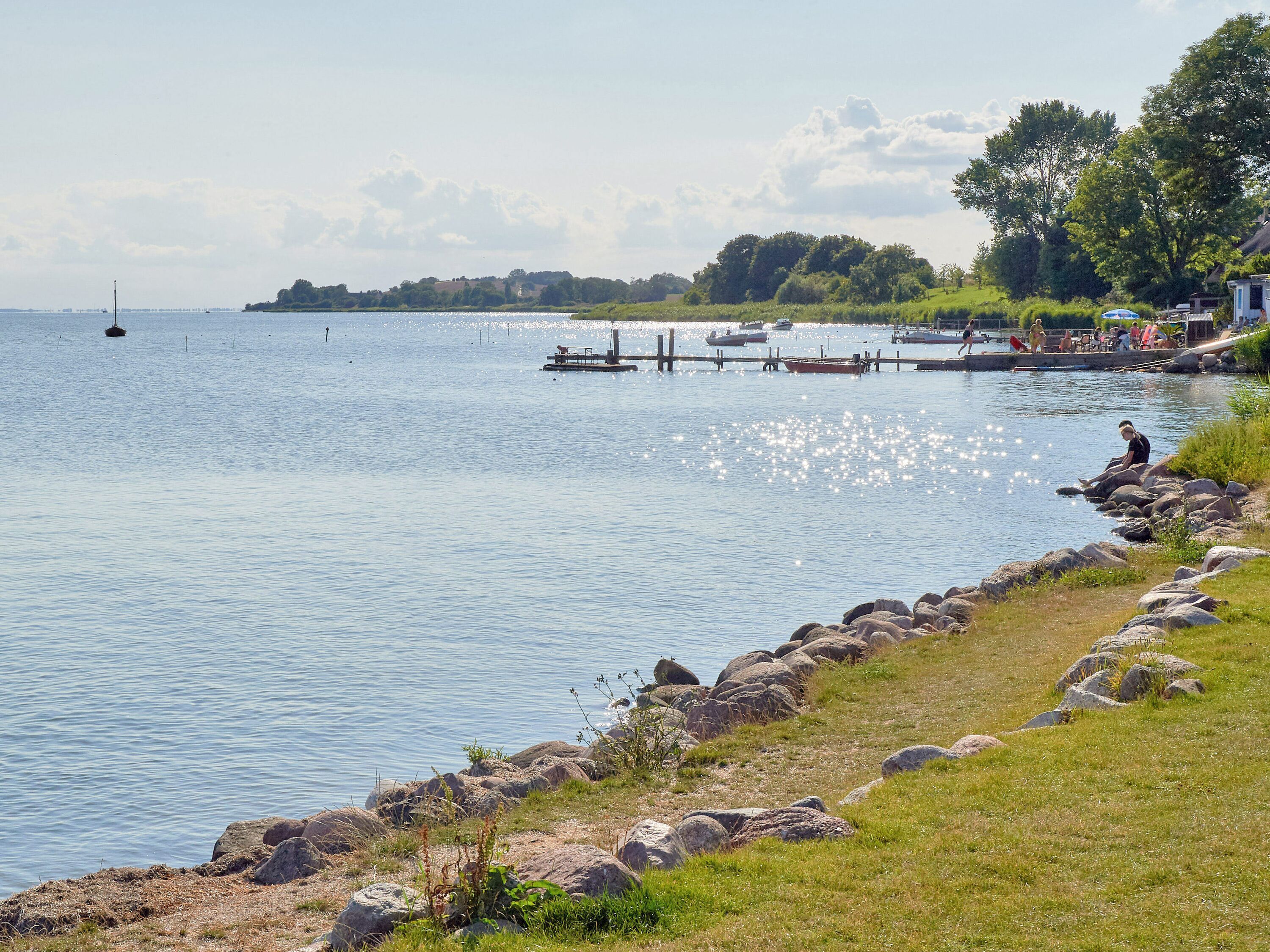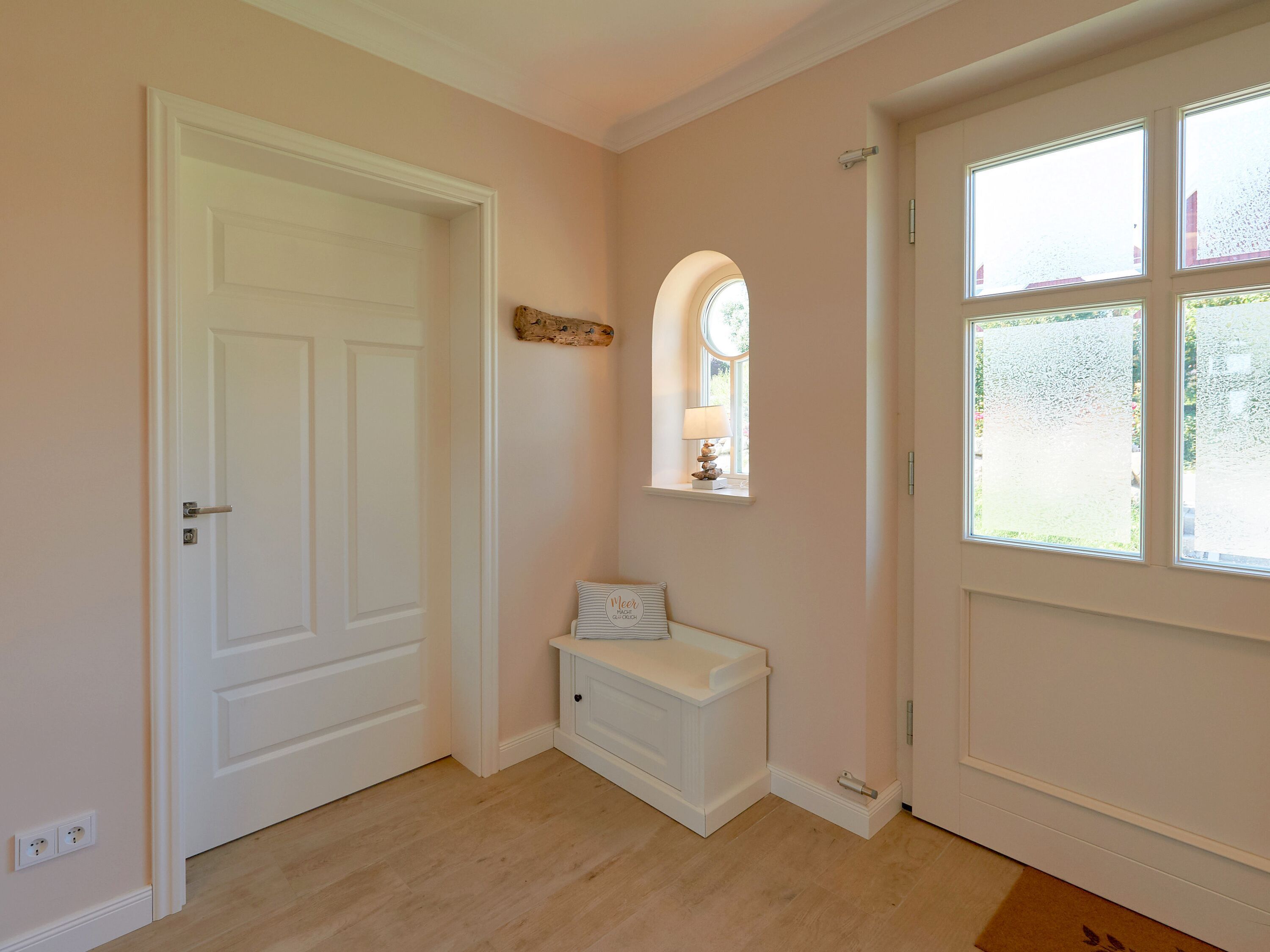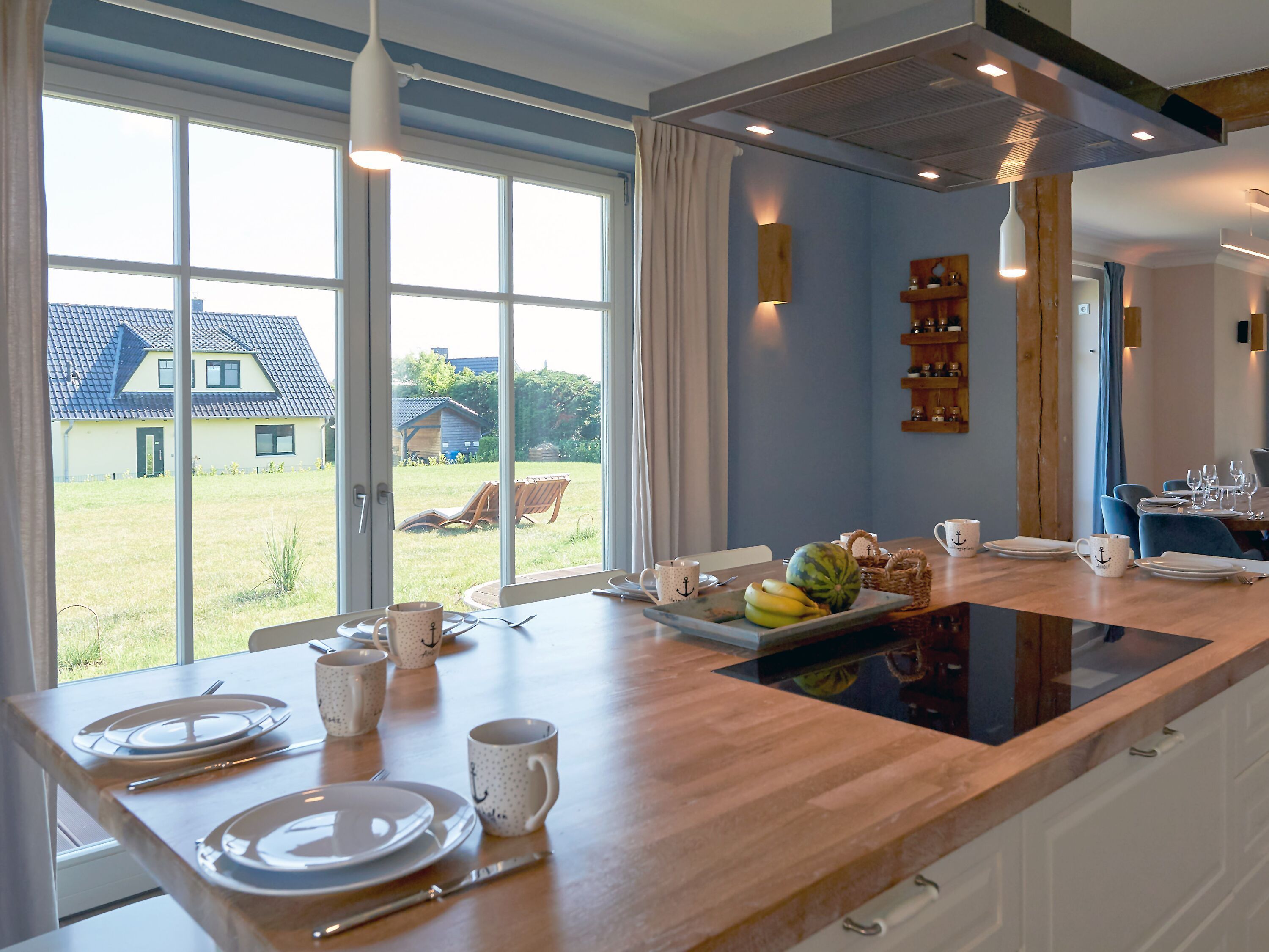 Im Obergeschoss lädt übrigens auch der zweite Wohnbereich - der Raum Boddenblick - zu gemütlichen Stunden ein, sei es nun beim gemeinsamen Pläneschmieden, bei einem Gesellschaftsspiel oder einfach beim Genießen des herrlichen Ausblicks auf den Bodden sowie das umliegende Biosphärenreservat.