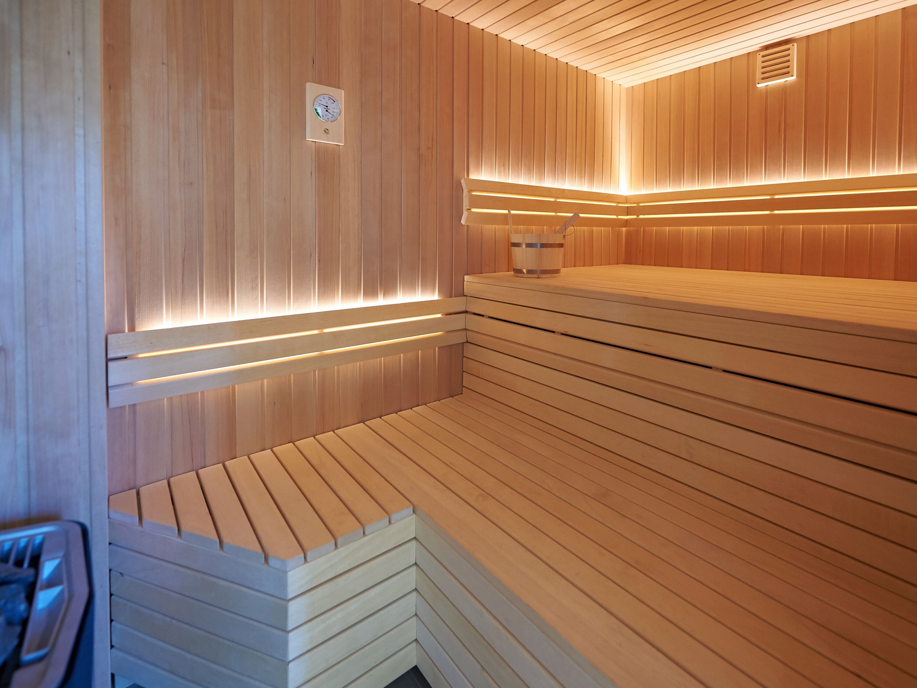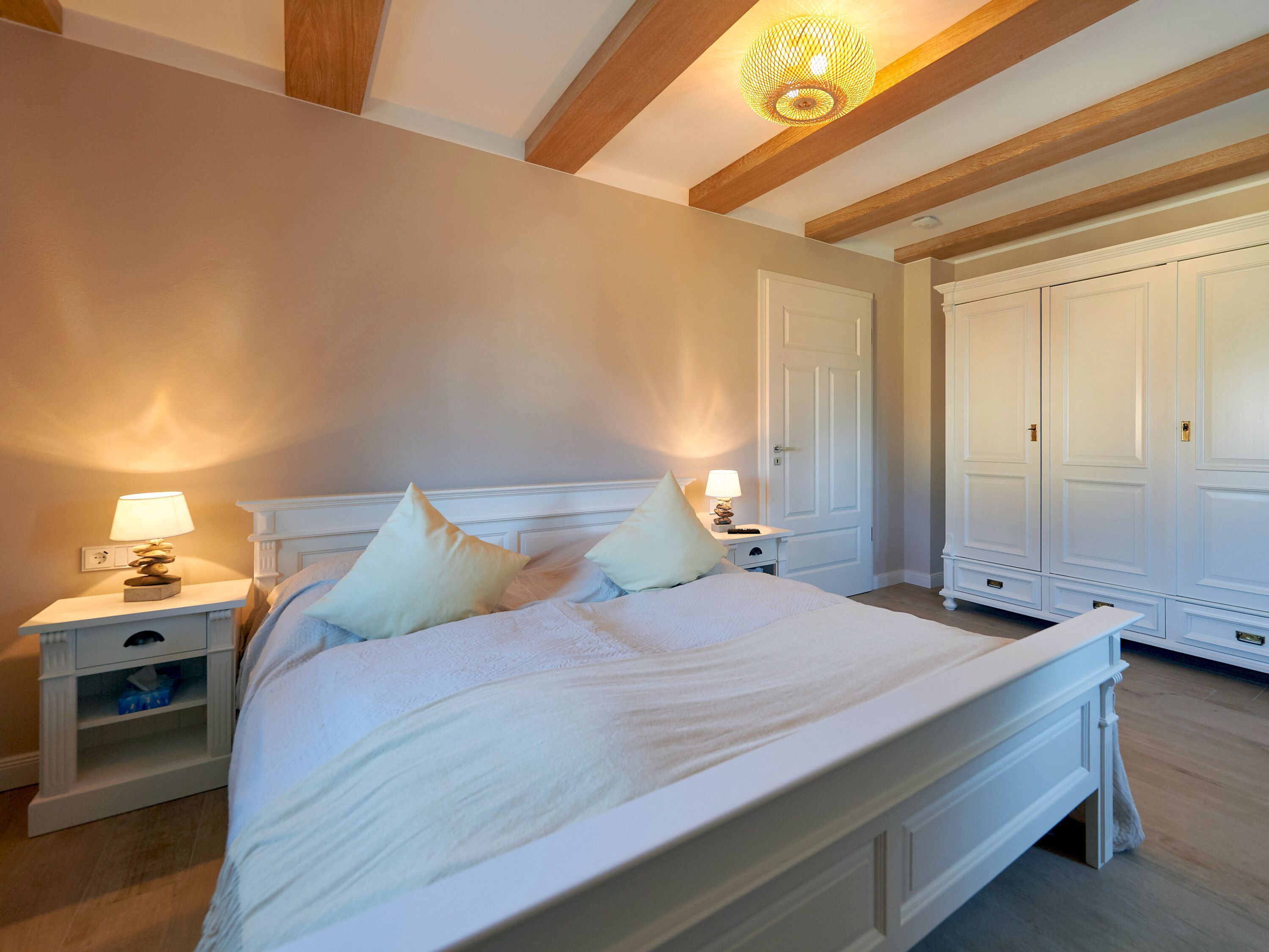 Barrierefrei zu erreichen, befindet sich im Erdgeschoss eines der insgesamt vier Schlafzimmer. Es verfügt über ein bequemes Doppelbett, das in zwei Einzelbetten getrennt werden kann, und einen eigenen Fernseher. An dieses Schlafzimmer grenzt eines der beiden im Erdgeschoss gelegenen Duschbäder. Das zweite Duschbad im EG ist mit der hauseigenen Sauna verbunden, in der Sie nach Herzenslust relaxen können.