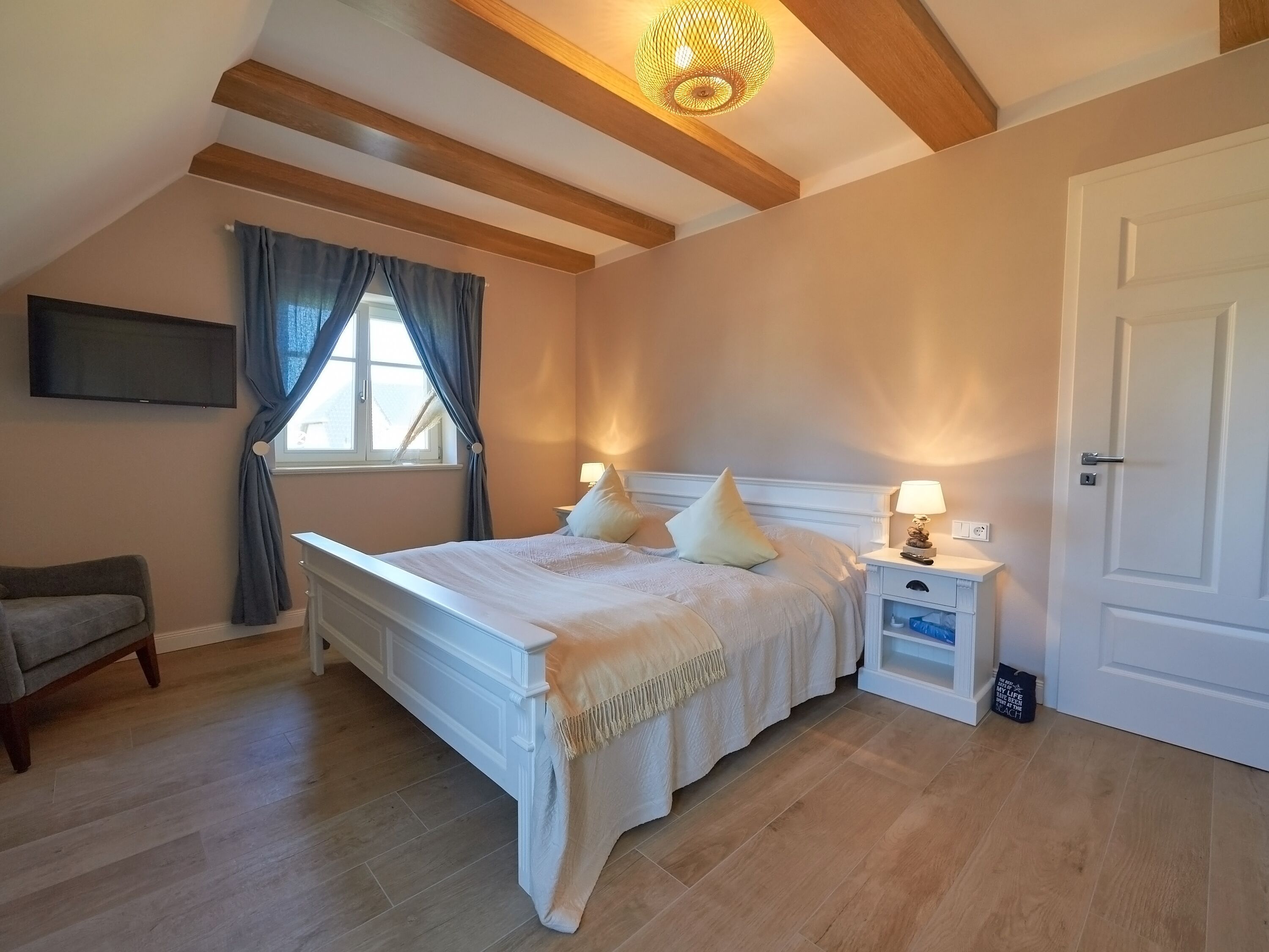 Im Obergeschoss des Hauses erwarten Sie weitere drei gleich große Schlafzimmer, ebenfalls jeweils mit eigenem TV. Alle Schlafzimmer verfügen über ein bequemes Doppelbett (180 x 200 cm). Auf dieser Ebene befindet sich auch ein weiteres geräumiges Badezimmer mit Dusche, Badewanne, WC und Fön.