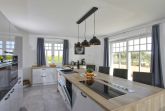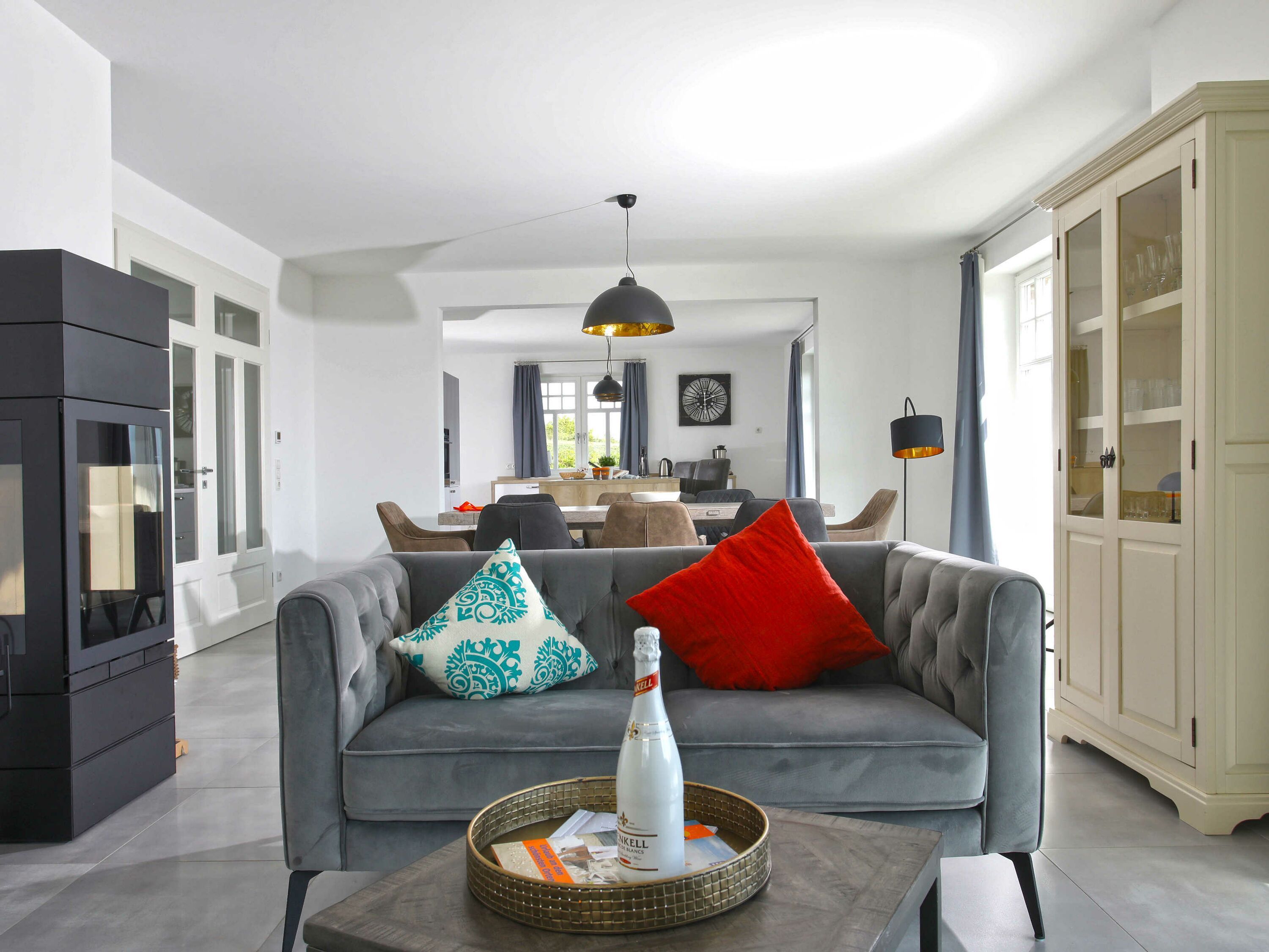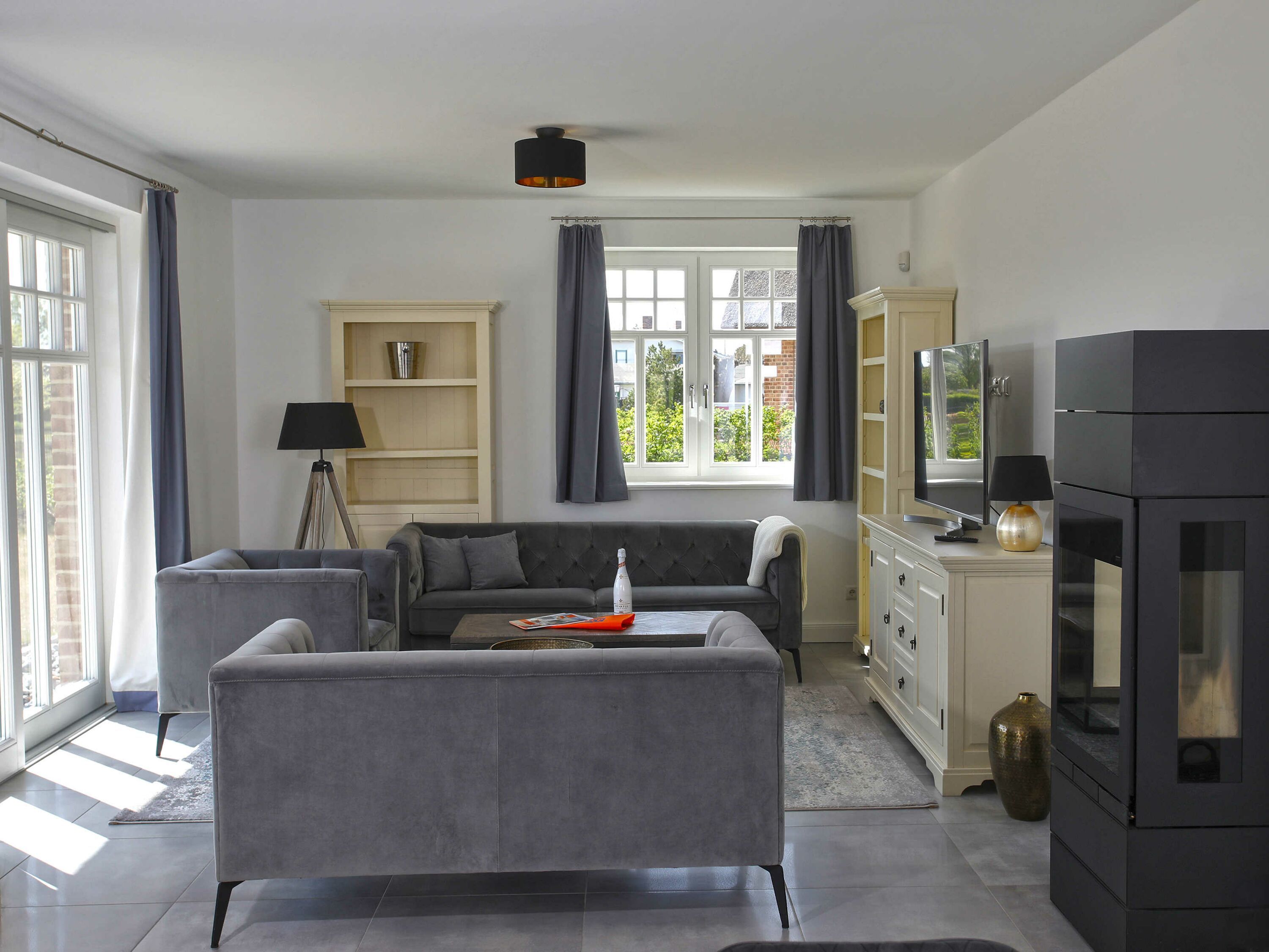 Der lichtdurchflutete Wohn- und Essbereich mit Meerblick befindet sich im Erdgeschoss. Das Wohnzimmer ist mit gemütlichen Sofas und einem LED-HD-TV ausgestattet. Wann immer Sie möchten, verbreitet der Kamin eine besonders behagliche Atmosphäre. Die große integrierte Küchenzeile mit einem Backofen, einer Mikrowelle, einem Geschirrspüler, einem großen Kühlschrank mit Gefrierfach, einer Kaffeemaschine, Toaster, Wasserkocher und diversen Kleininventar lässt das Herz jeden Hobbykochs höher schlagen. Eine freistehende Kochinsel mit Sitzmöglichkeit rundet das Wohnküchenflair ab.