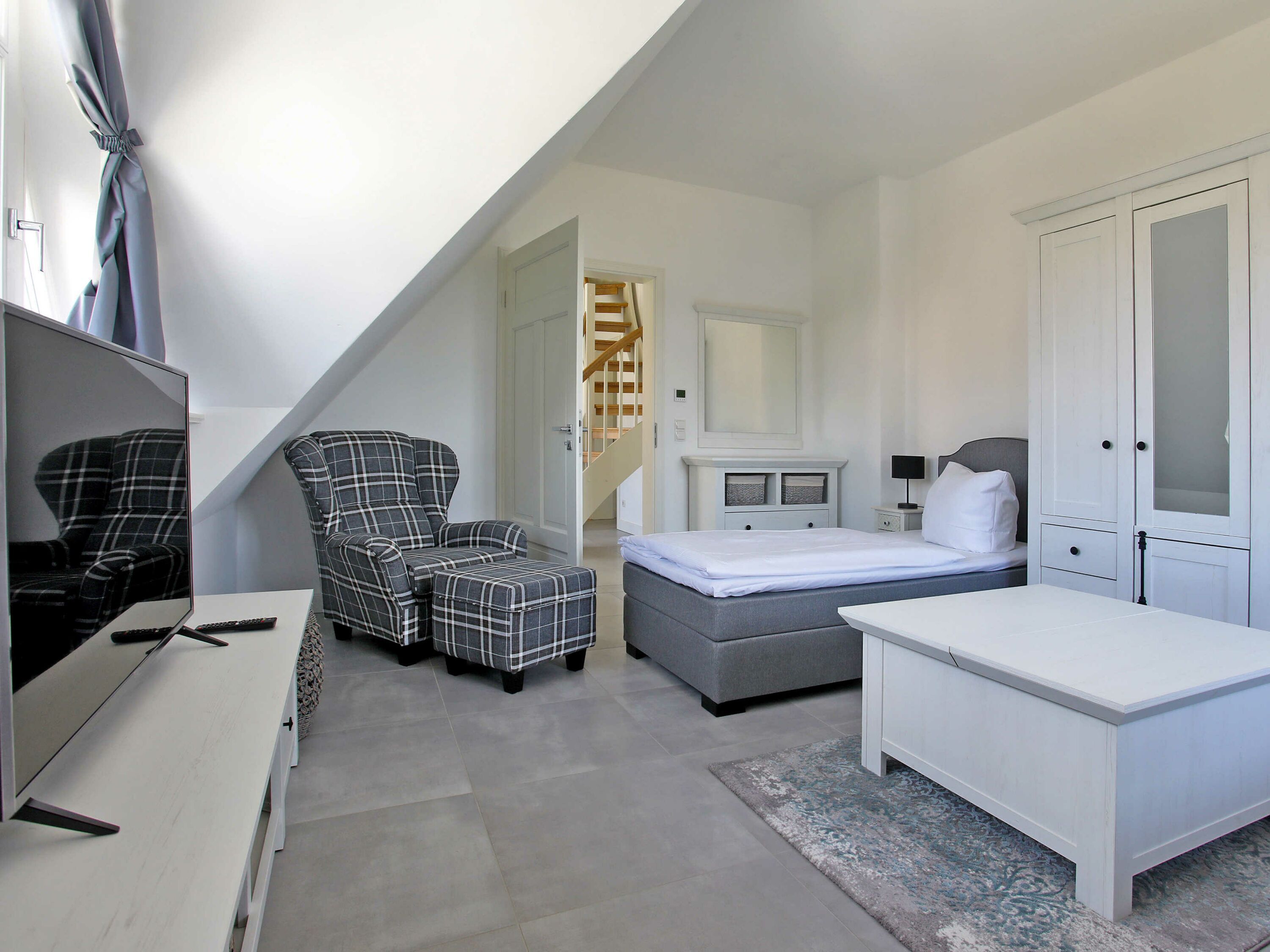 Über eine Treppe gelangen Sie in das außergewöhnlich schöne Obergeschoss. Hier erwarten Sie drei Schlafzimmer - zwei davon mit einem Doppelbett (Box-Spring-Betten mit durchgehendem Topper) der Größe 180 x 200 cm sowie einem eigenen TV. Die beiden Schlafzimmer mit den Doppelbetten haben einen direkten Zugang zum jeweiligen Bad inklusive Meerblick.