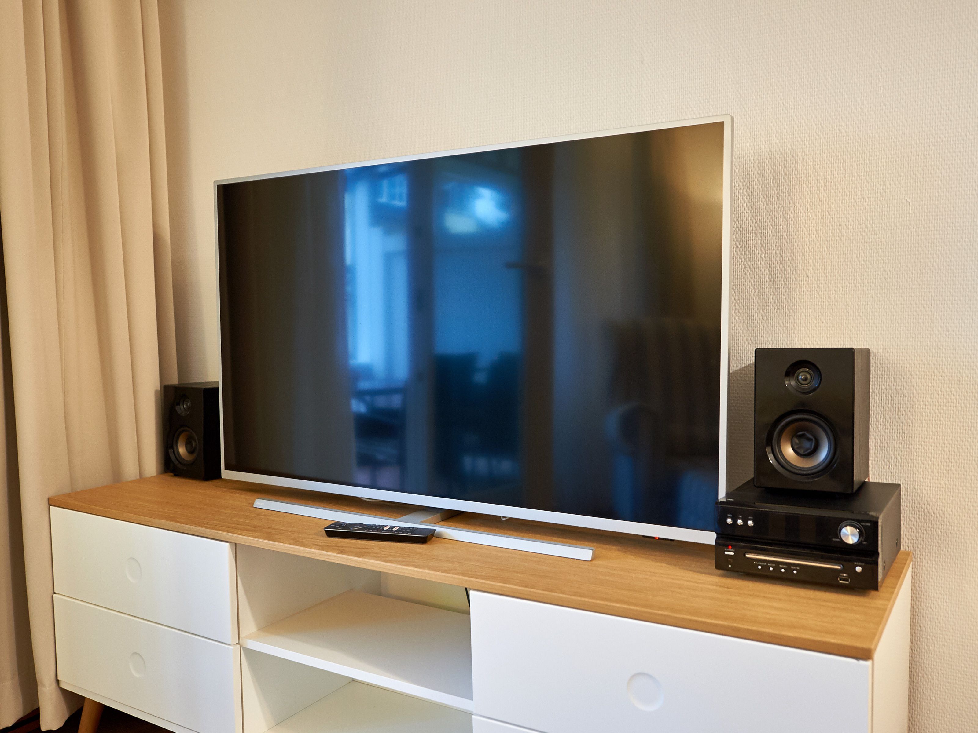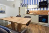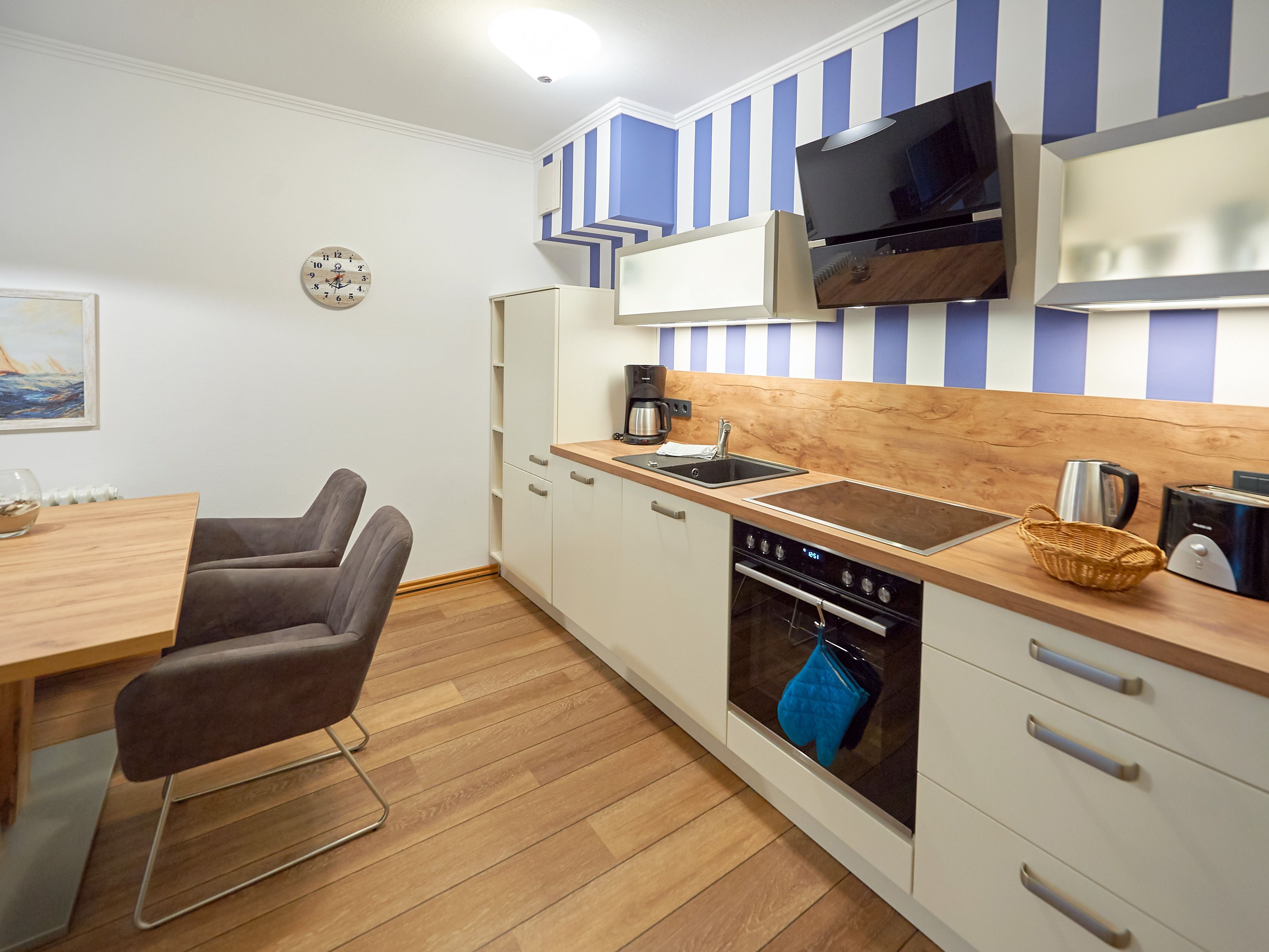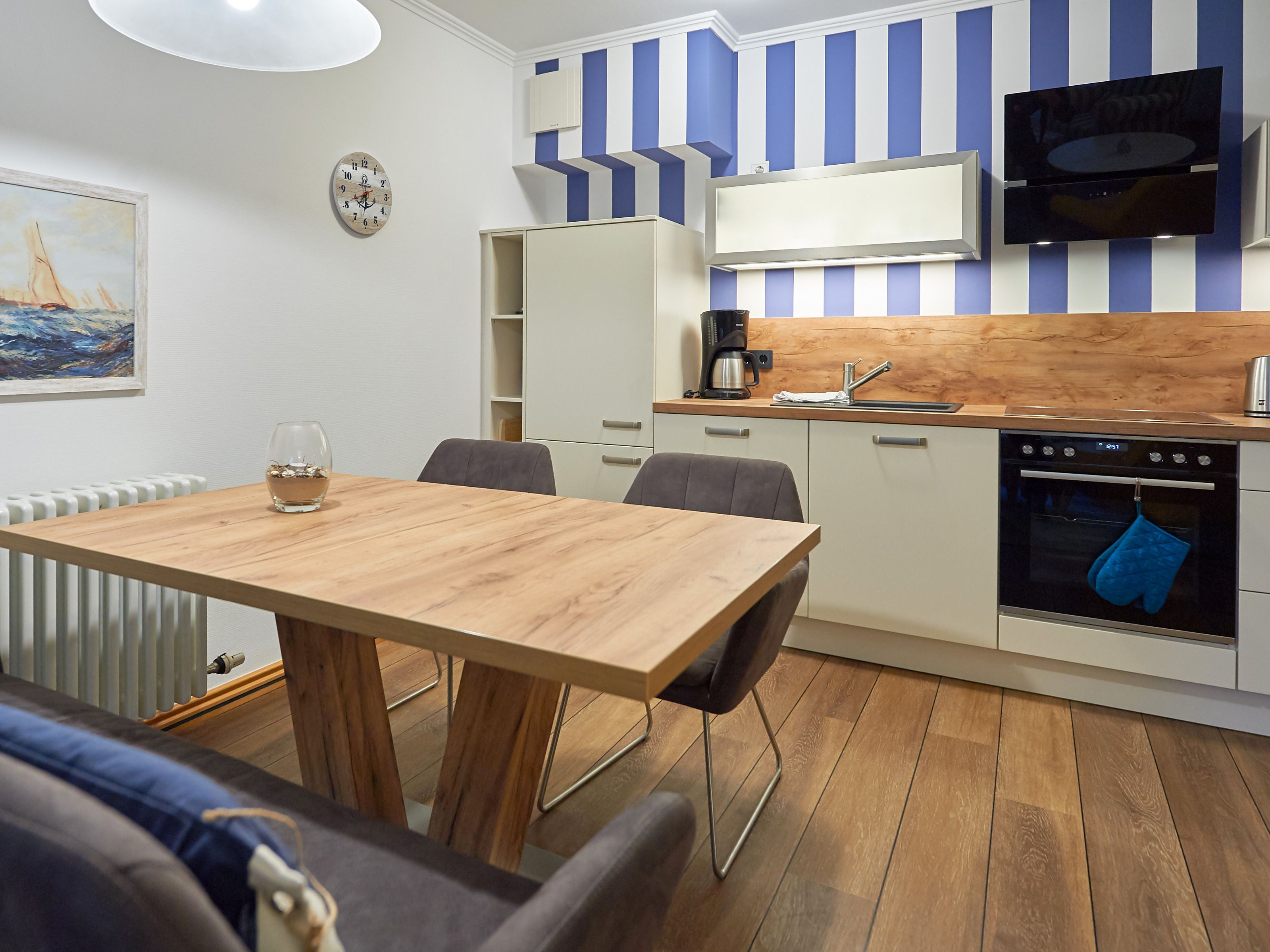 Ihr Urlaubsdomizil empfängt Sie ganz zünftig maritim mit vielen hübschen Details, die die Eigentümer sorgsam ausgesucht haben. Das kombinierte Wohn- und Esszimmer kommt in angenehm warmen Farben daher und lässt keinen Komfort vermissen. Ein großer SMART-TV nebst DVD-Player und kostenfreiem W-LAN sorgen für Unterhaltung, während man es sich auf der gemütlichen Couch oder dem Relaxsessel gut gehen lässt. Die Couch lässt sich bei Bedarf übrigens in eine Schlafgelegenheit für zwei Personen verwandeln.